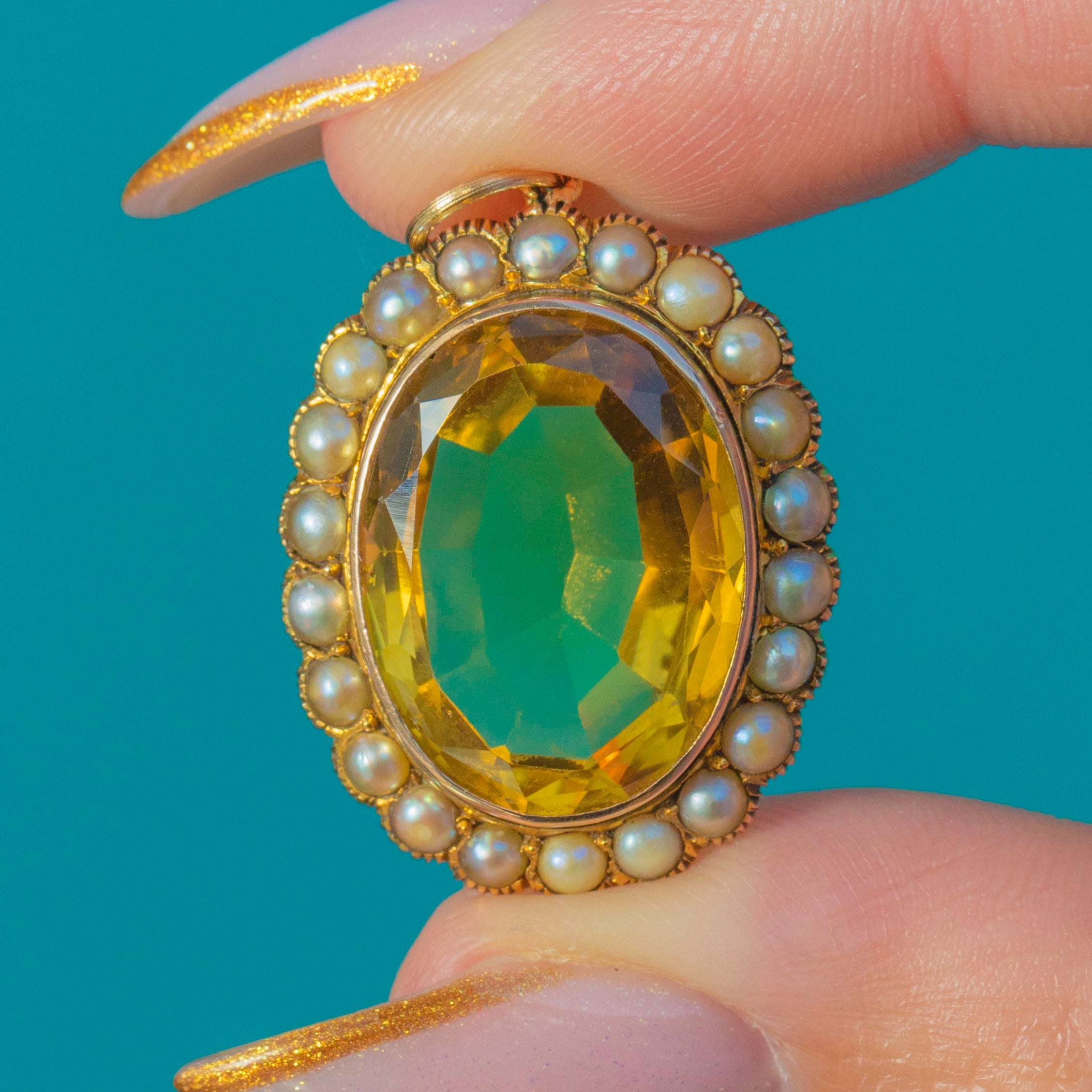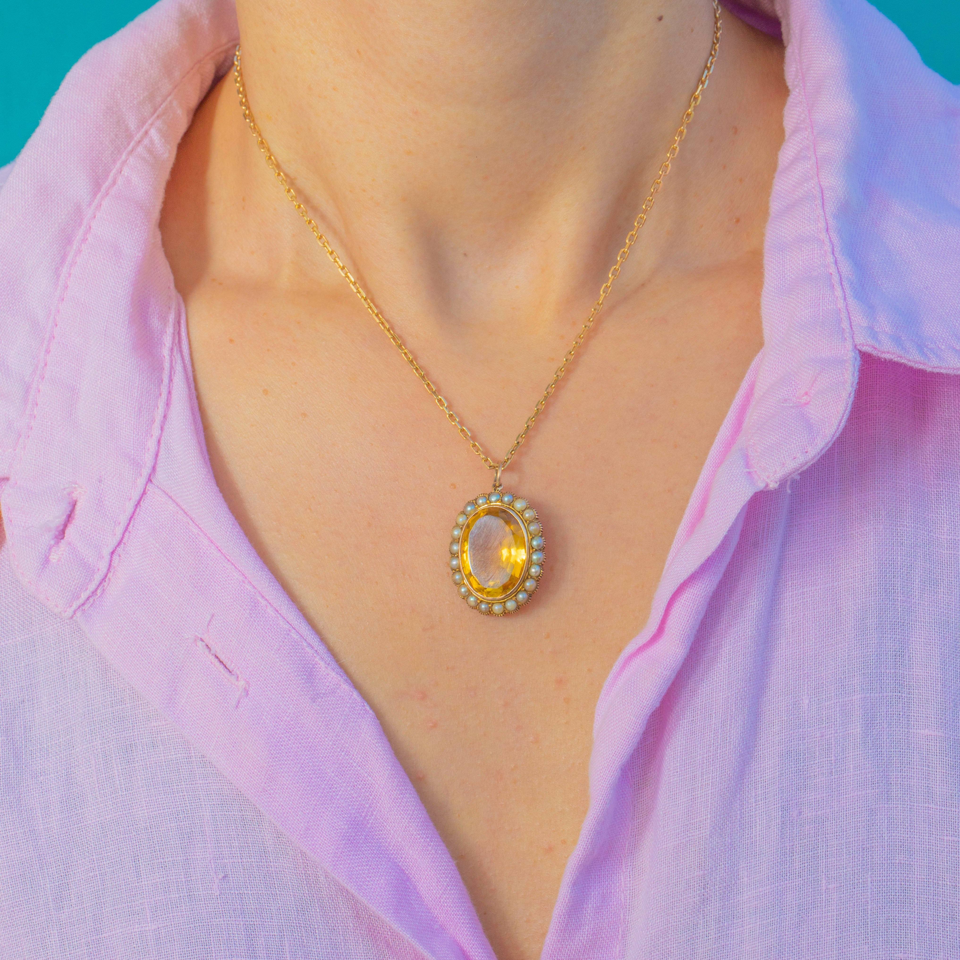 This gorgeous antique pendant centres on a rich golden Citrine in a classic oval cut, surrounded by a sweet halo of creamy Pearls. The 10.40ct Citrine is beautifully proportioned and full of life, creating a wonderfully luxurious look on the neckline.