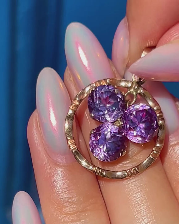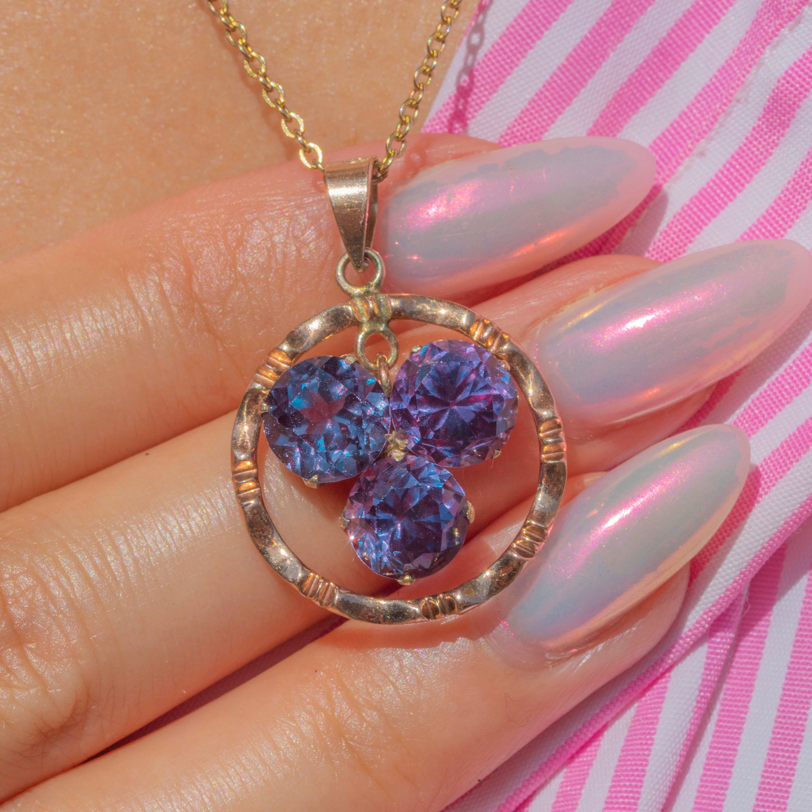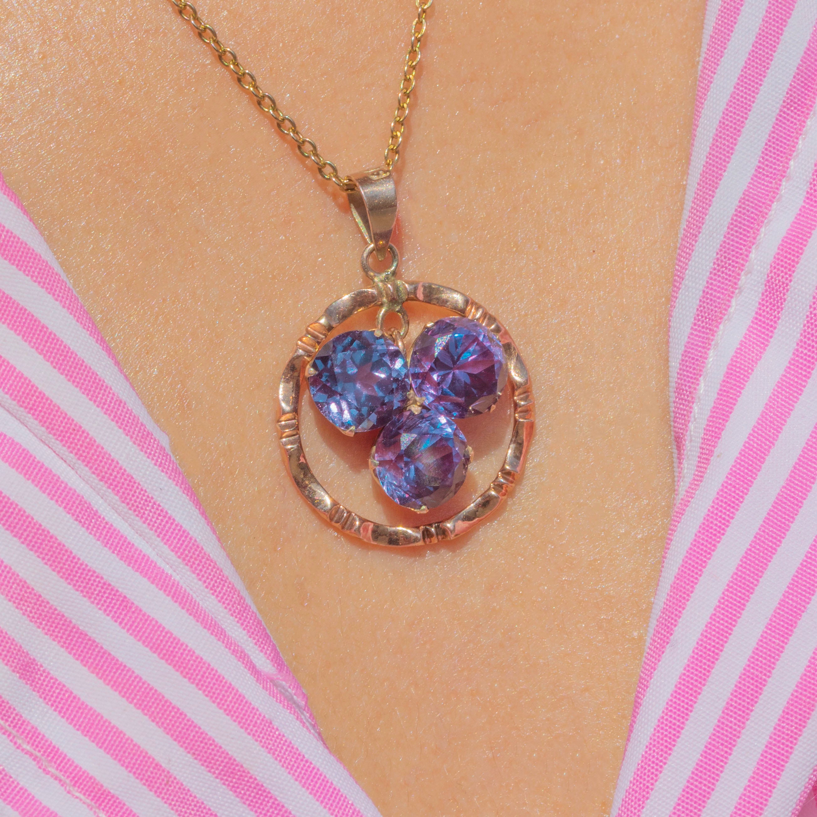 This Edwardian shamrock pendant suspends three resplendent colour-changing synthetic Sapphires, boasting 7.30ct combined. Each faceted Sapphire is a saturated blue-purple that transforms into a gorgeous teal as it catches the light.