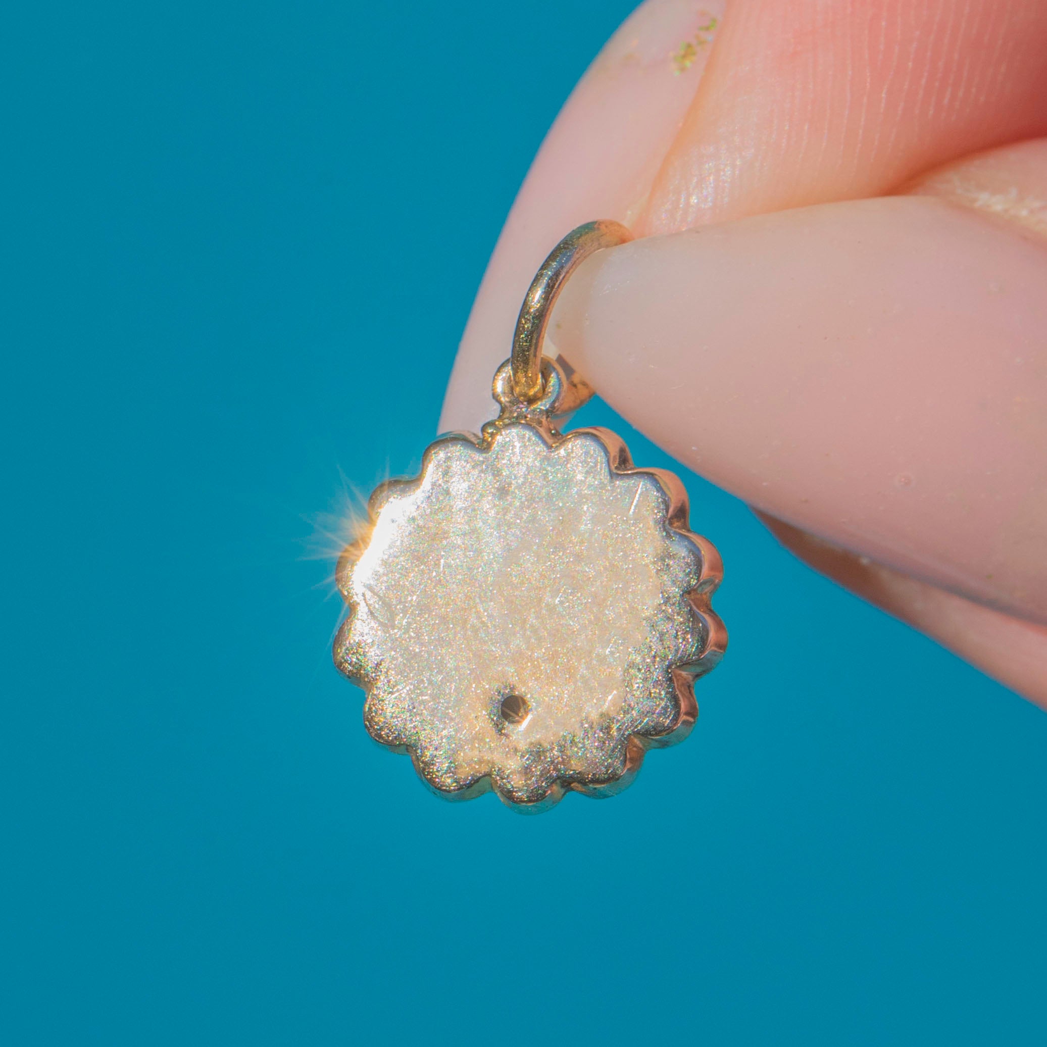 The combination of creamy Pearls and warm coral creates a gentle contrast, while the scalloped gold frame adds a touch of detail and dimension. Dainty yet full of character, this piece would look wonderful worn on a chain or as part of a curated charm bracelet.