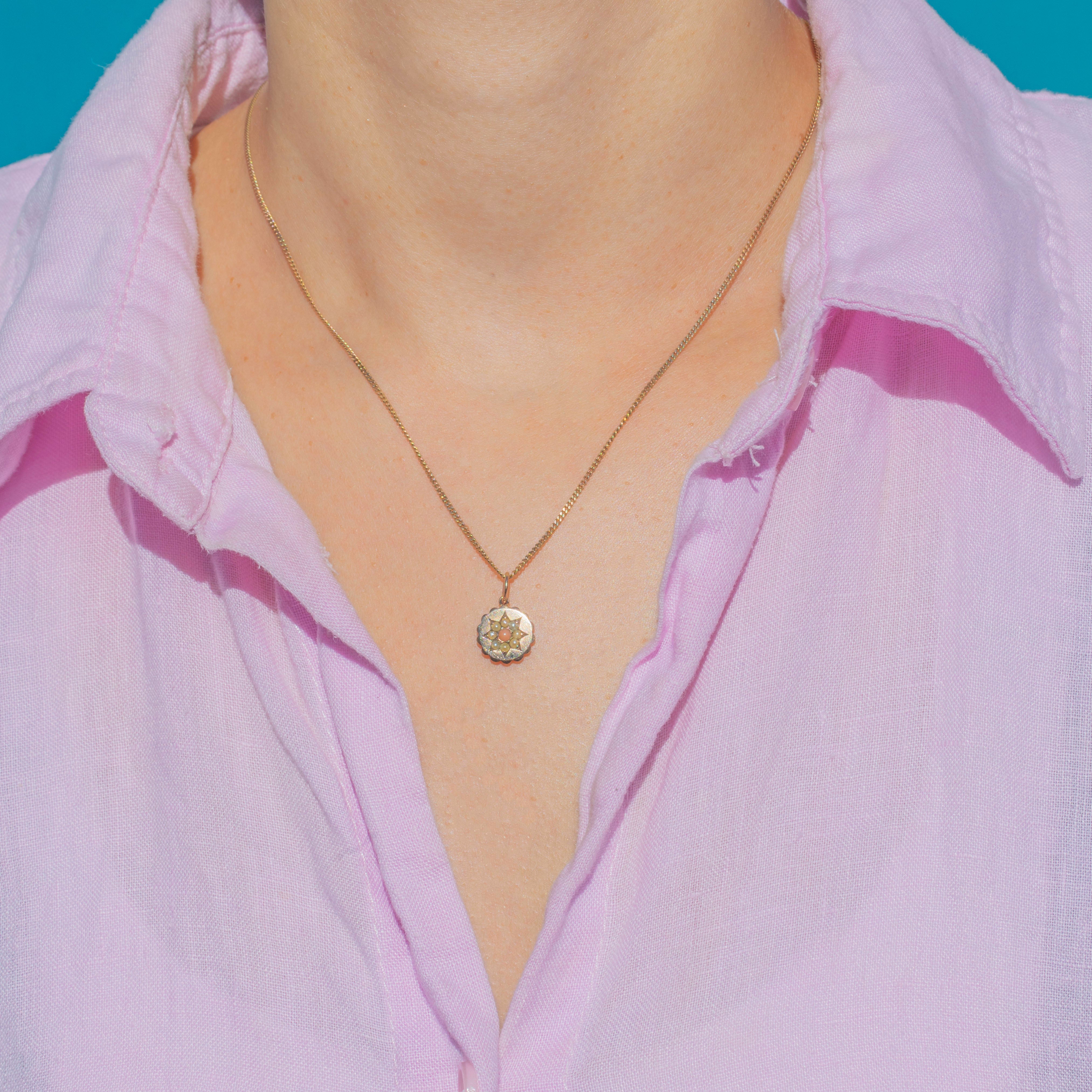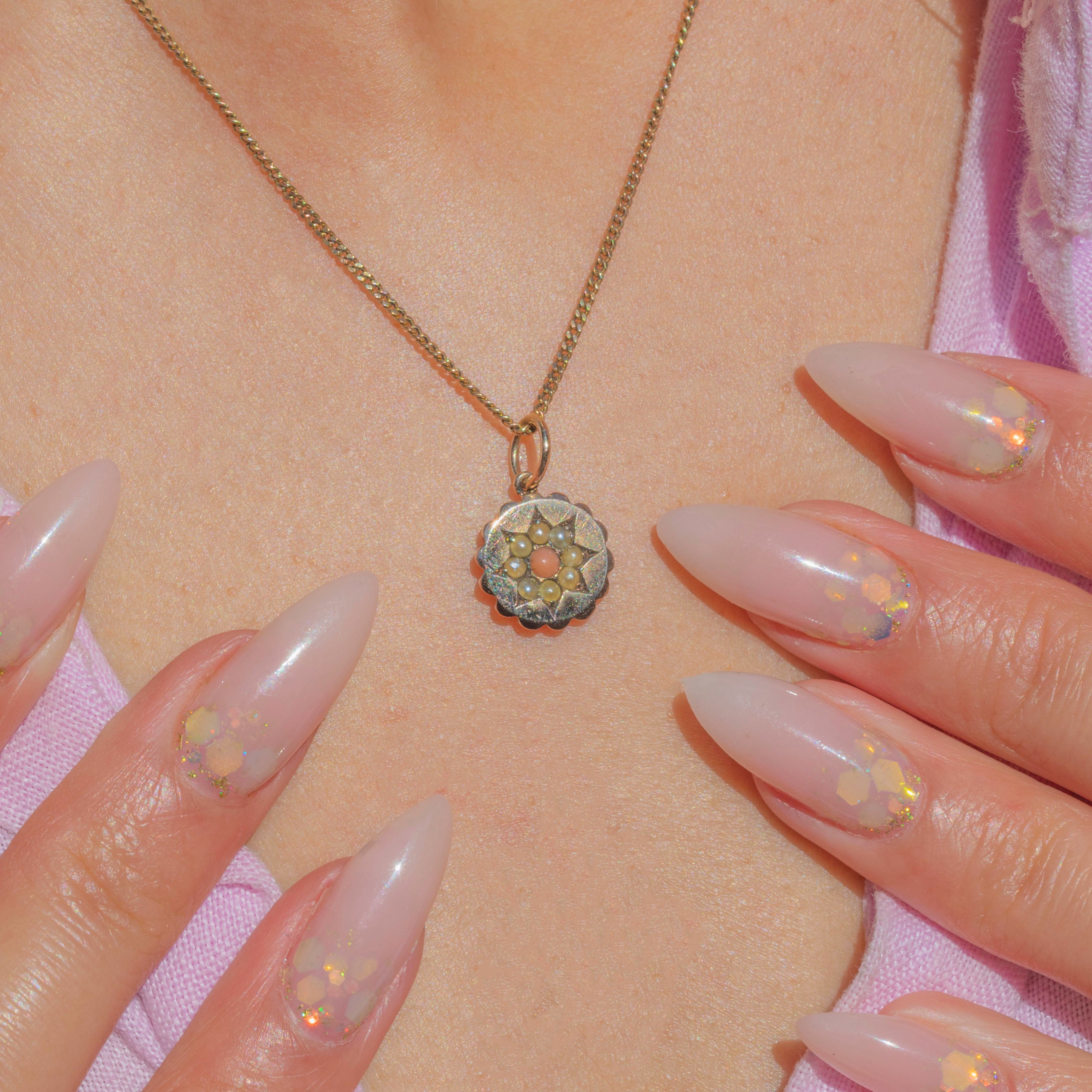 Circa 1870, this sweet antique charm is crafted in 9ct Gold, set with a delicate arrangement of Pearls surrounding a single coral cabochon centre. The design forms a charming flower motif, a style much loved in the Victorian era.