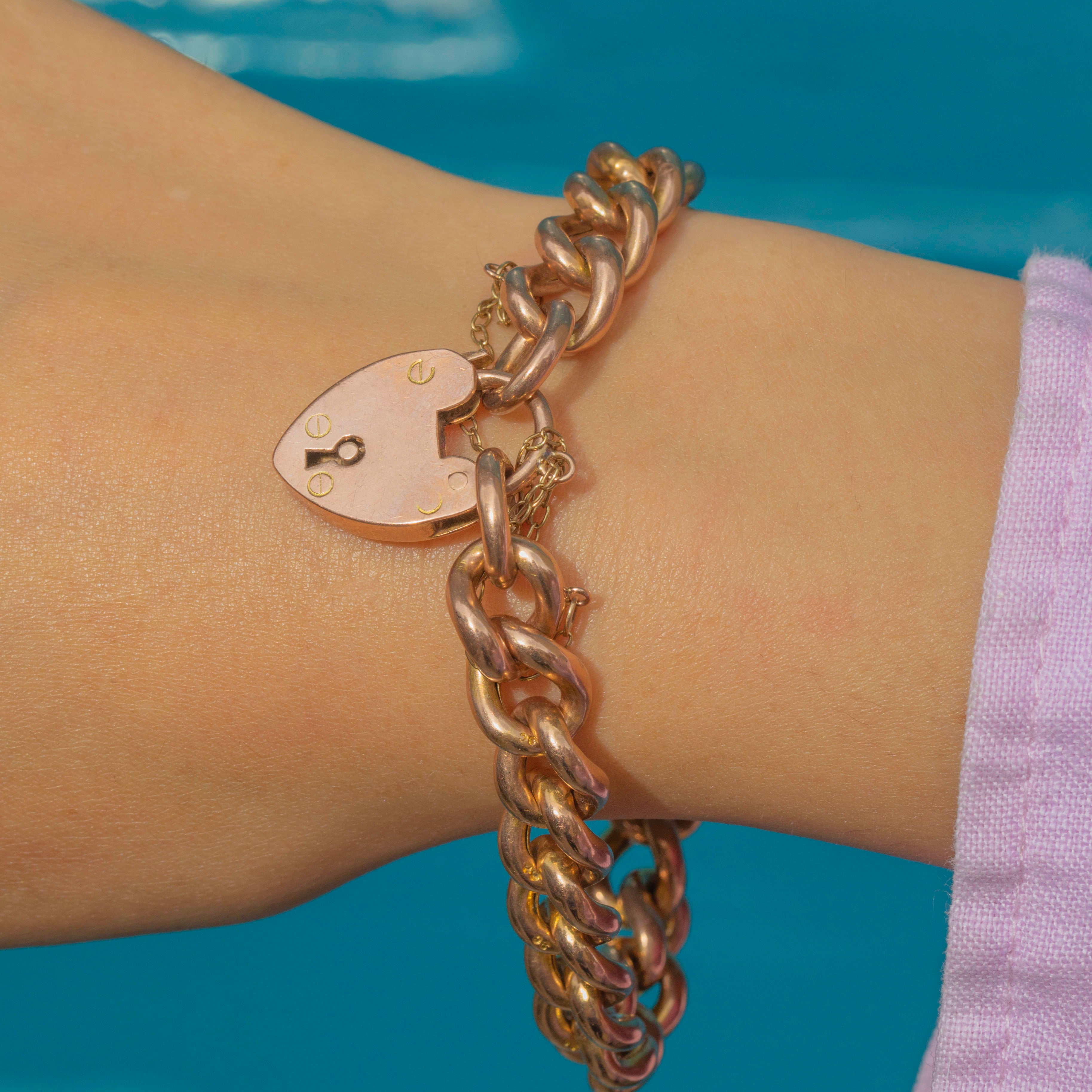 This antique Victorian bracelet is crafted in solid 9ct Gold, with classic puffy curb links and a traditional (working!) heart-shaped padlock clasp.