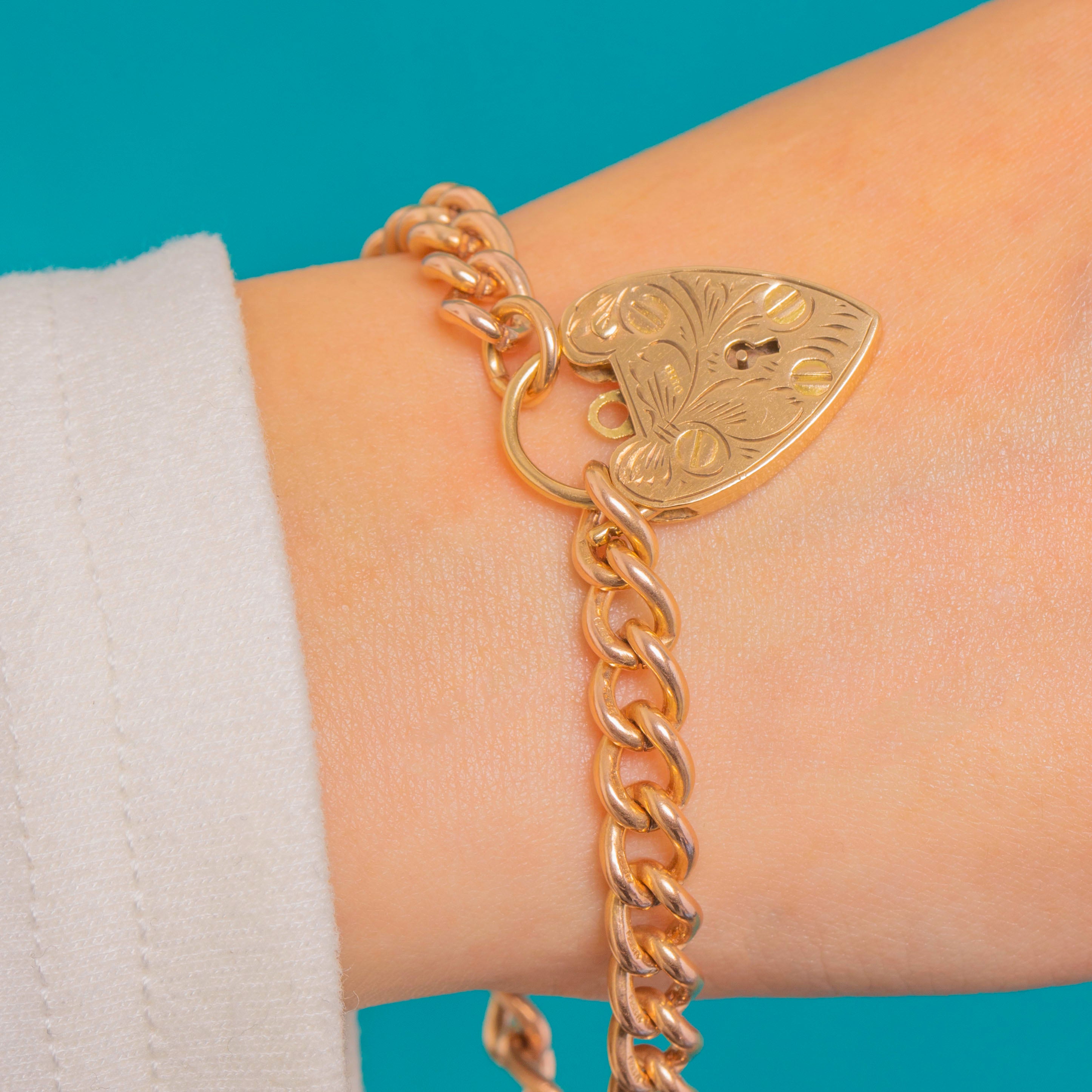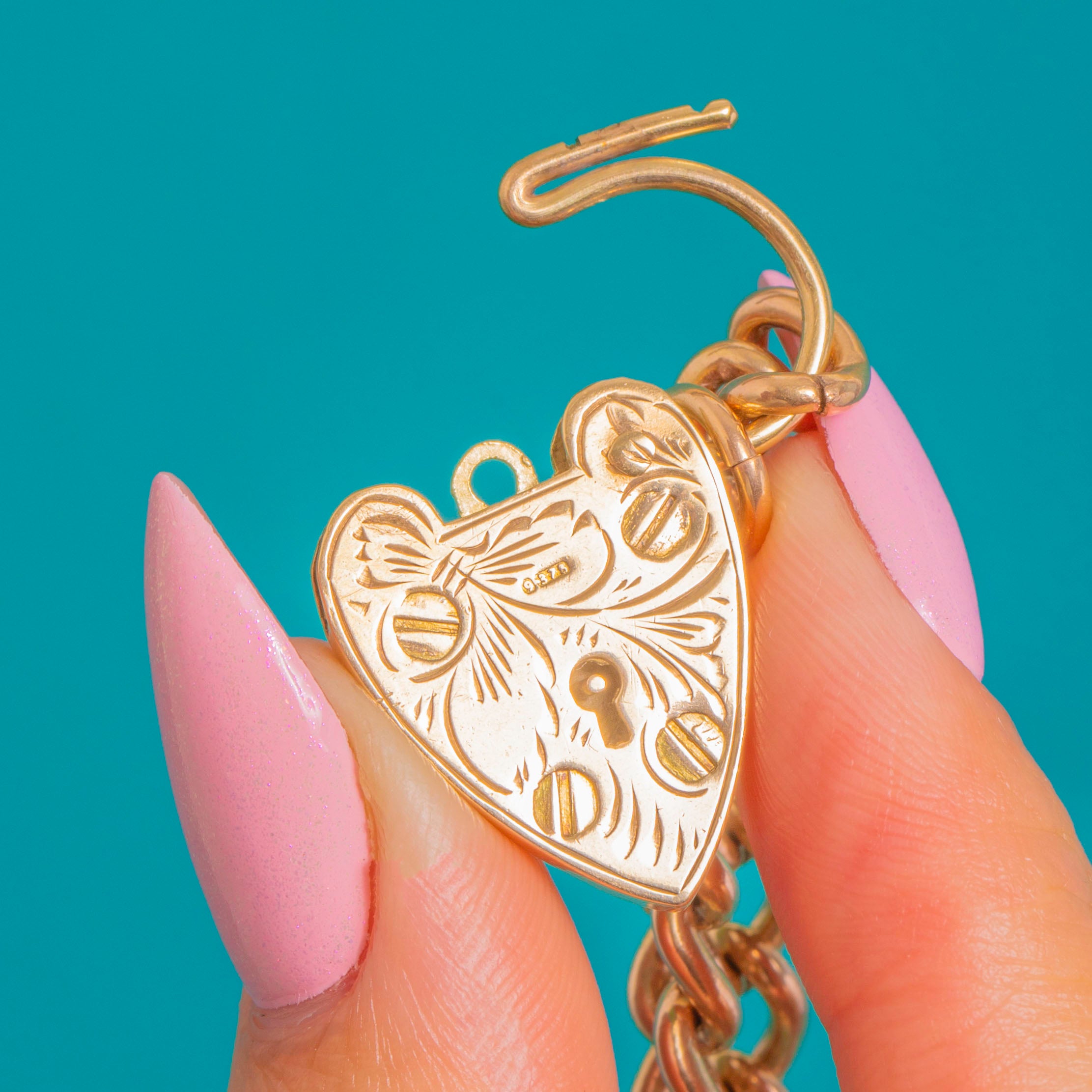 Antique 9ct Gold Curb Link Bracelet, Removable Engraved Heart Padlock