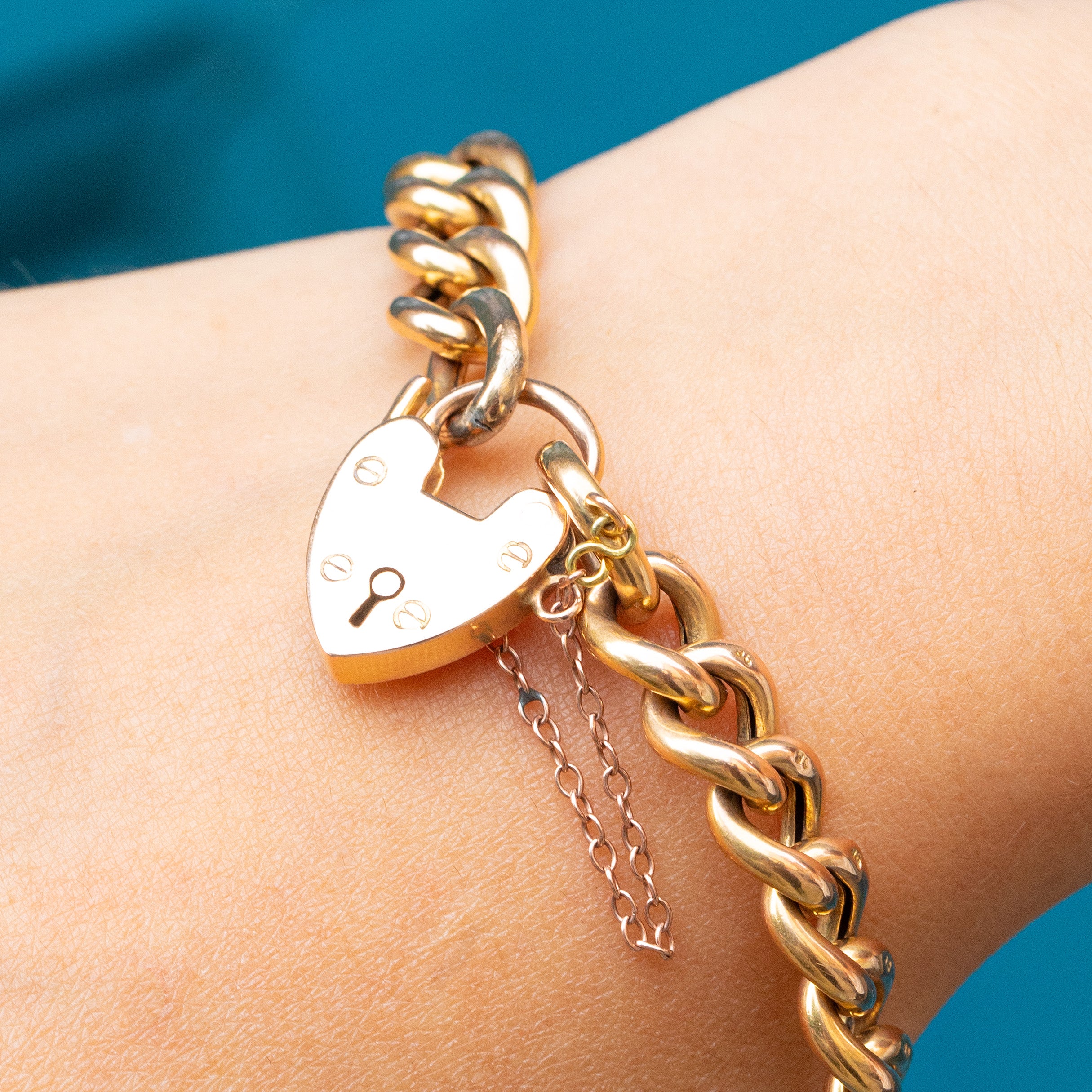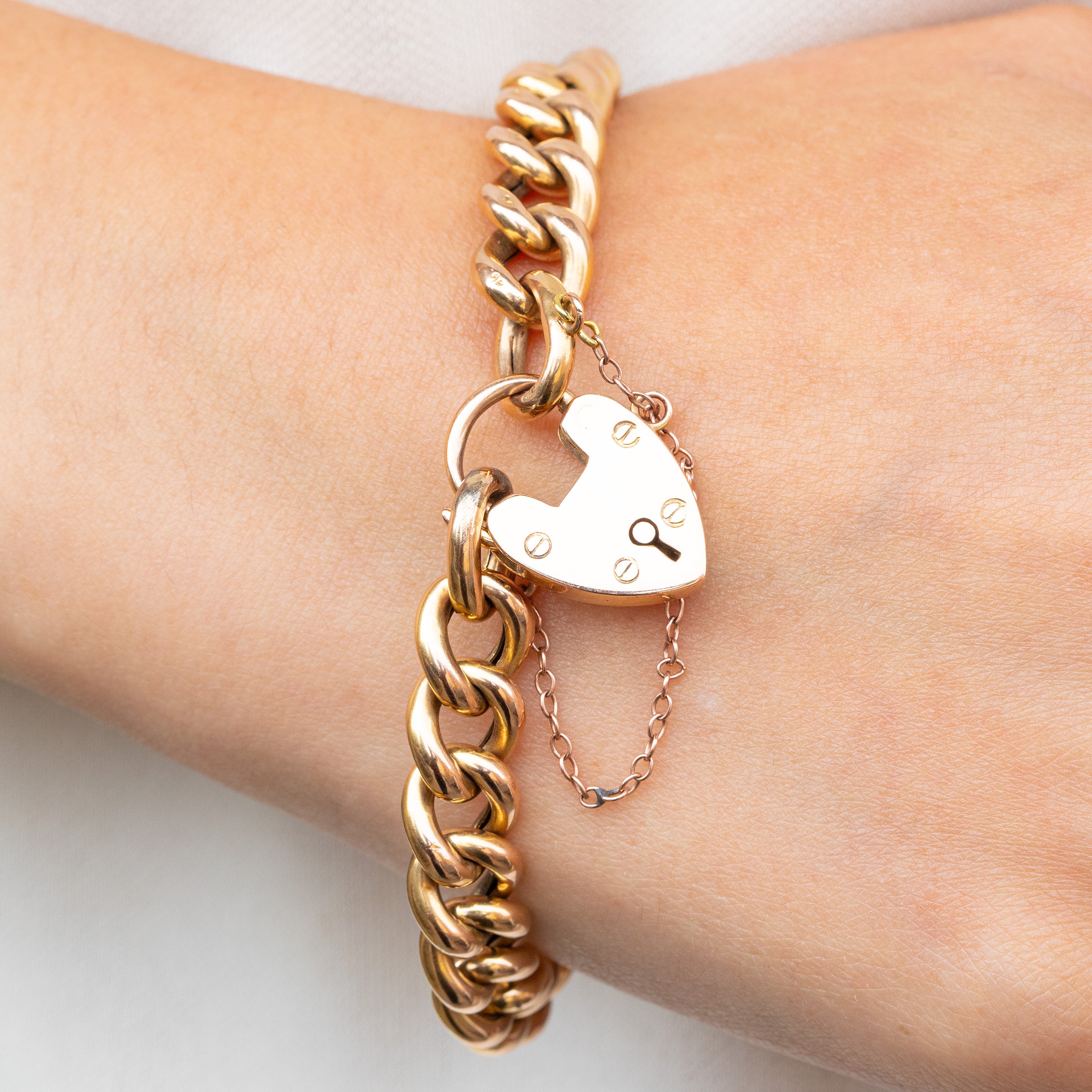 EXCELLENT: Each Gold curb link is uniform and secure, with some signs of wear near the clasp, which is difficult to spot while the bracelet is worn. The heart padlock is securely attached and with a safety chain for added security, you can wear this Victorian bracelet with utmost confidence.