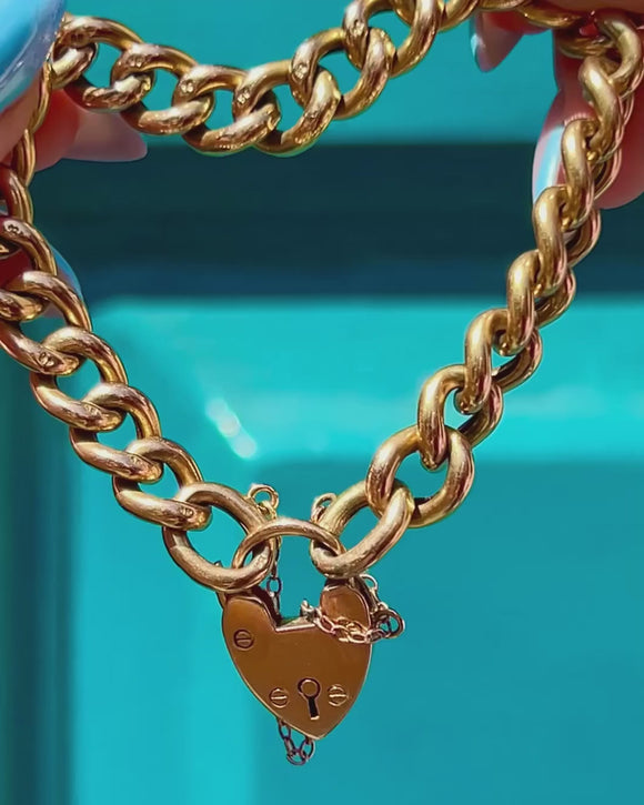 Antique 9ct Gold Curb Link Bracelet with Heart Padlock