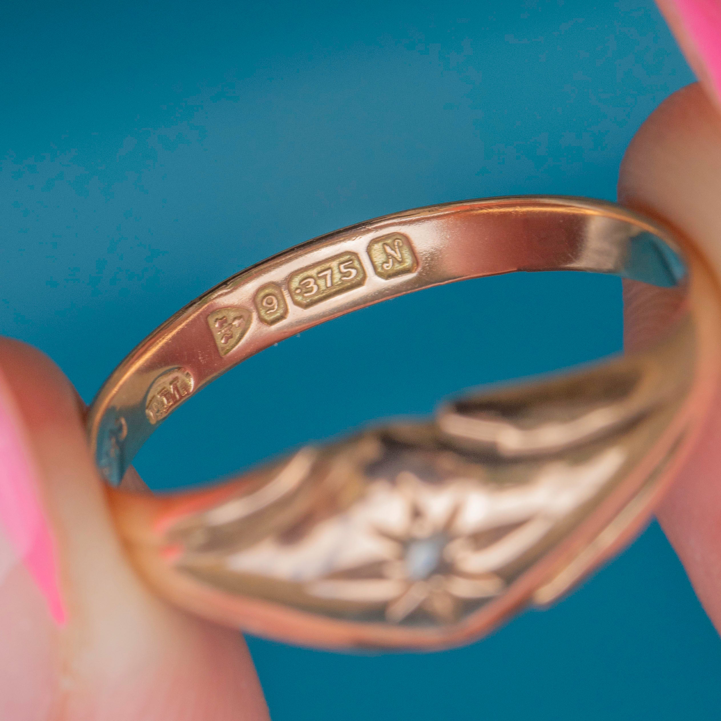 Complete with an intricately engraved star setting and a full set of hallmarks, including the rare Chester Assay, this 9ct Gold and Diamond gypsy ring will bring ample celestial charm to your attire.