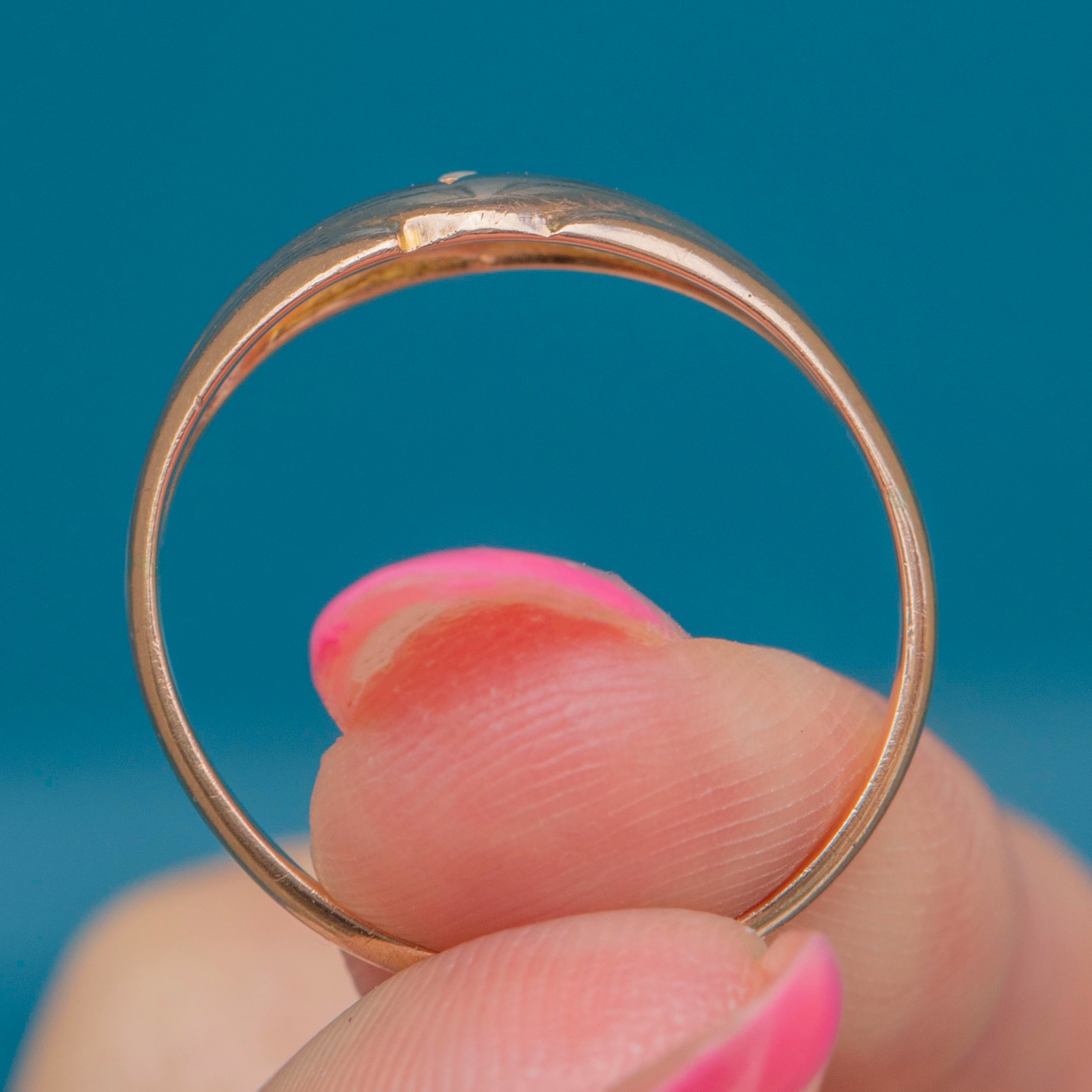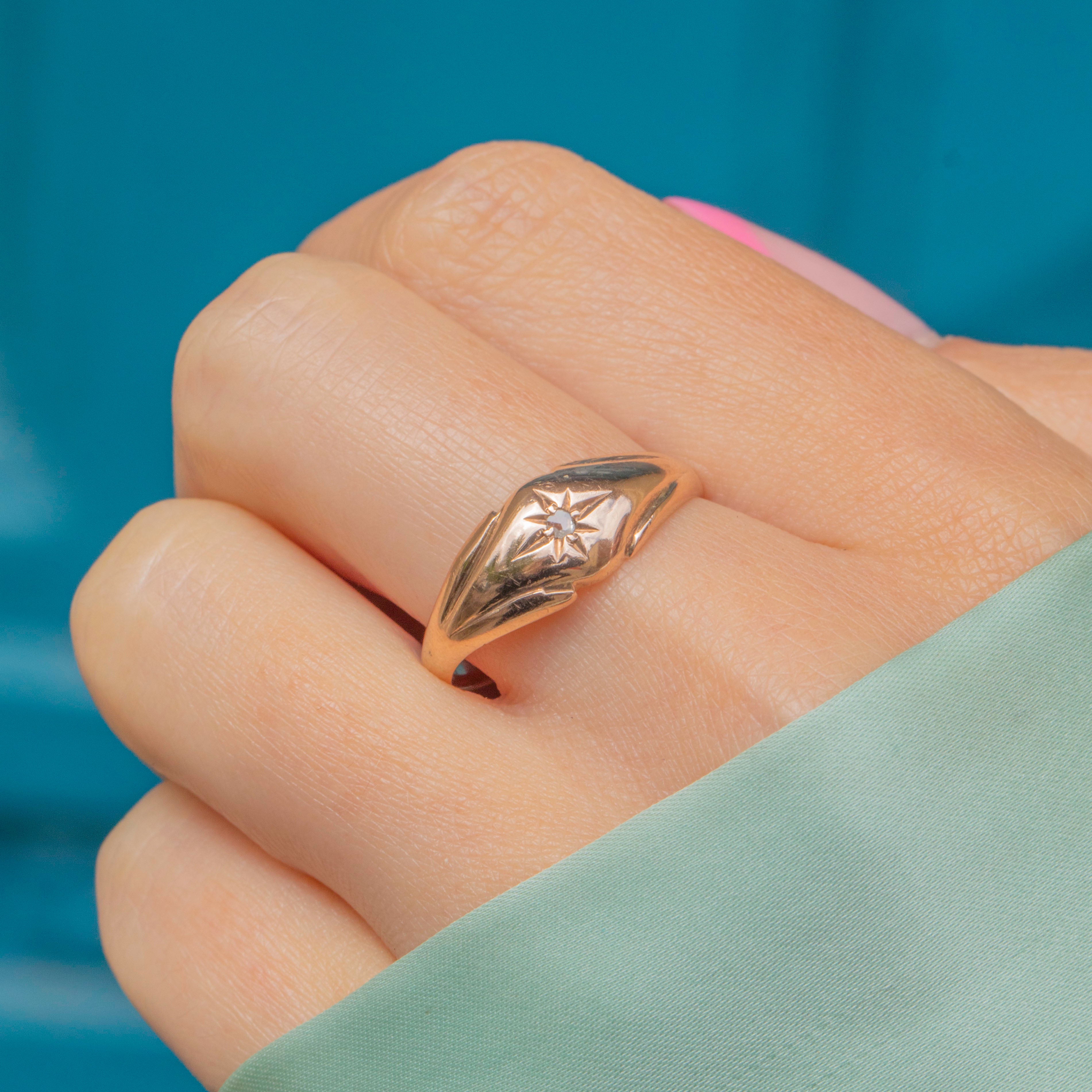 VERY GOOD: This 9ct Gold Diamond star set gypsy ring is in very good condition. She is an exemplar of antique craftsmanship and has retained a wonderful glossy sheen. There are some signs of surface wear to the Gold, including light scratches as well as evidence of a previous resize, though this is difficult to spot without a loupe. The band is not perfectly round, however, this does not affect the wearability of the ring. Her Diamond is securely set meaning you can wear this antique gypsy ring with confidence.