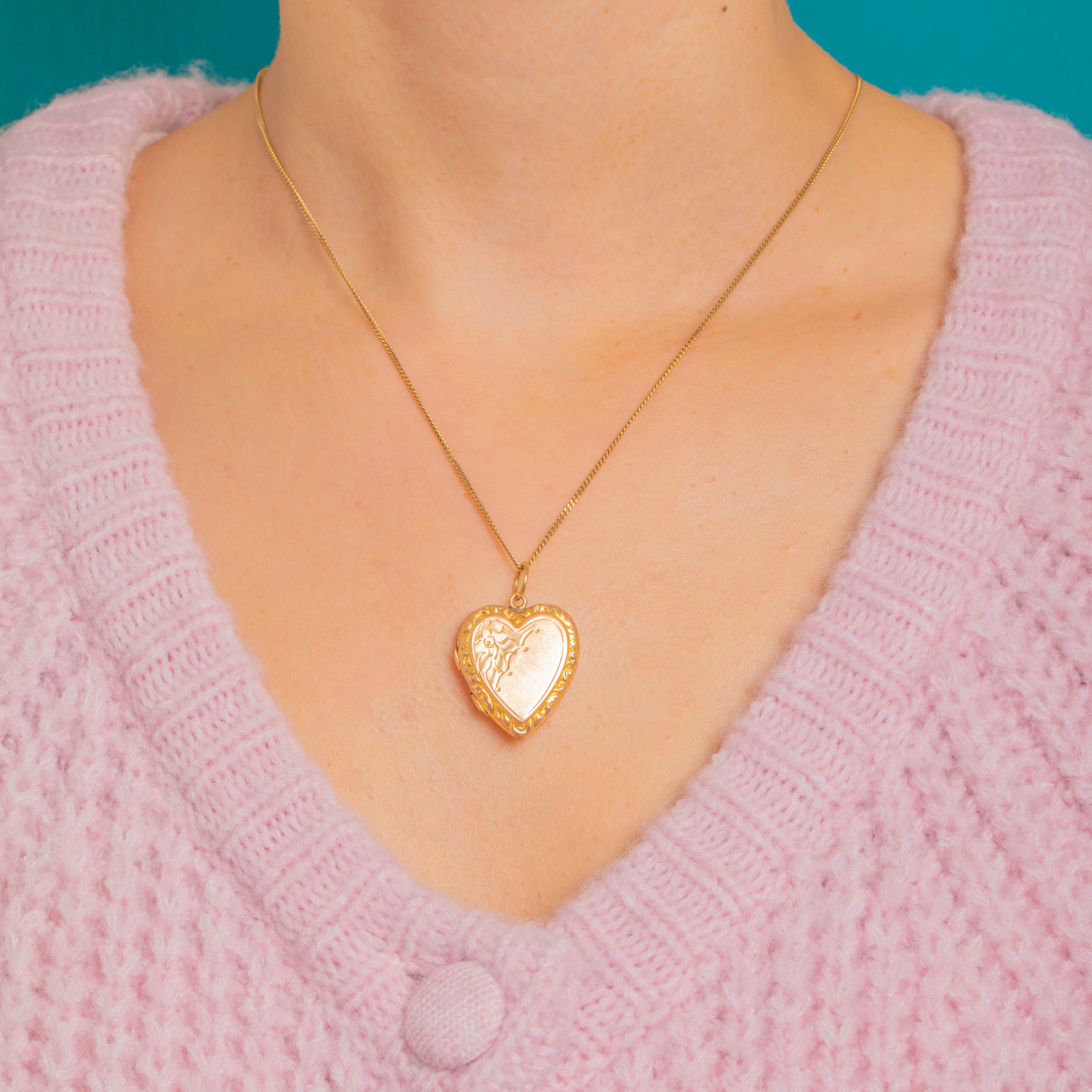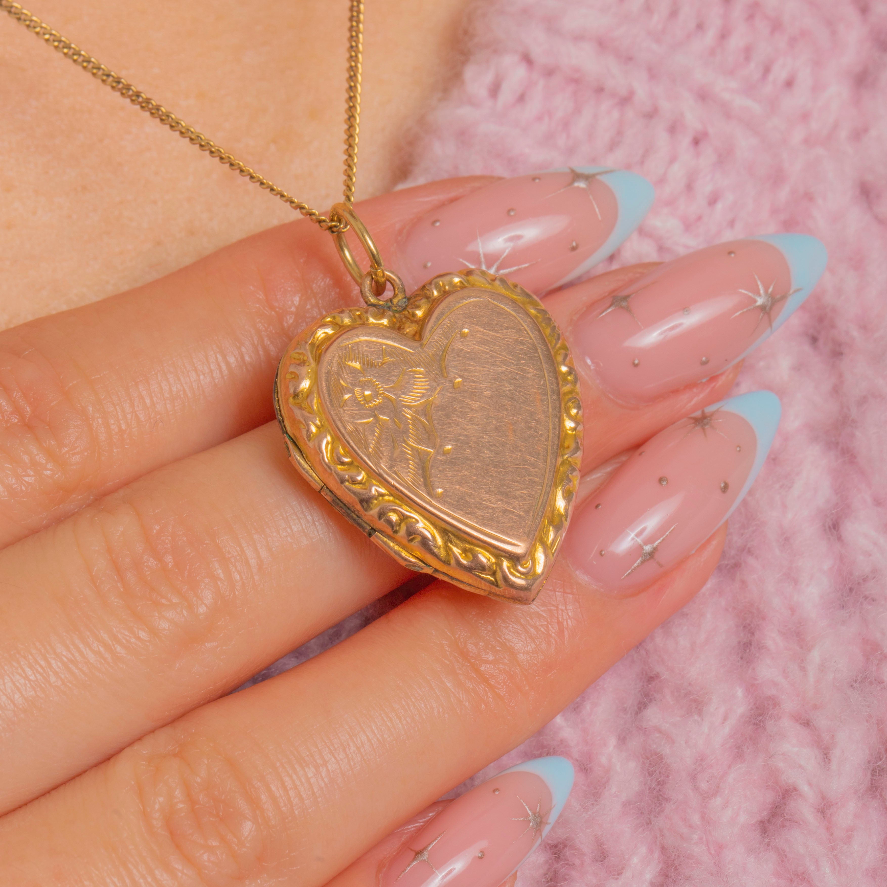 Petite, romantic and beautifully preserved, this Edwardian heart locket is crafted in 9ct Gold back & front with a traditional embossed and engraved design. The raised scrolling border catches the light with a soft glow, while the central heart offers a timeless canvas for personalisation—perfect for adding an initial or two.