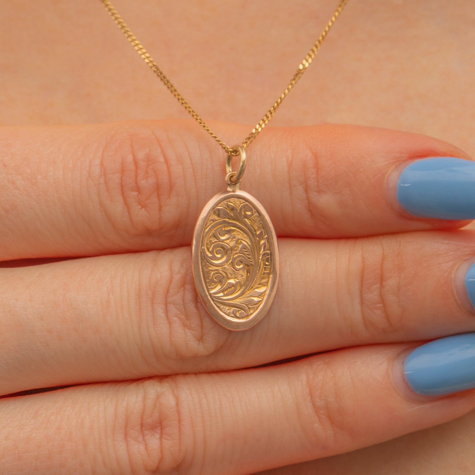 This gorgeously crafted antique 9ct Gold engraved disc pendant will make an enchanting addition to your everyday attire! Displaying ornate acanthus leaf details engraved into buttery 9ct Gold, this dainty treasure is the perfect piece to bring some antique luxury to your necklace stack.