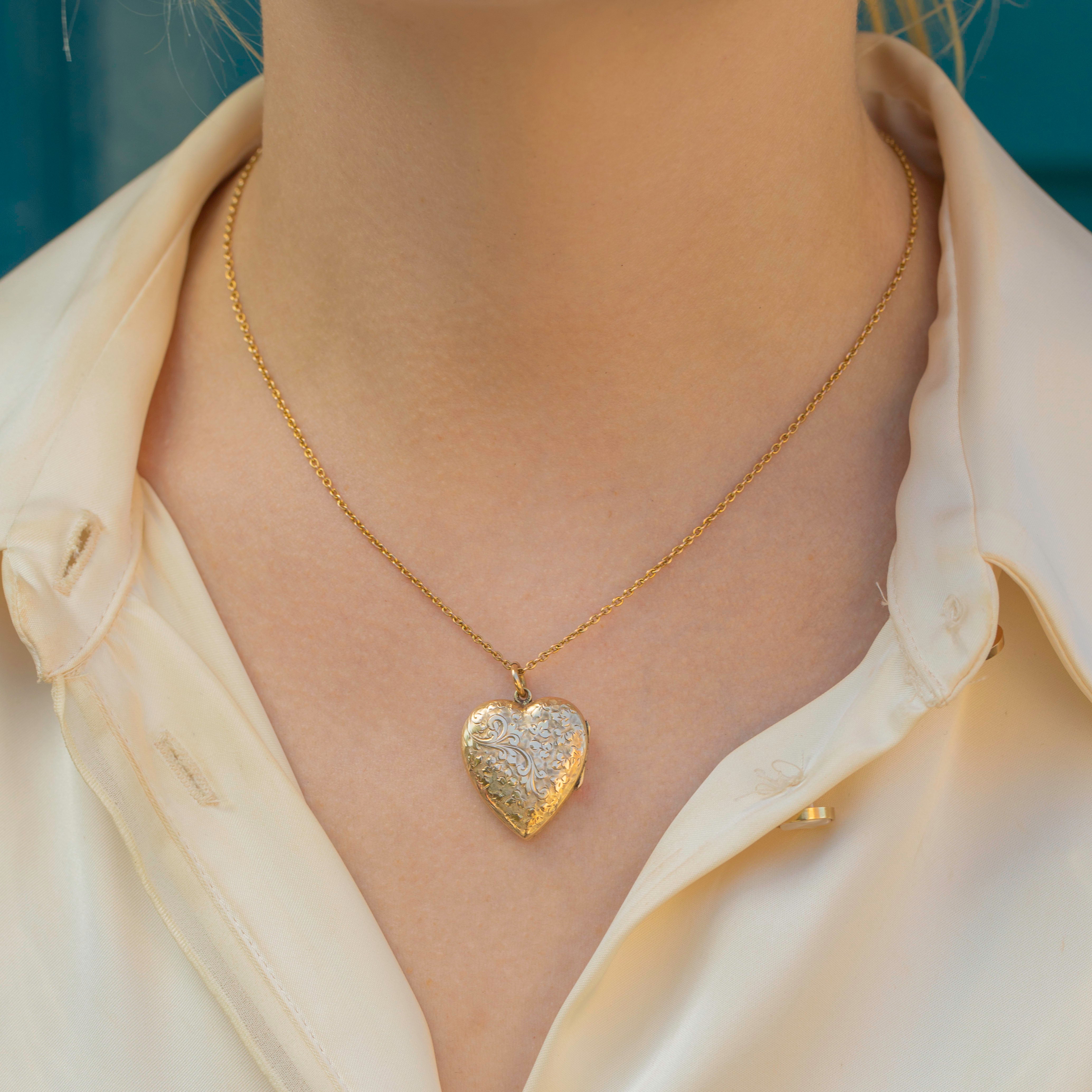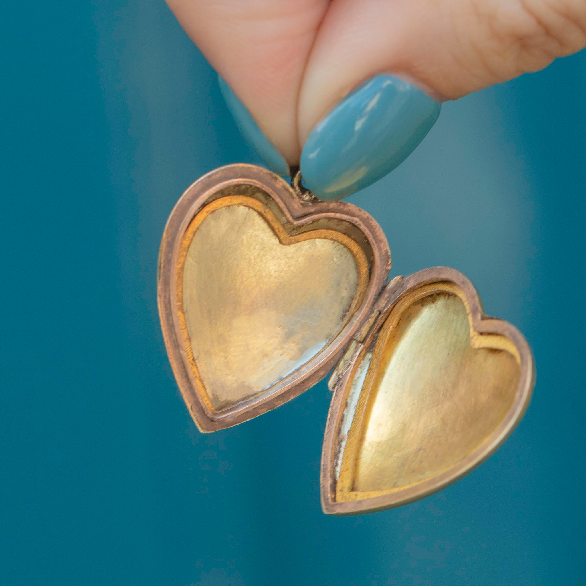 VERY GOOD. This antique 9ct Gold engraved heart locket is in very good condition! The engraved details are crisp and the cartouche is smooth allowing you to add an engraving for a personal touch. Under close inspection, there is a slight variation in the tone of the Gold on the front, but the glossy finish masks and we feel it adds to her antique charm. On the inside, there is wear and darkening around the border, however, she still contains both frames allowing you to home two of your most cherished photographs securely. The locket doors close with a satisfying 'click' giving you peace of mind once this Victorian Gold locket is suspended from any antique Gold chain!