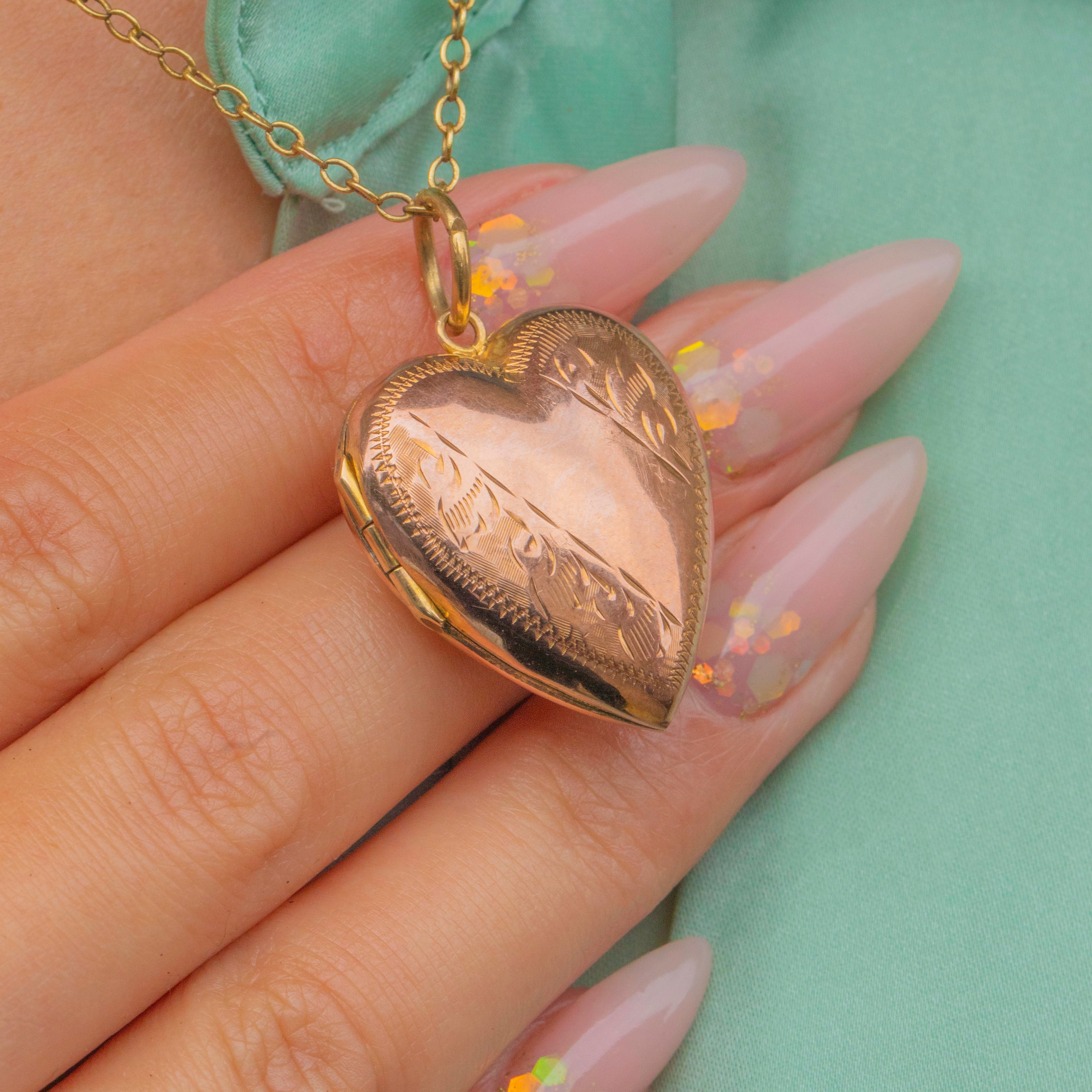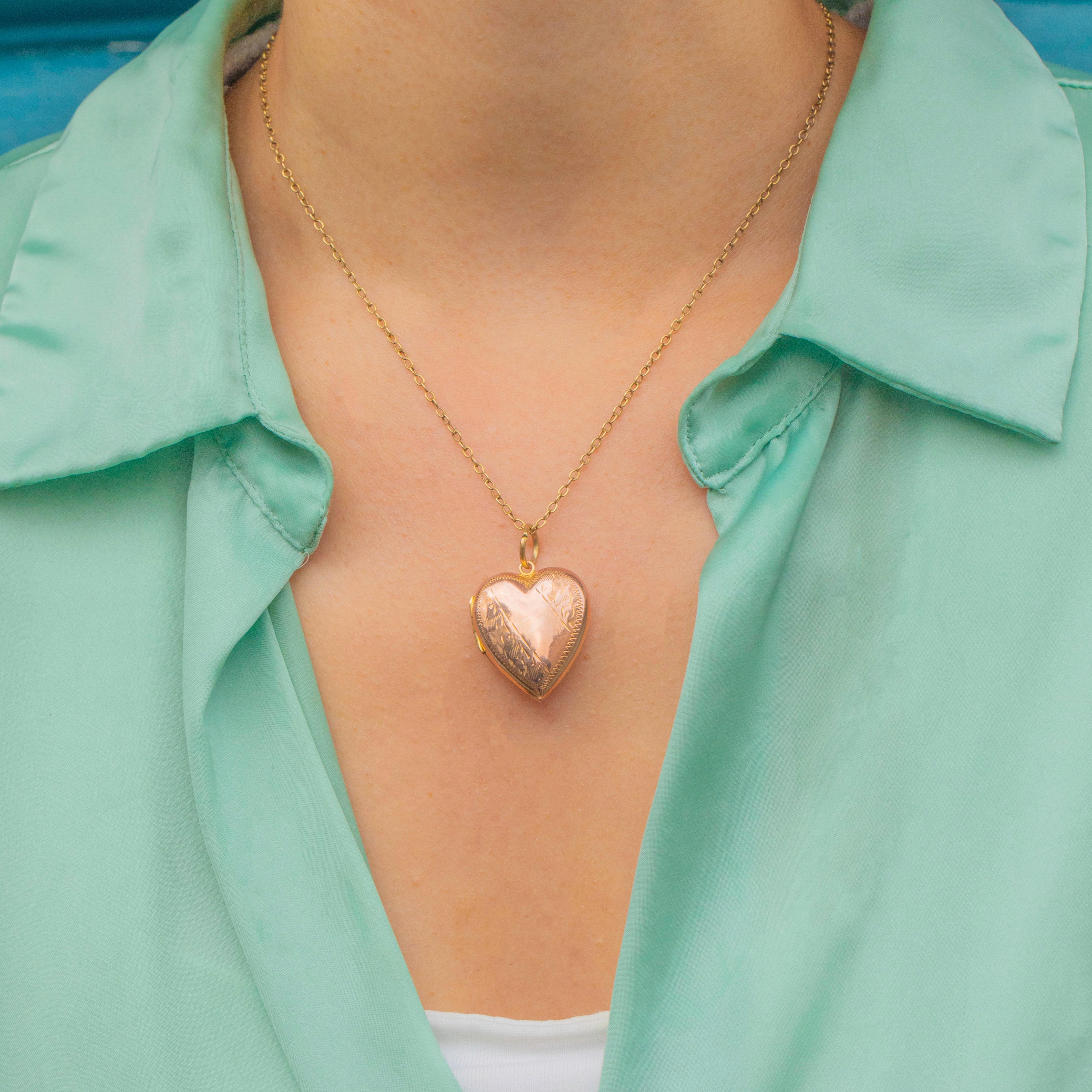This Edwardian heart locket is a classic piece of sentimental jewellery, crafted in warm 9ct Gold. The front is beautifully decorated with a split panel of smooth polish and hand-engraved foliage, framed with zig-zag detailing around the edges. It opens to reveal two frames inside, perfect for holding cherished photographs.