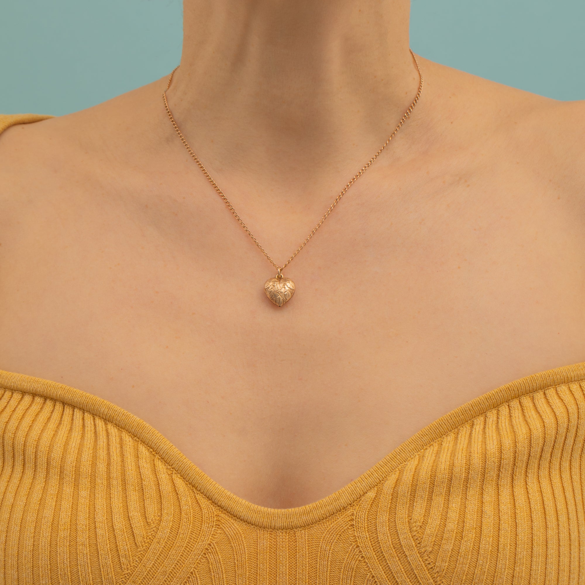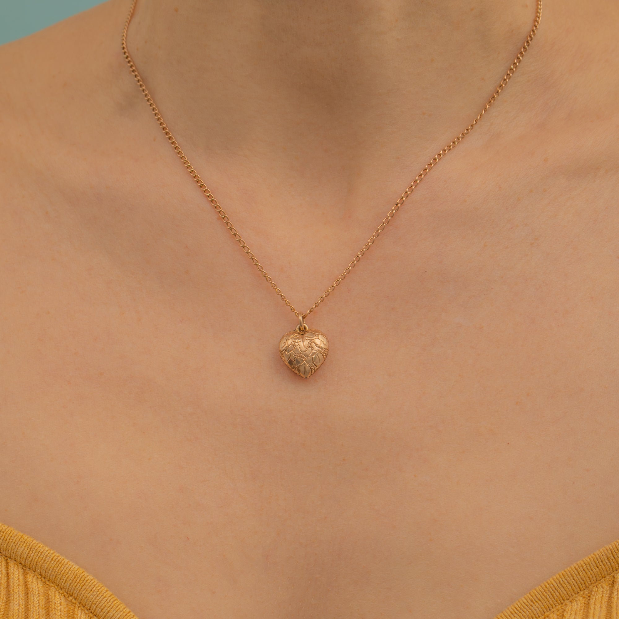 Crafted from buttery 9ct Gold, this Victorian heart pendant exudes a lovely warmth and has a satisfying sleek, and elegant finish. The puffy heart form is intricately engraved, and comes complete with a 16" curb chain, making this piece ready to wear!
