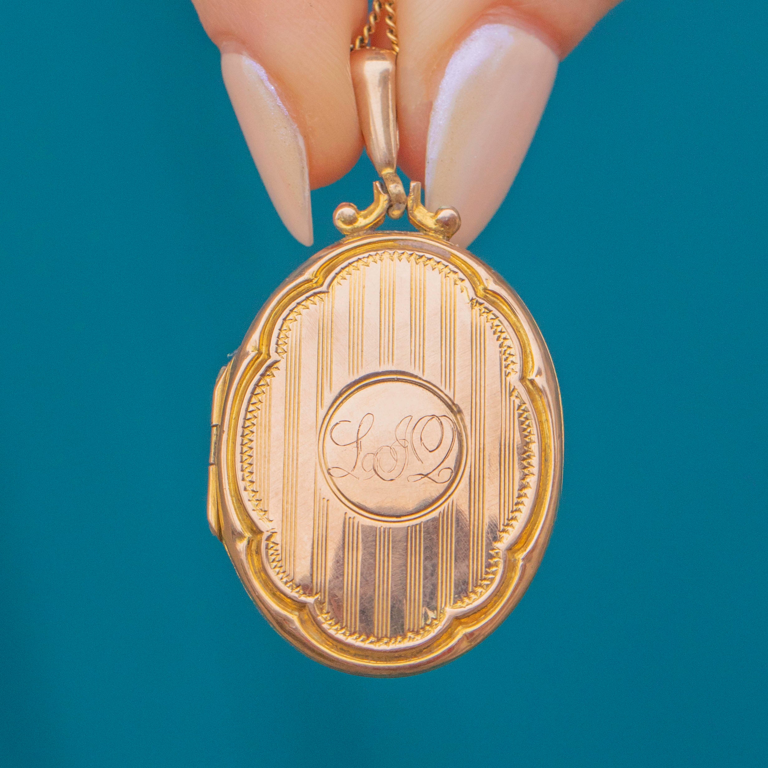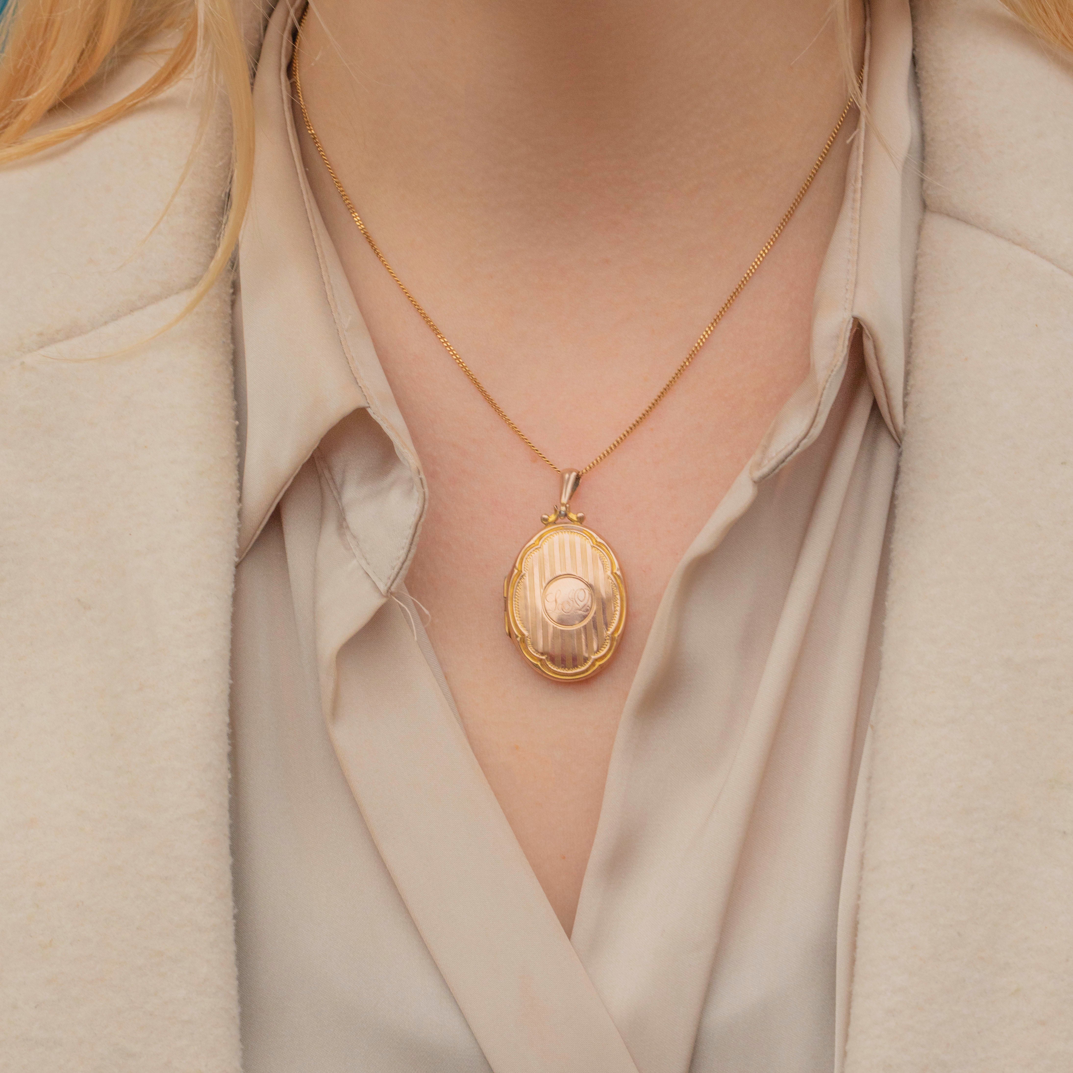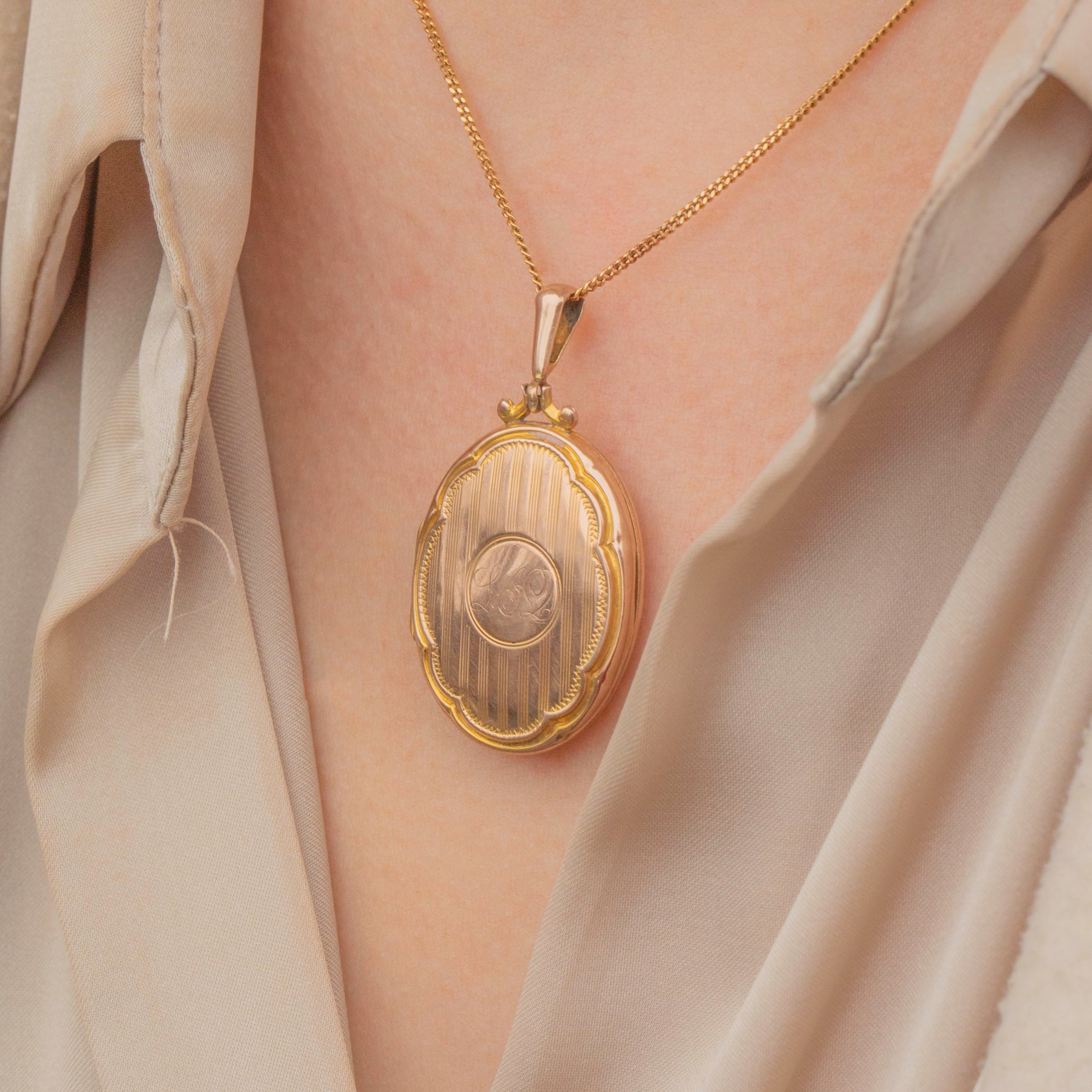 This smart antique 9ct Gold engraved oval locket is set to become the new abode for your most cherished memories! Plucked from the Edwardian era, this locket has been crafted from buttery Gold and features stylish pinstripe details and engraved initials in the central cartouche adding to its historical intrigue.