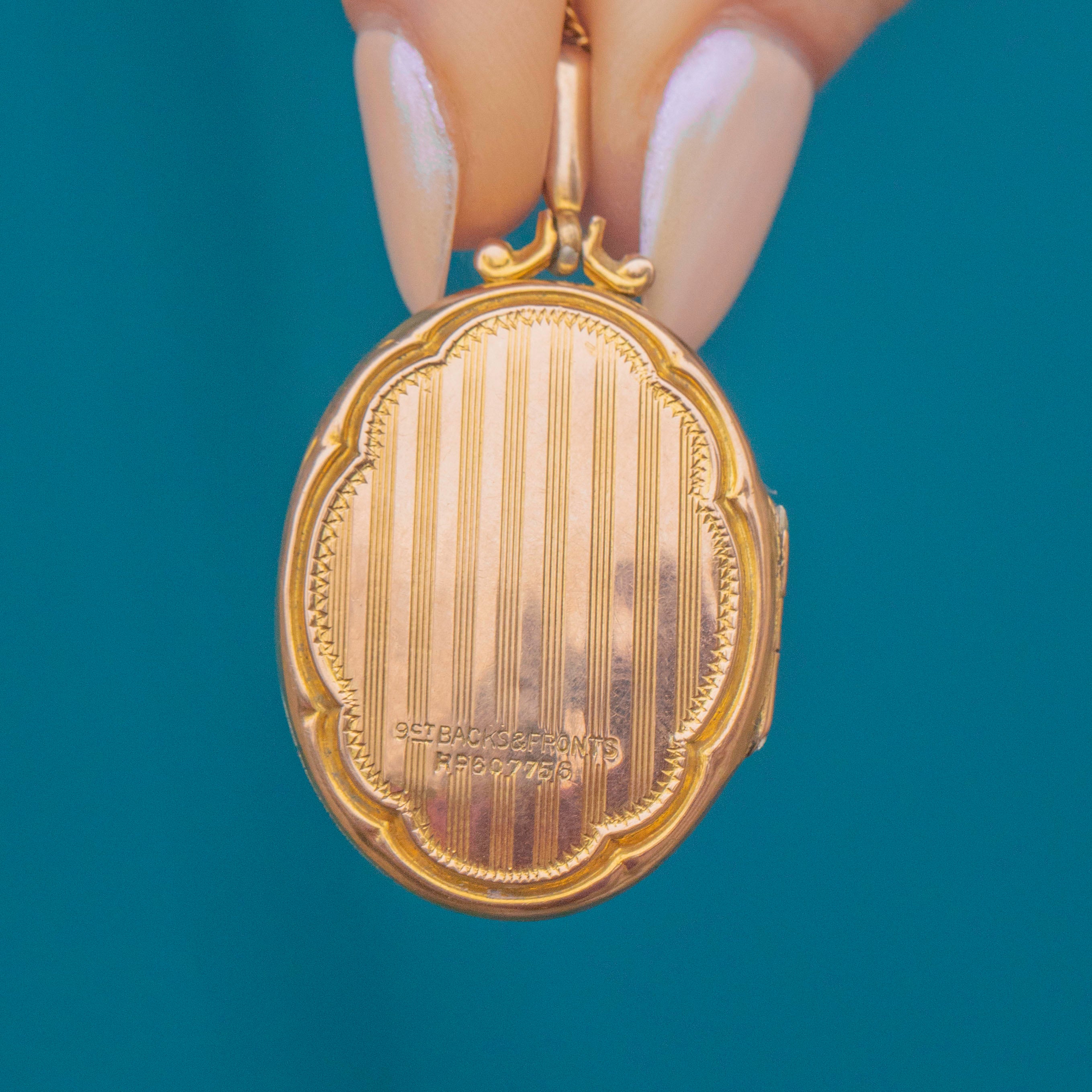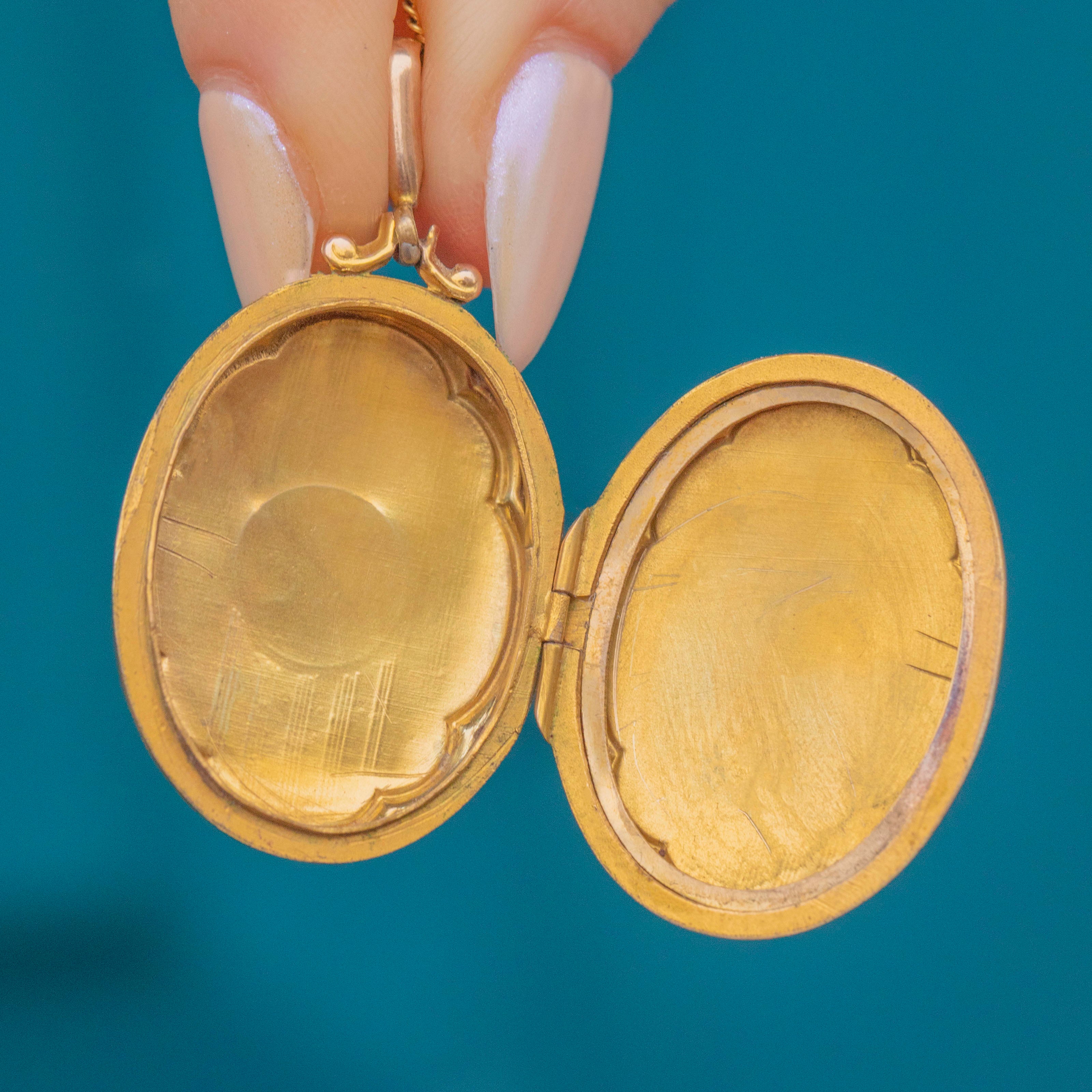 VERY GOOD. This antique 9ct Gold engraved oval locket is in very good condition. The front of the locket is pristine, all the details have remained crisp, with no dings or scuffs. There is some wear inside the locket, and one of its original frames is missing, but if the photo is cut to size it will stay in place and the wear on the inside of the doors will be hidden. The Gold is buttery throughout and the large bale will allow you to suspend this Edwardian locket from a chain of your choice with ease!