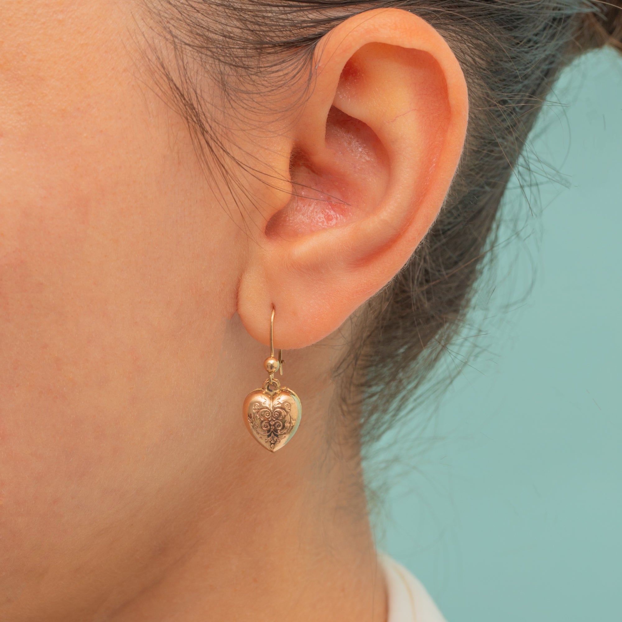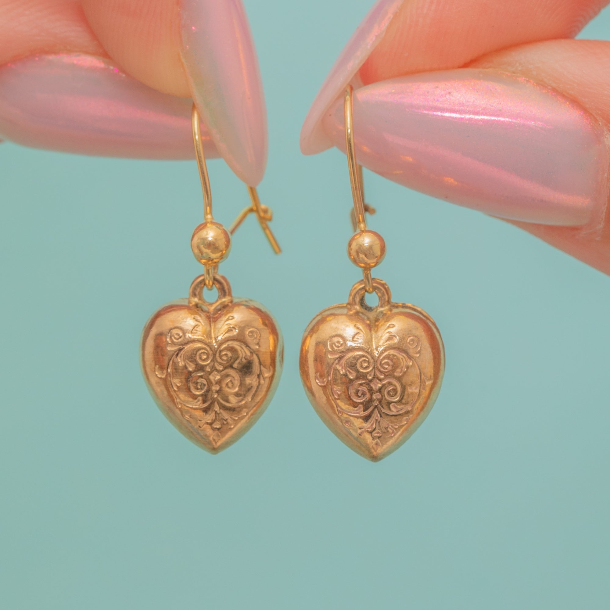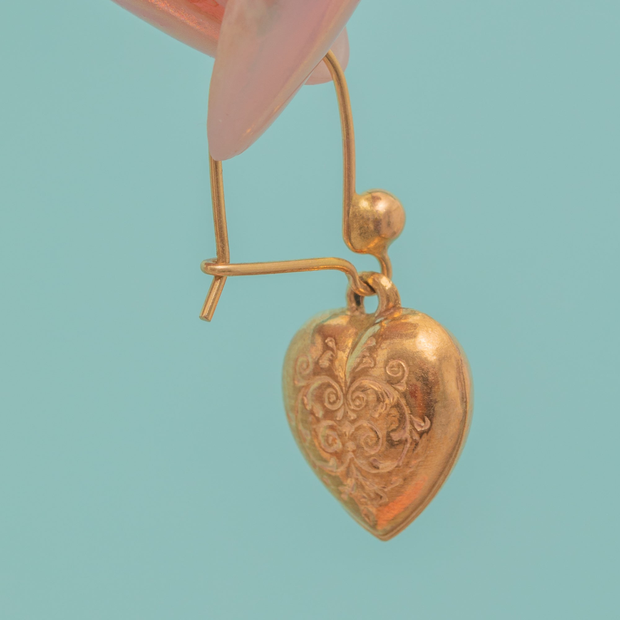 EXCELLENT: These antique 9ct Gold engraved puffy heart drop earrings are in excellent condition. The 9ct Gold is warm and radiant, with crisp and clear engravings. Totally irresistible, we have fallen in love with these Victorian heart earrings!