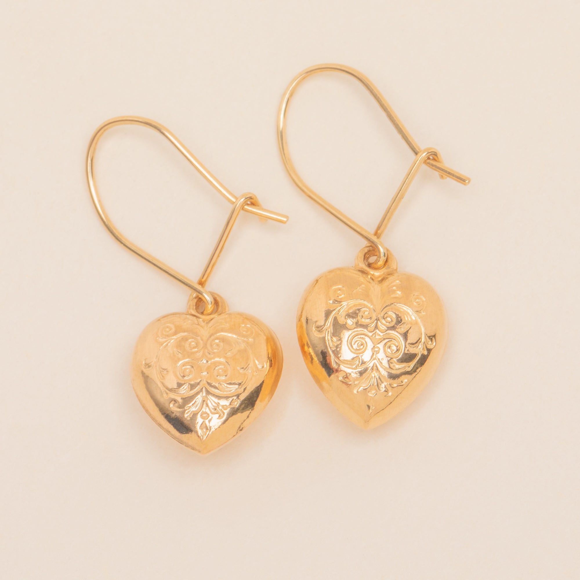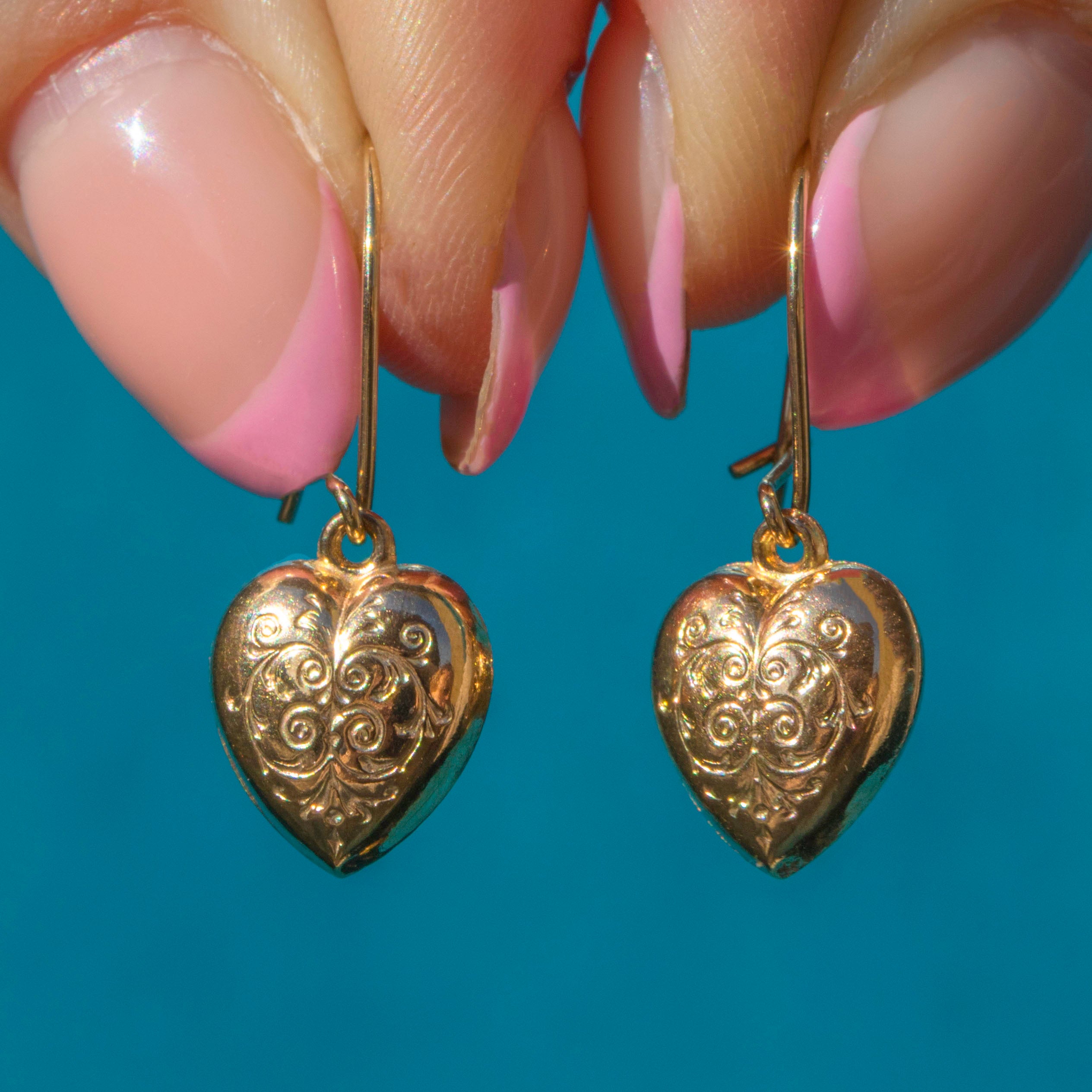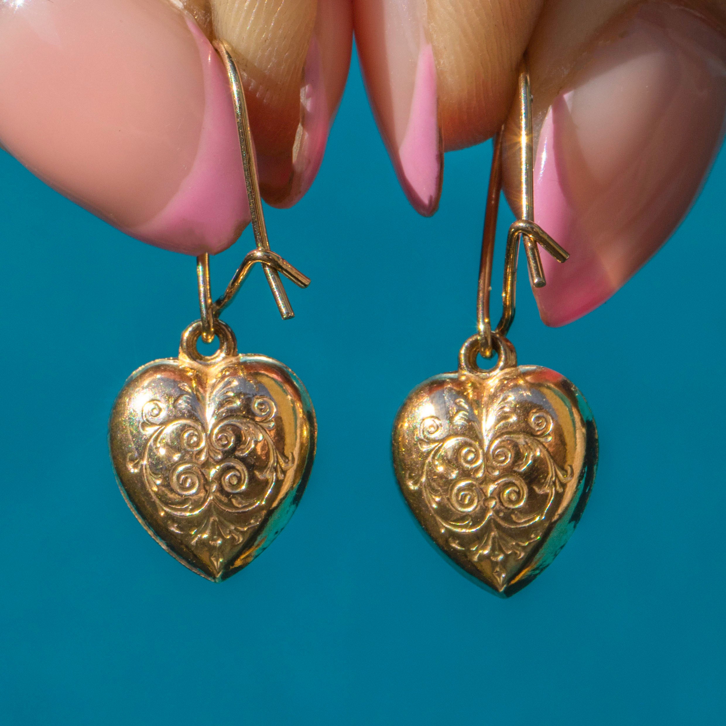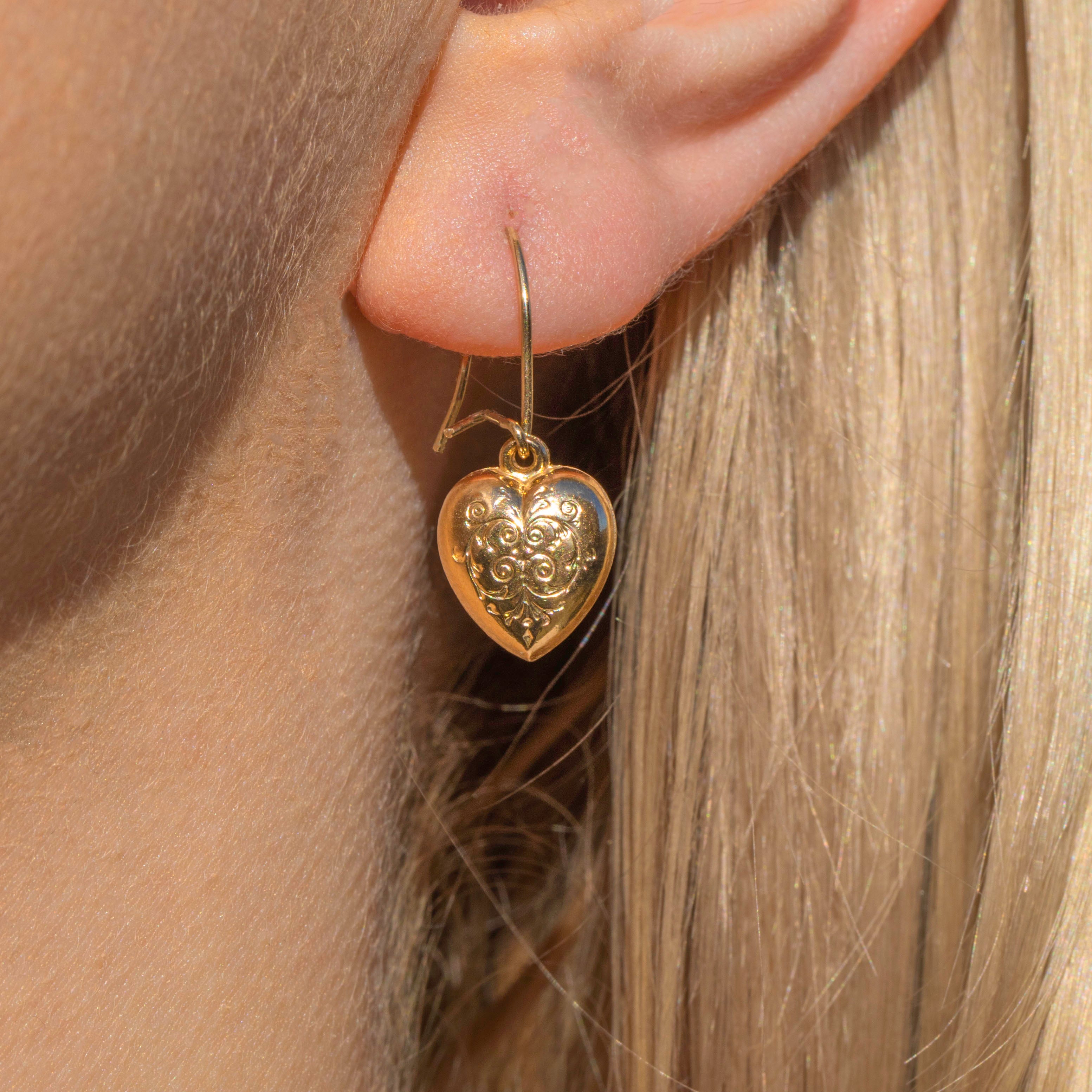 EXCELLENT. These antique 9ct Gold engraved puffy heart earrings are in excellent condition. The 9ct Gold is warm and radiant, with crisp and clear engravings. With hooks that securely latch on the back, these antique Gold earrings can be worn with confidence!