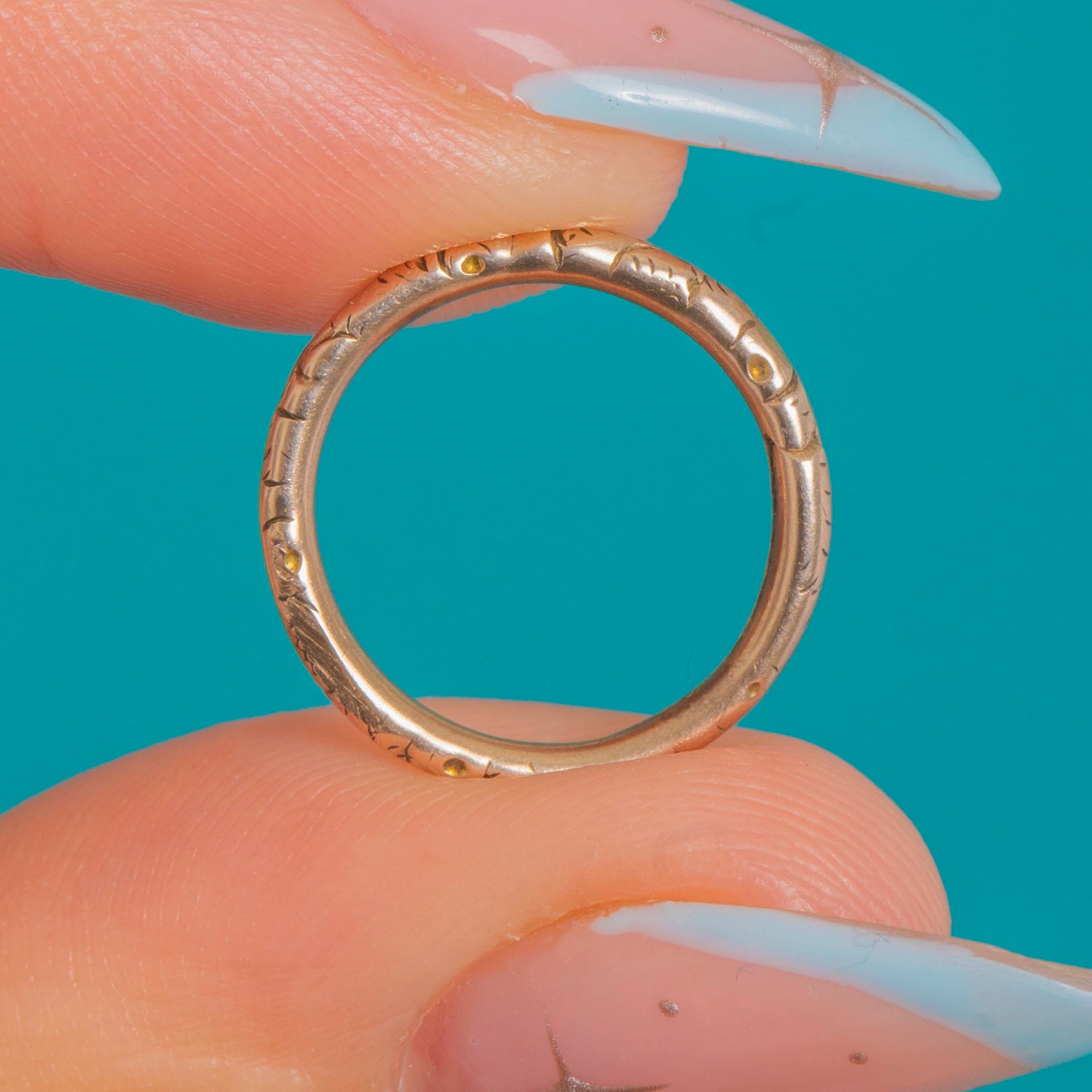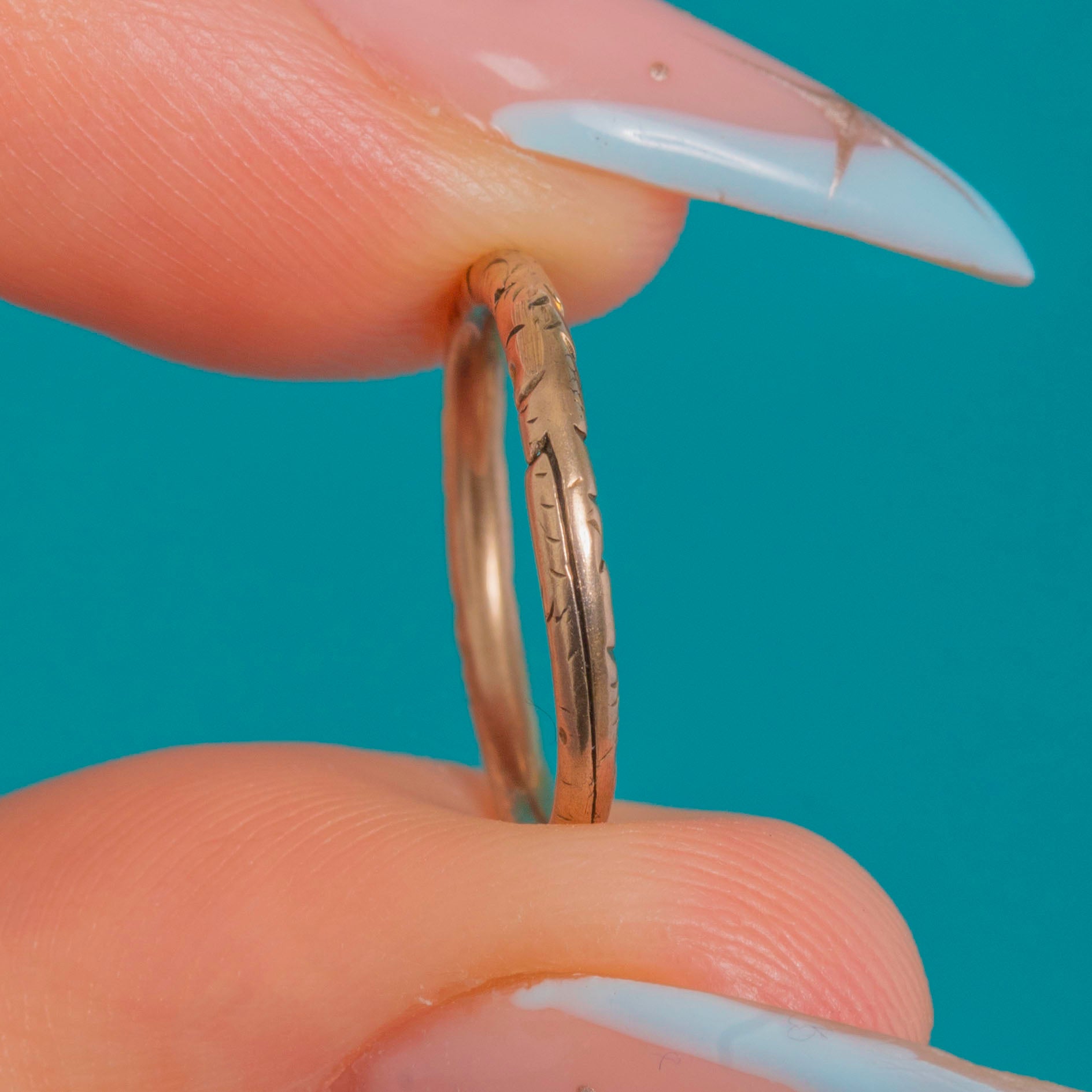 A charming & versatile 14mm Georgian 9ct Gold engraved split ring, richly detailed with all-around hand-engraved foliate details. Its warm antique patina gives a quietly luxurious glow that feels timeless and refined.