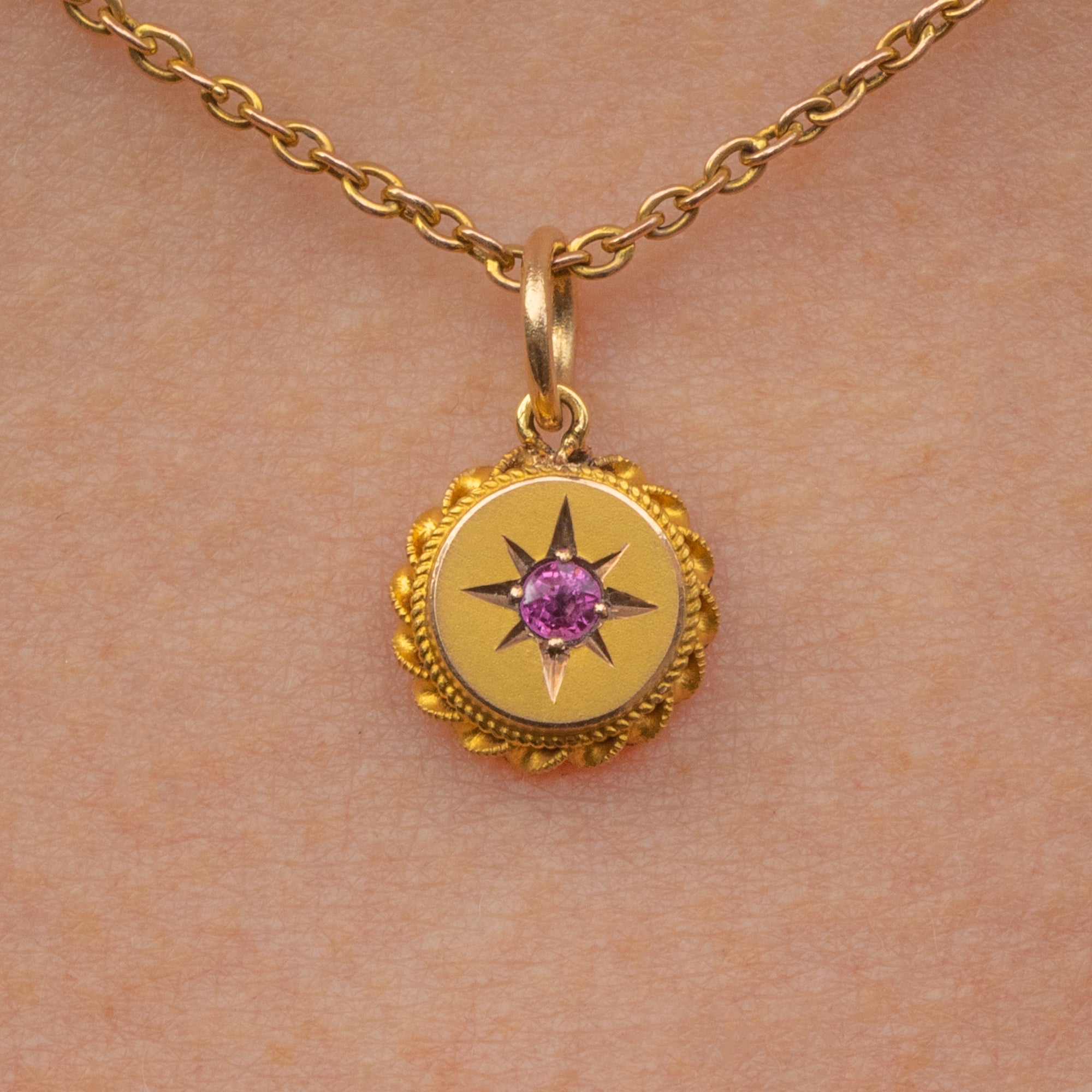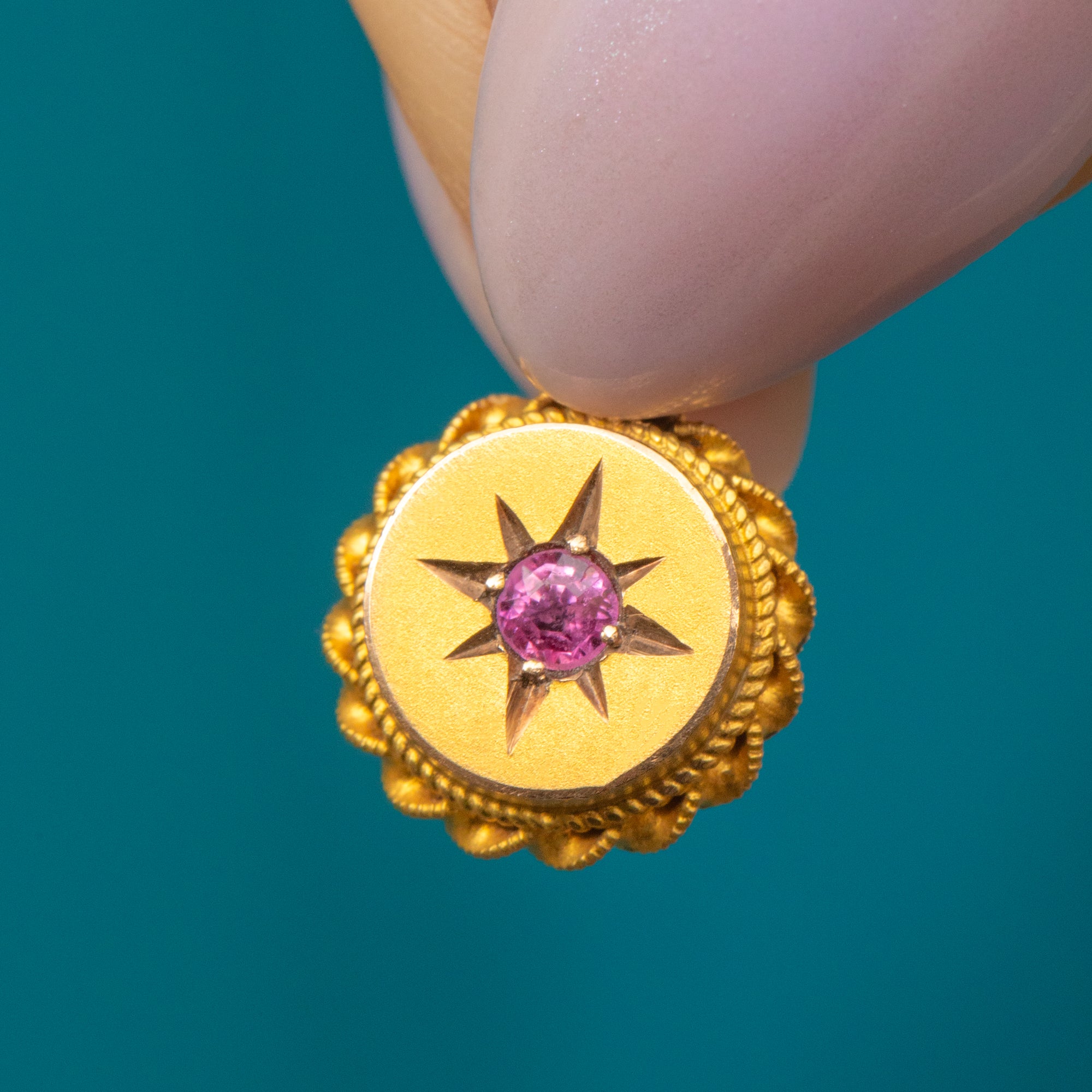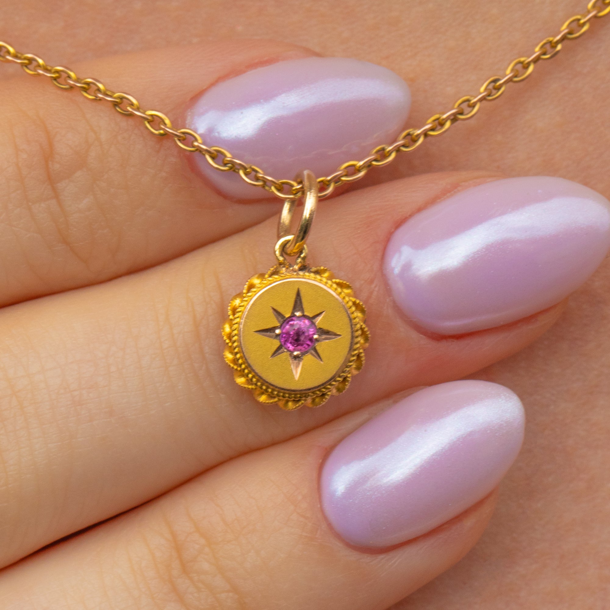 Her Ruby is displayed within a celestial star setting haloed by a double layer of twisted rope following her circumference. This Victorian Ruby charm is a delicate delight and perfect for everyday wear, she will make a lovely addition to your antique jewellery collection!