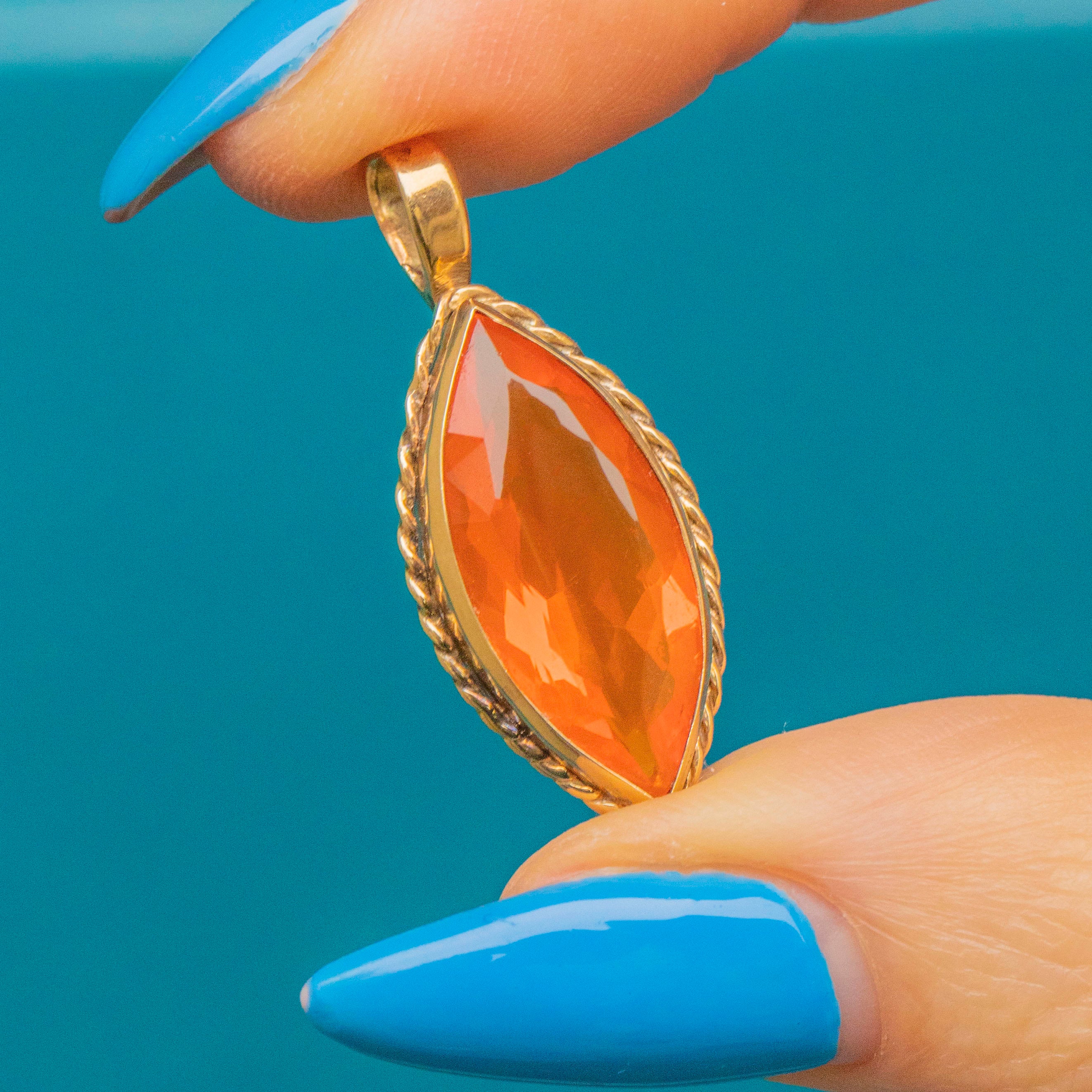 The marquise shaped Fire Opal is set within a 9ct Gold bezel, hugged tightly from all sides. Plump, sophisticated and highly sought after, we imagine this Tangerine hued Fire Opal pendant will leave your mouth watering!