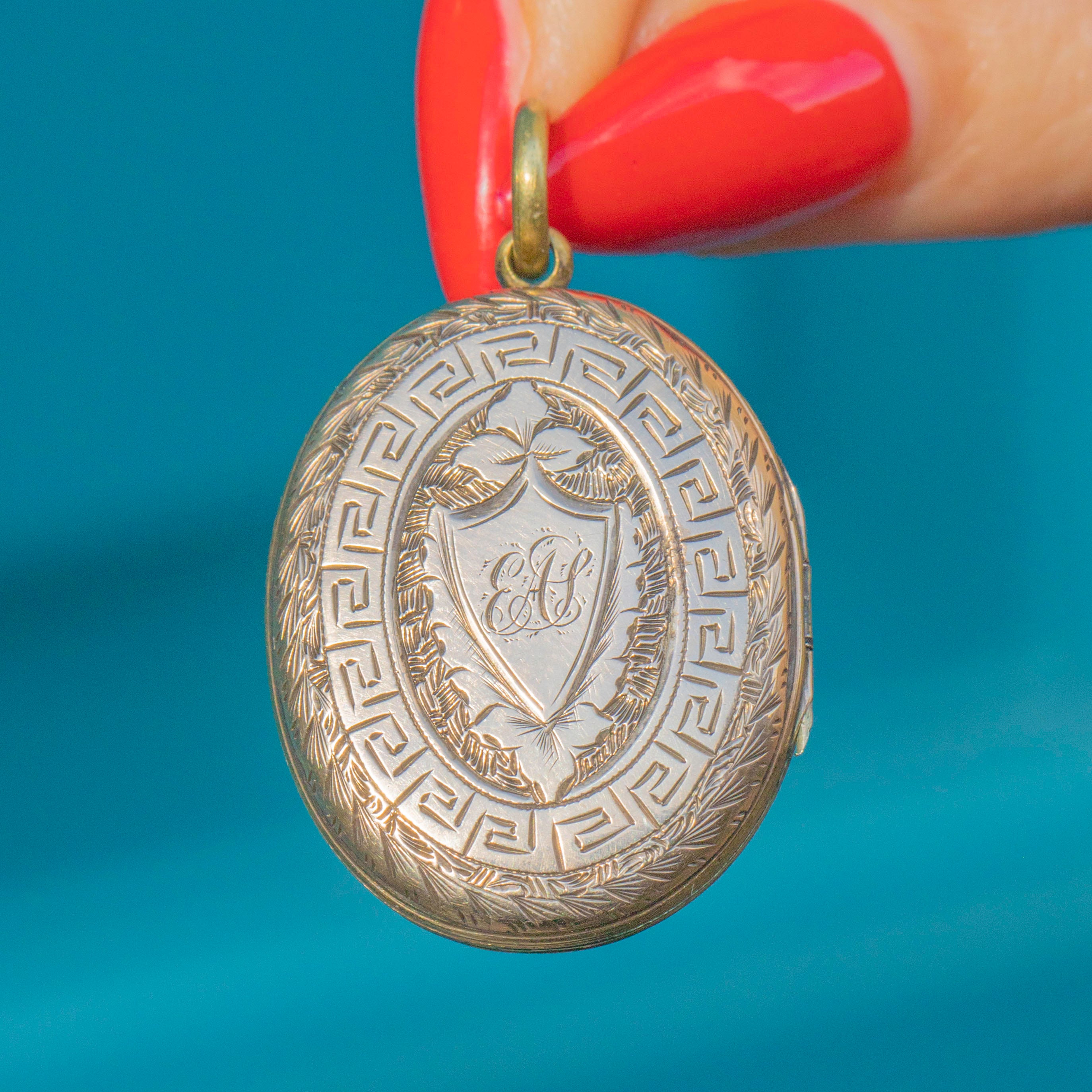 This striking antique Victorian oval locket is crafted in 9ct Gold and adorned with ornate engraving. The front is decorated with a bold fleur-de-lys motif surrounded by scrolling floral details, while the reverse bears the finely engraved initials “EAJ”, giving this piece a personal historic charm.
