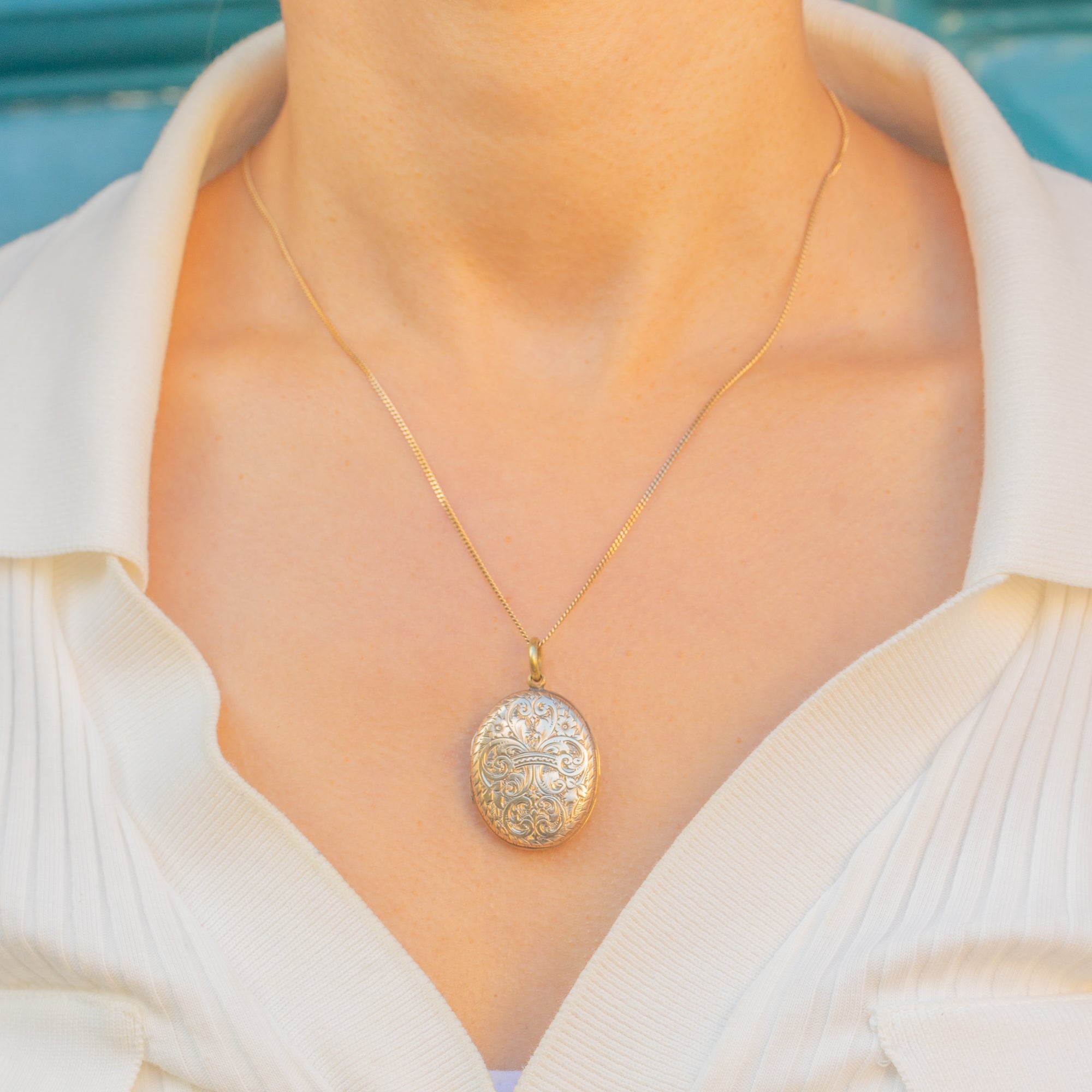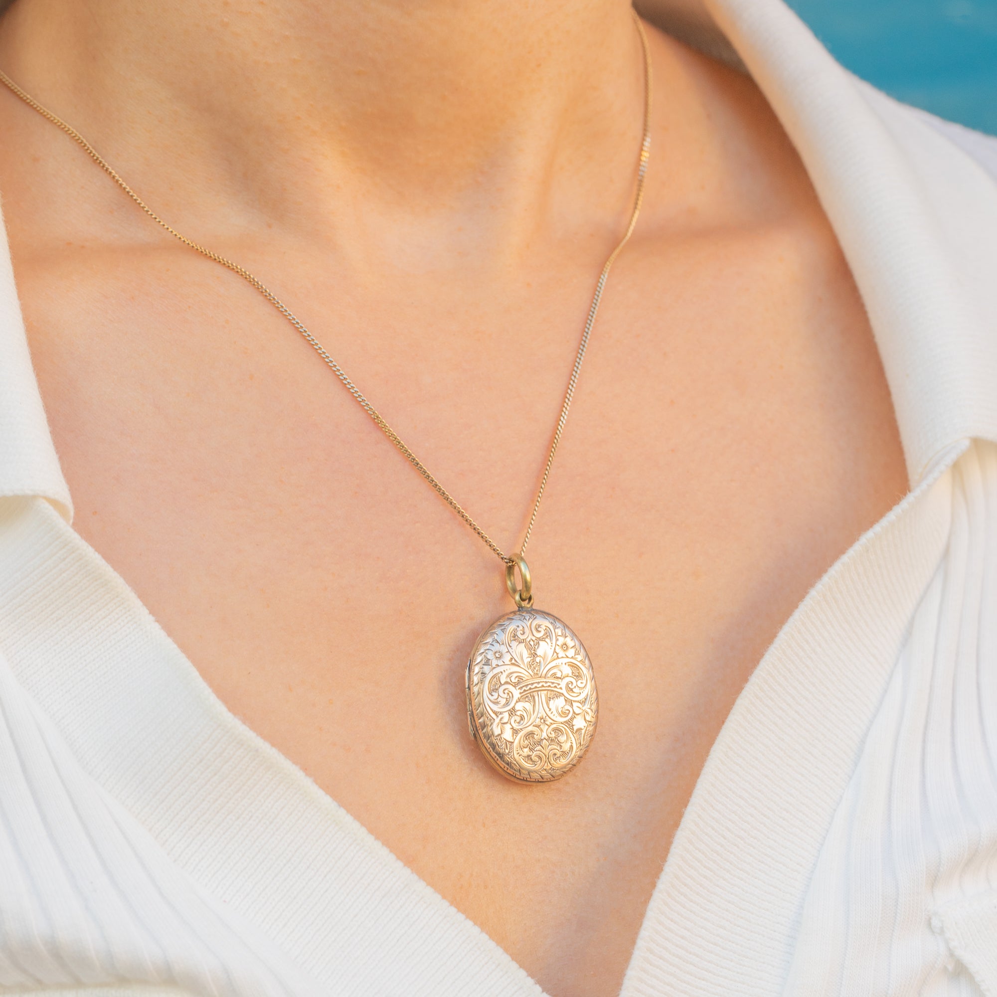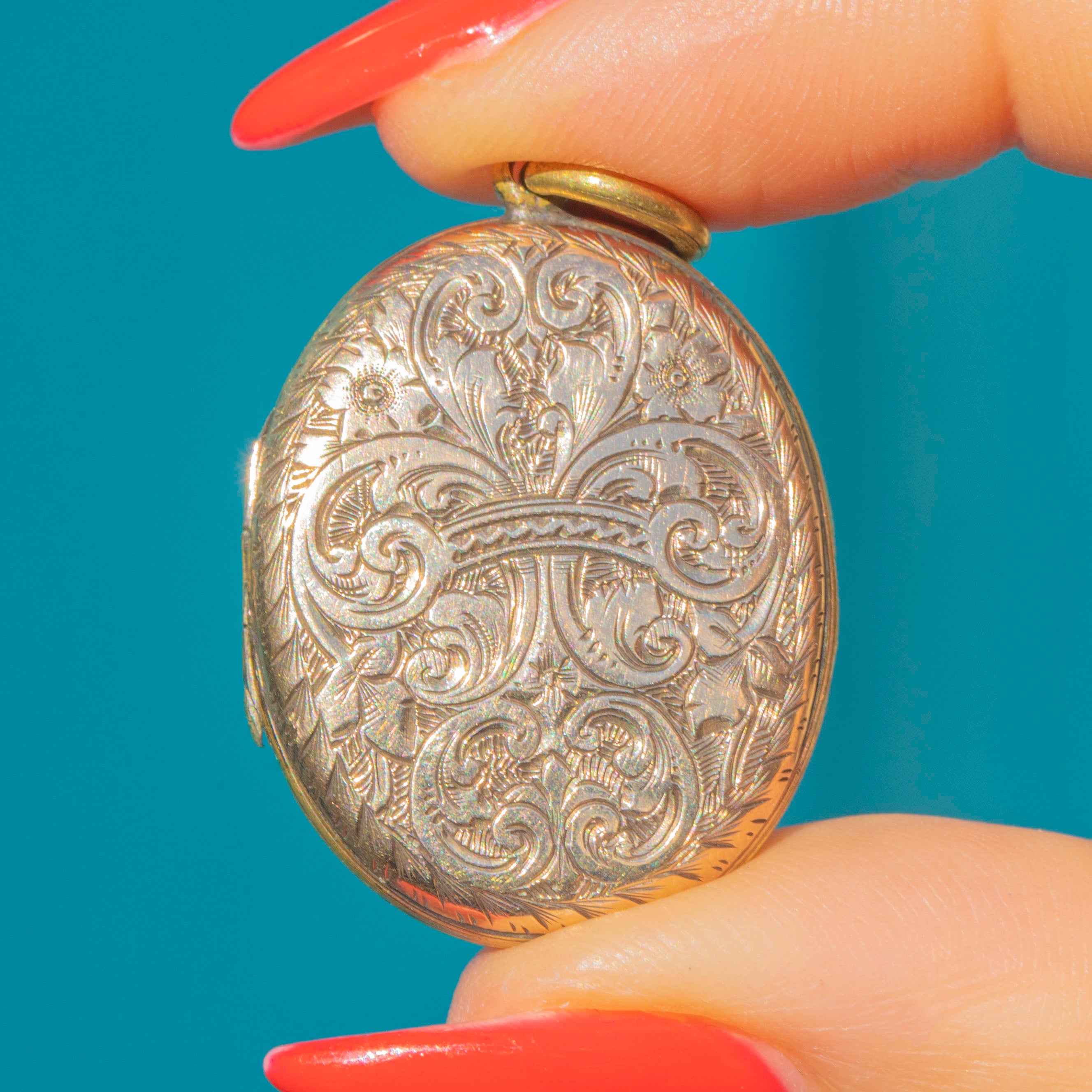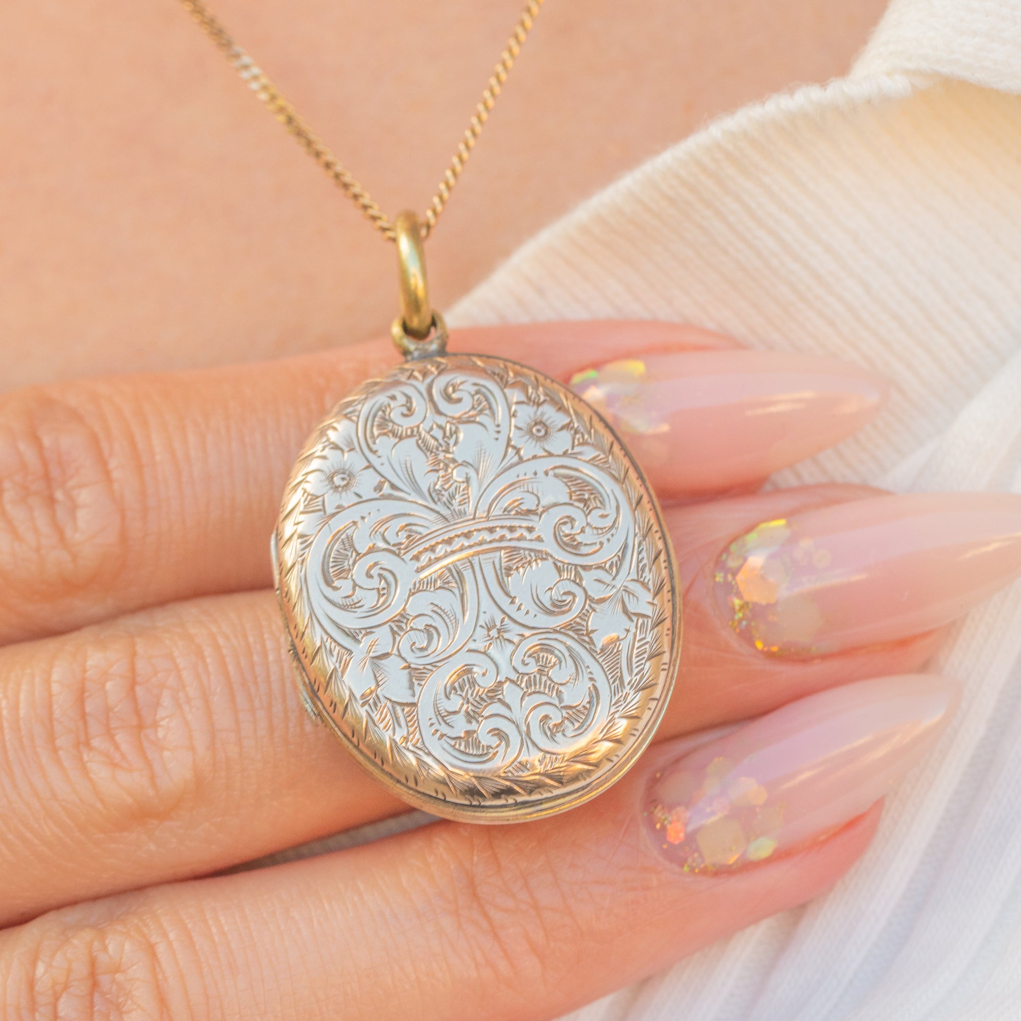 Antique 9ct Gold Floral Fleur-De-Lys Engraved Oval Locket