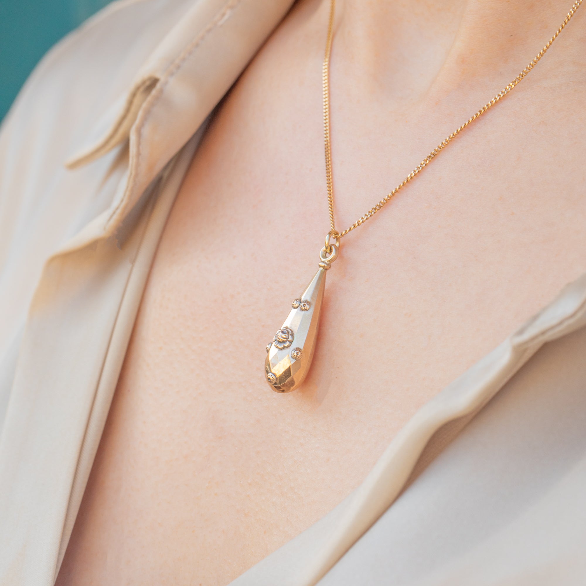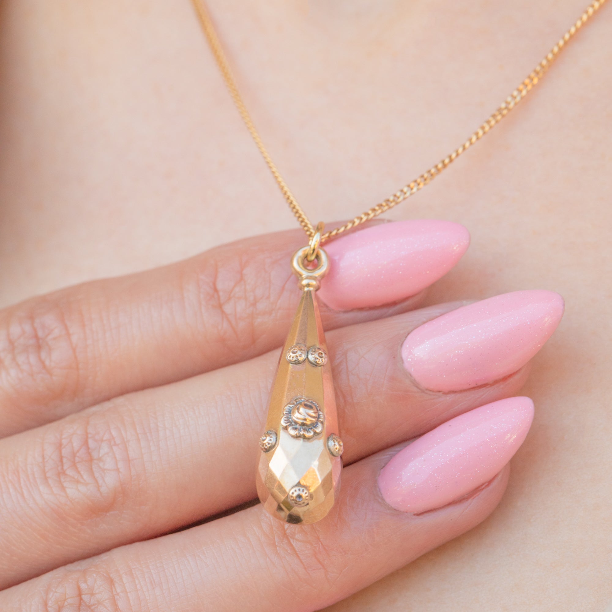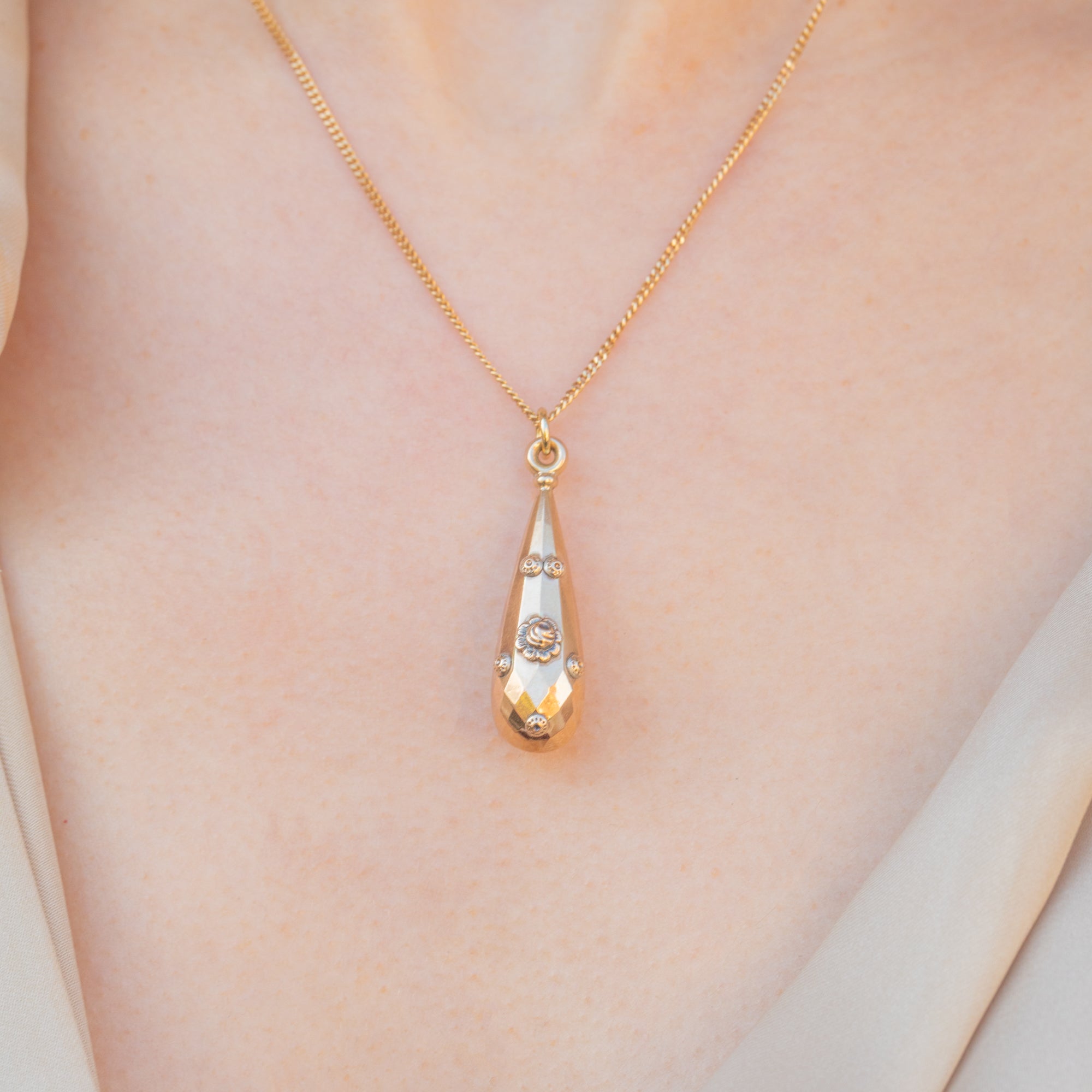 This antique 9ct Gold floral torpedo drop pendant is just divine! The perfect Victorian pendant for an effortlessly chic look, she boasts a faceted torpedo shape, articulated with dainty floral accents. This feminine Victorian pendant oozes elegance and, once suspended from a Gold chain, will rest delicately upon your décolletage.