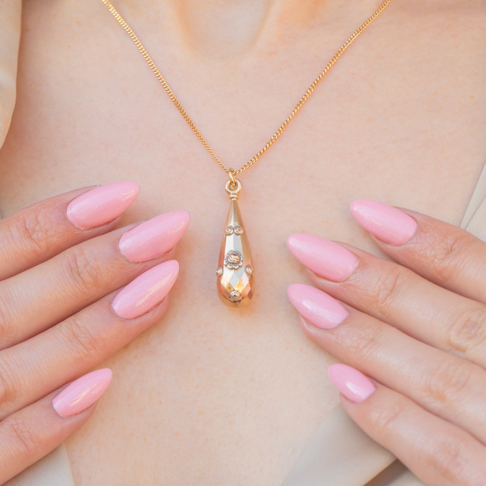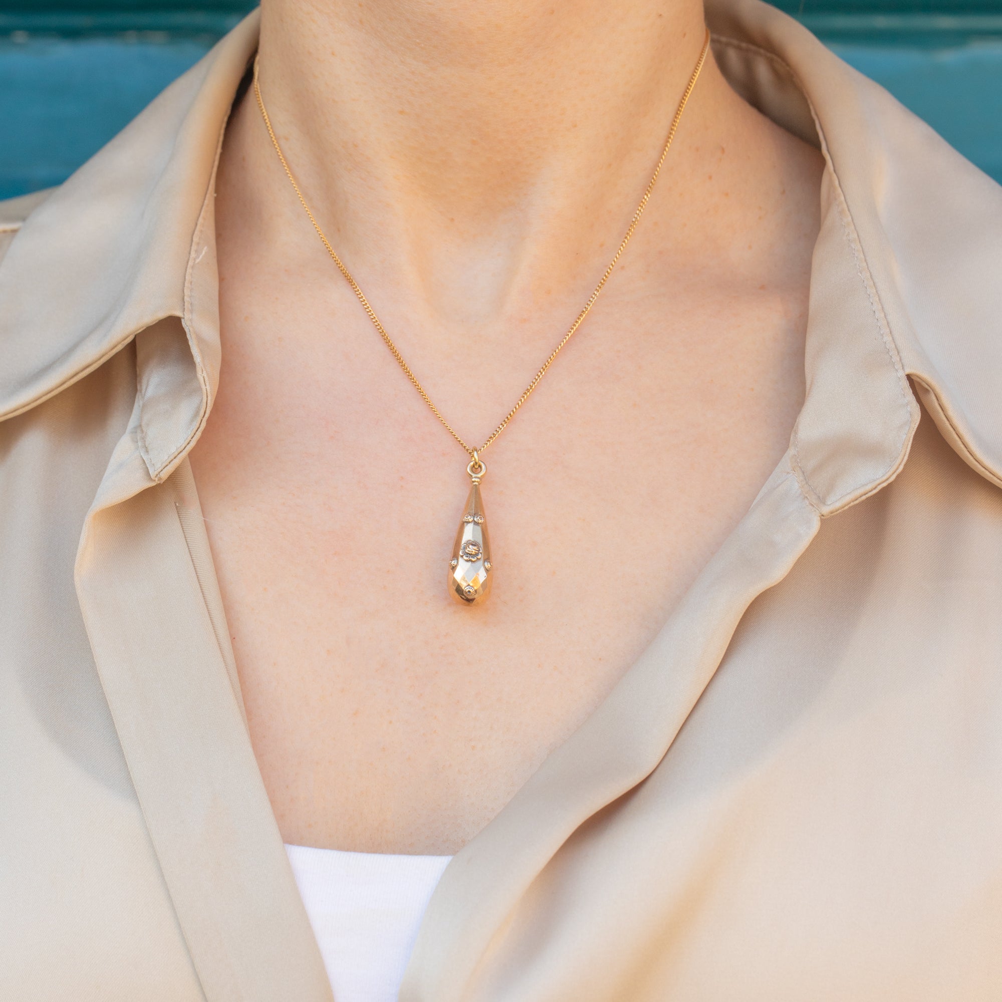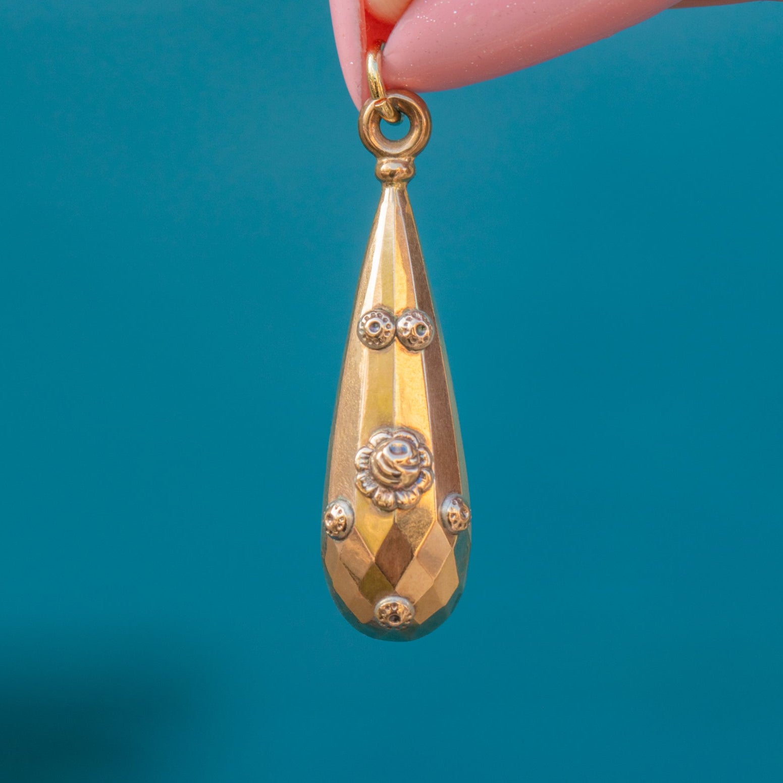 This antique 9ct Gold floral torpedo drop pendant is just divine! The perfect Victorian pendant for an effortlessly chic look, she boasts a faceted torpedo shape, articulated with dainty floral accents. This feminine Victorian pendant oozes elegance and, once suspended from a Gold chain, will rest delicately upon your décolletage.