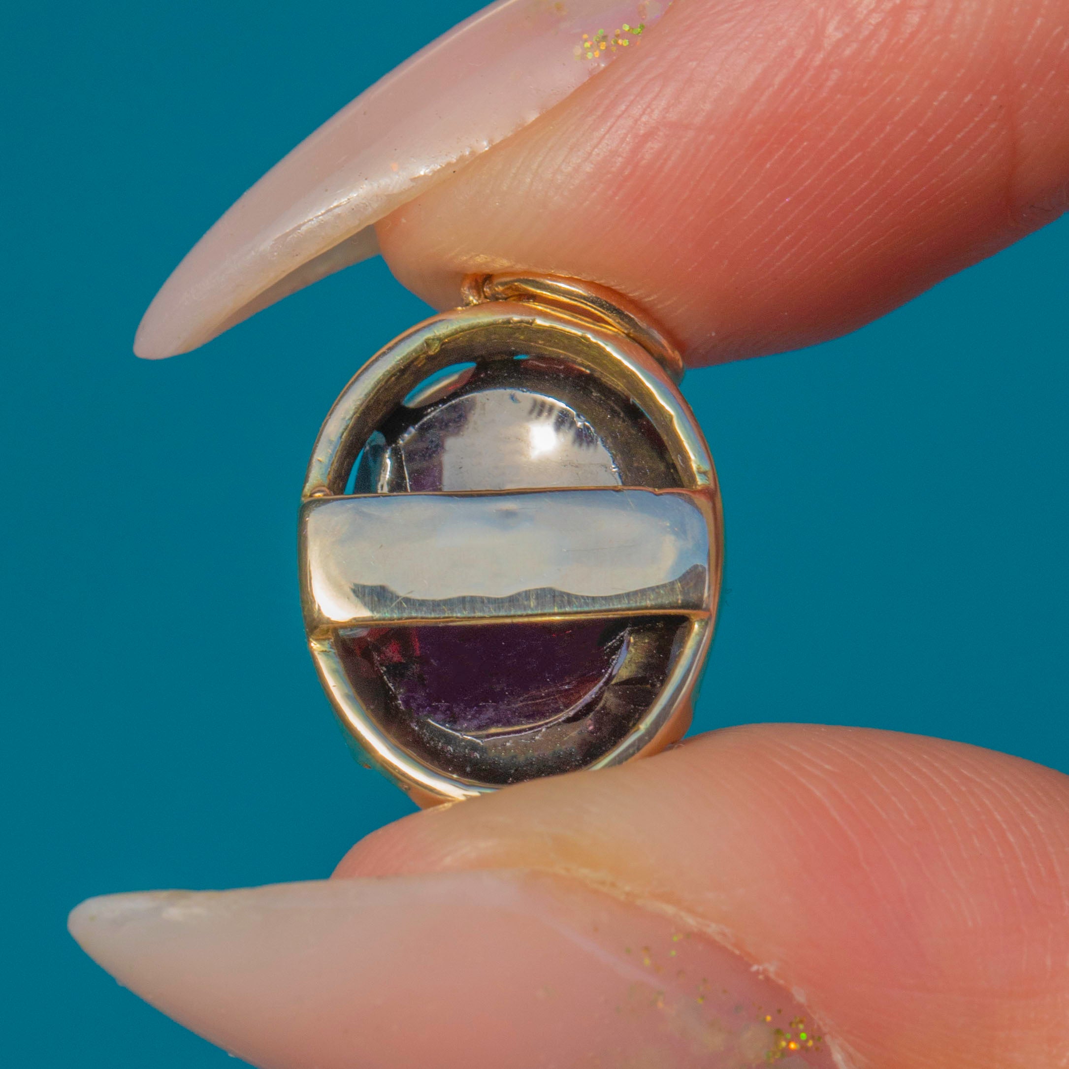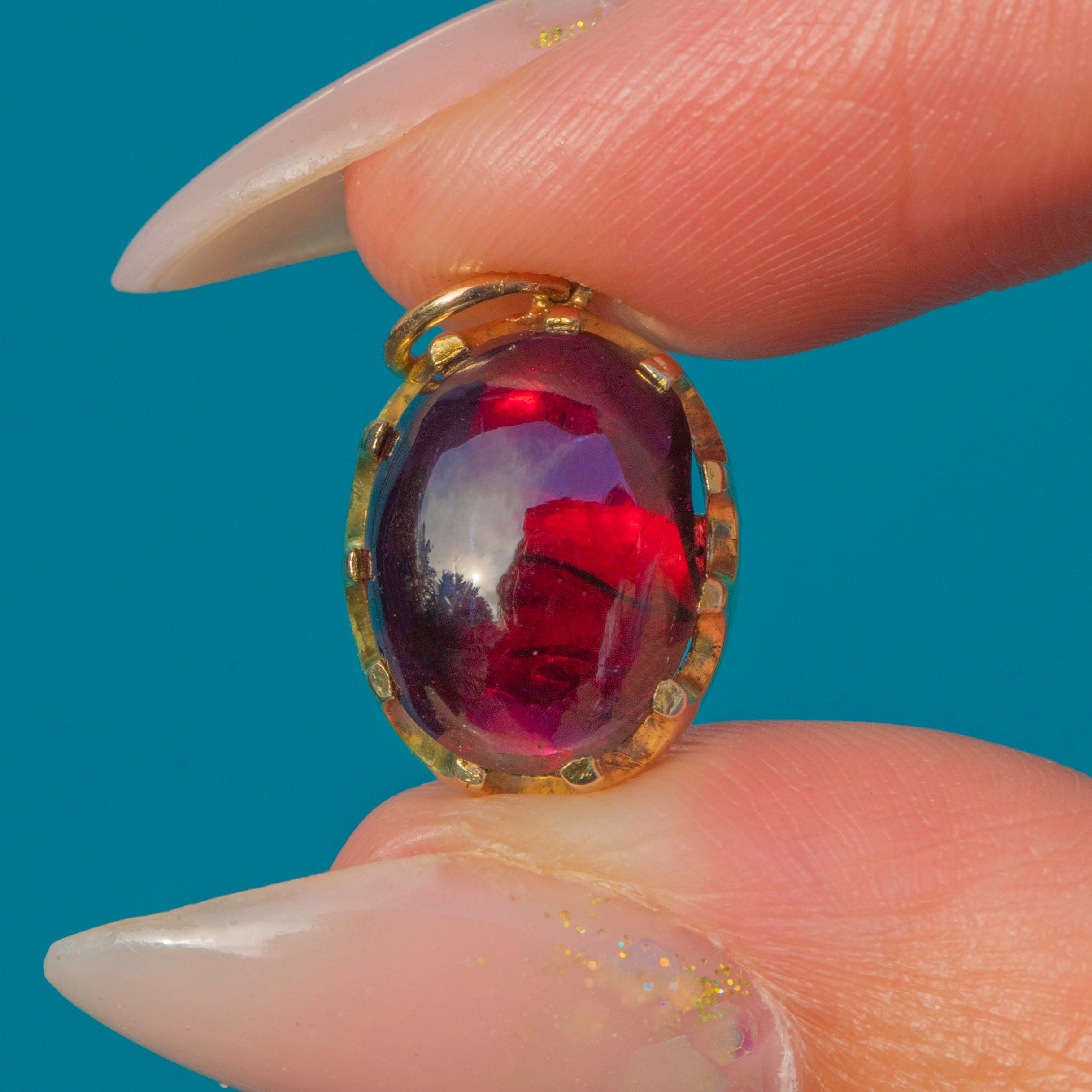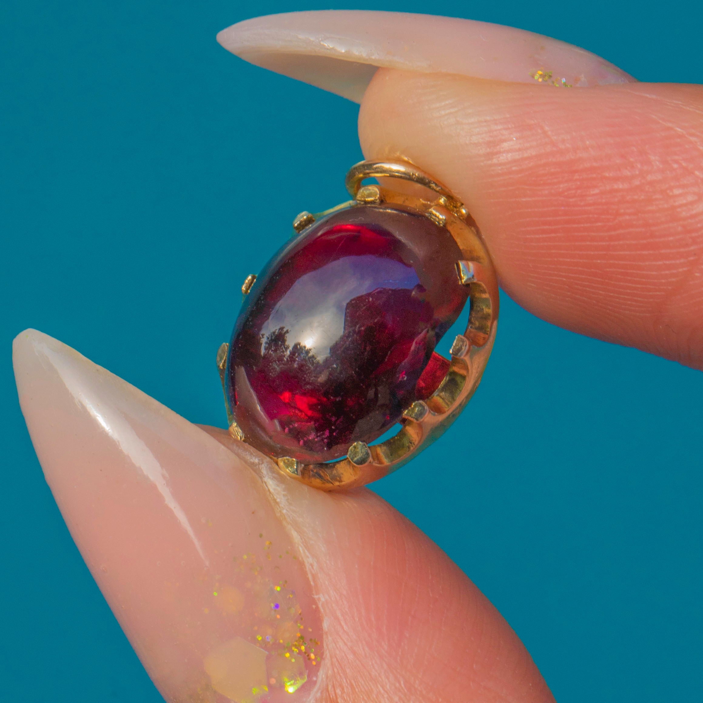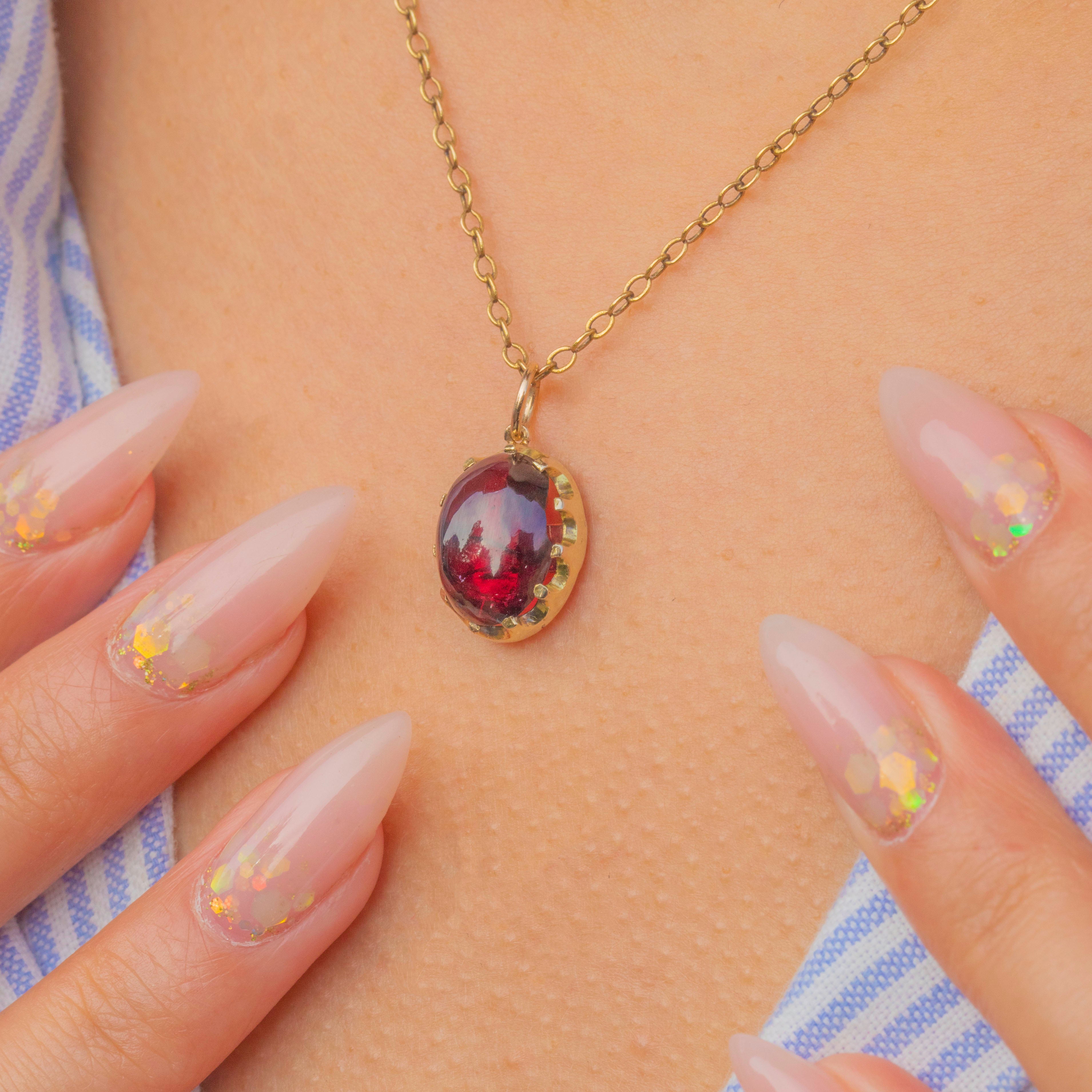This antique charm is set with a glowing Garnet cabochon, its rich red hue alive with inner fire. The oval cabochon measures 12.5mm x 9mm, weighing approximately 1.06ct, and is securely held in a 9ct Gold bezel setting.