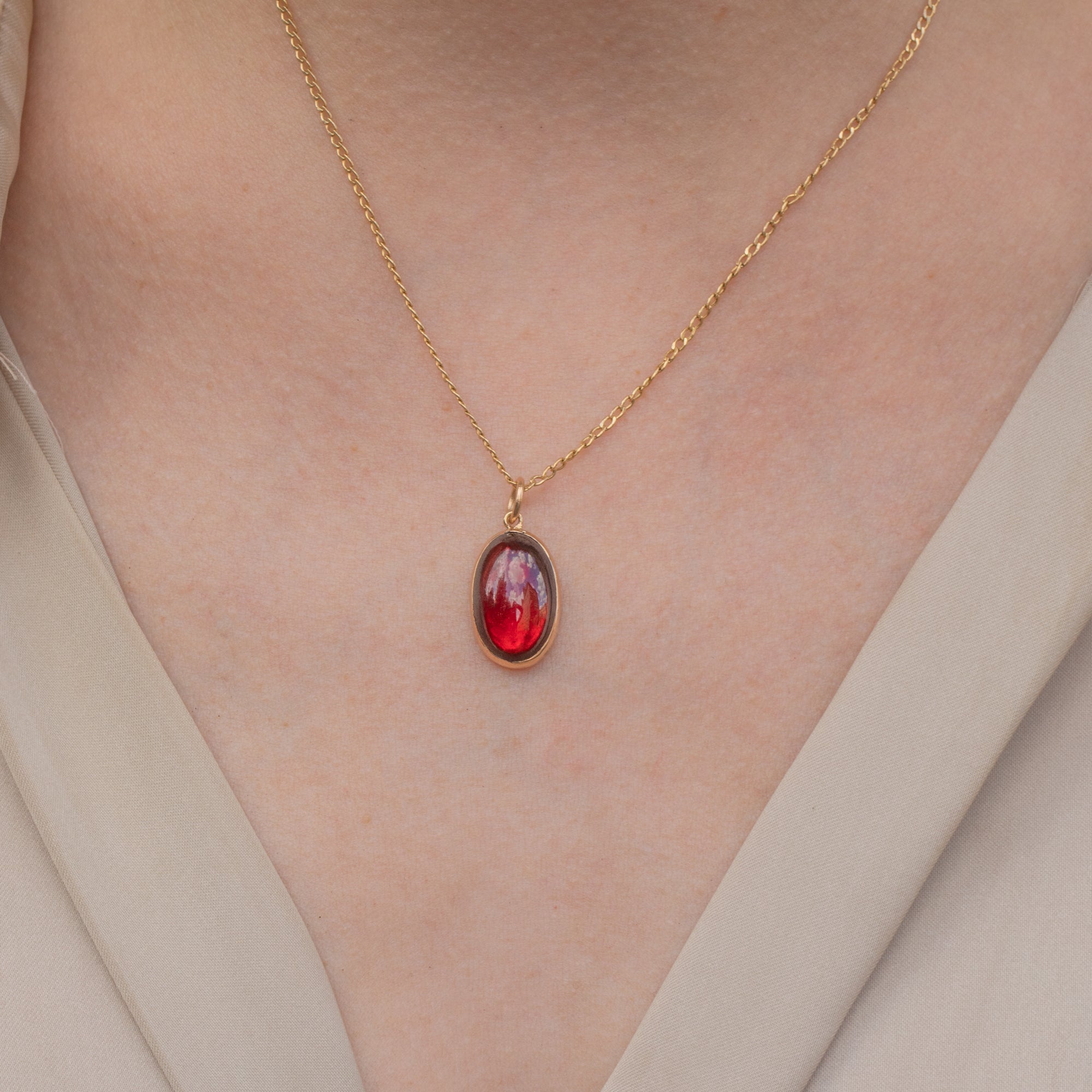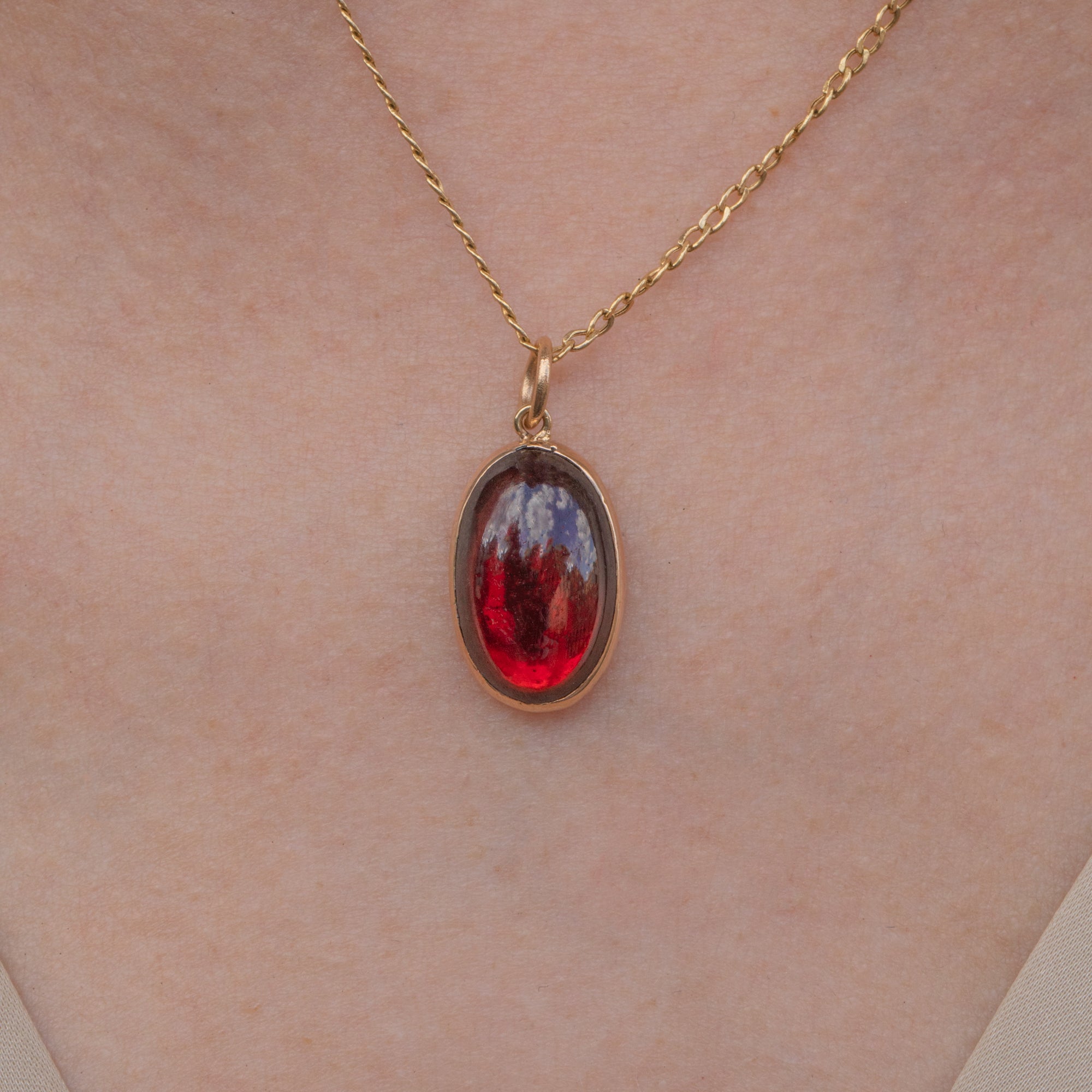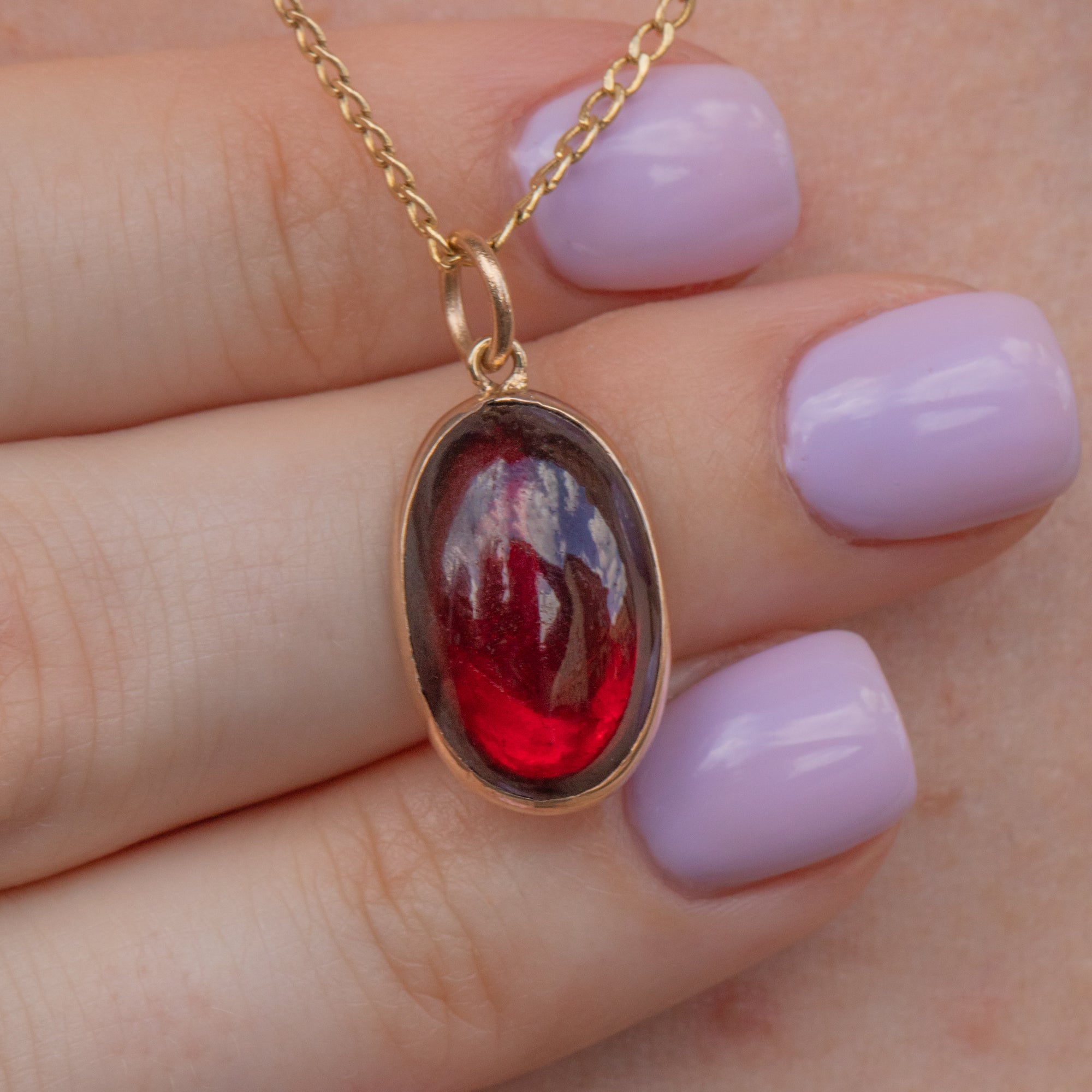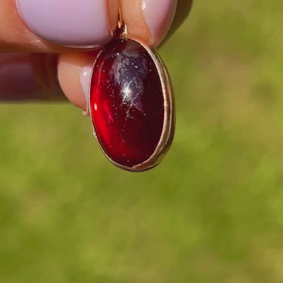 We adore this antique 9ct Gold Garnet cabochon charm! The plump 7.95ct cabochon-cut Garnet rests beautifully within a 9ct bezel, and we could almost get drunk from her dashing wine red hues.