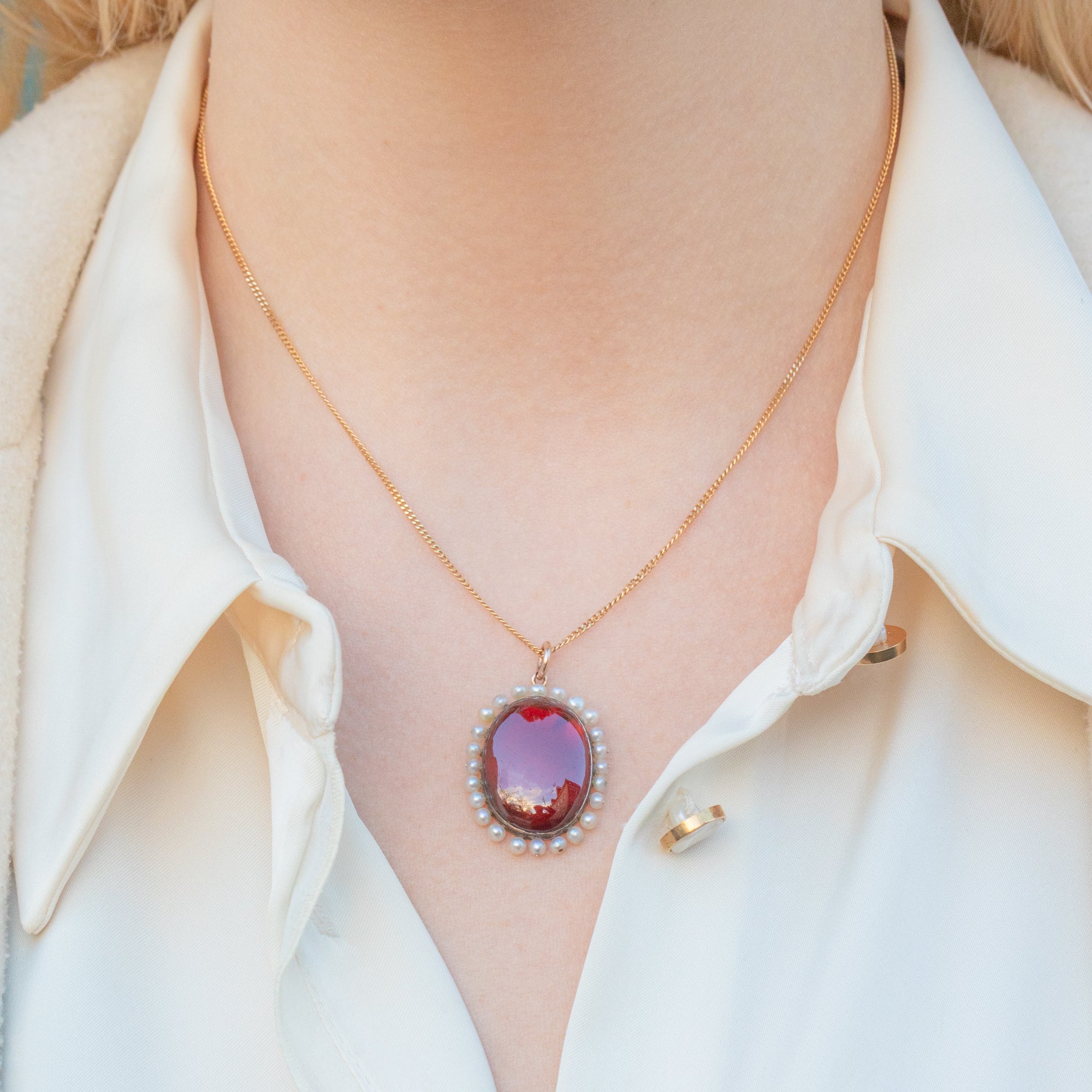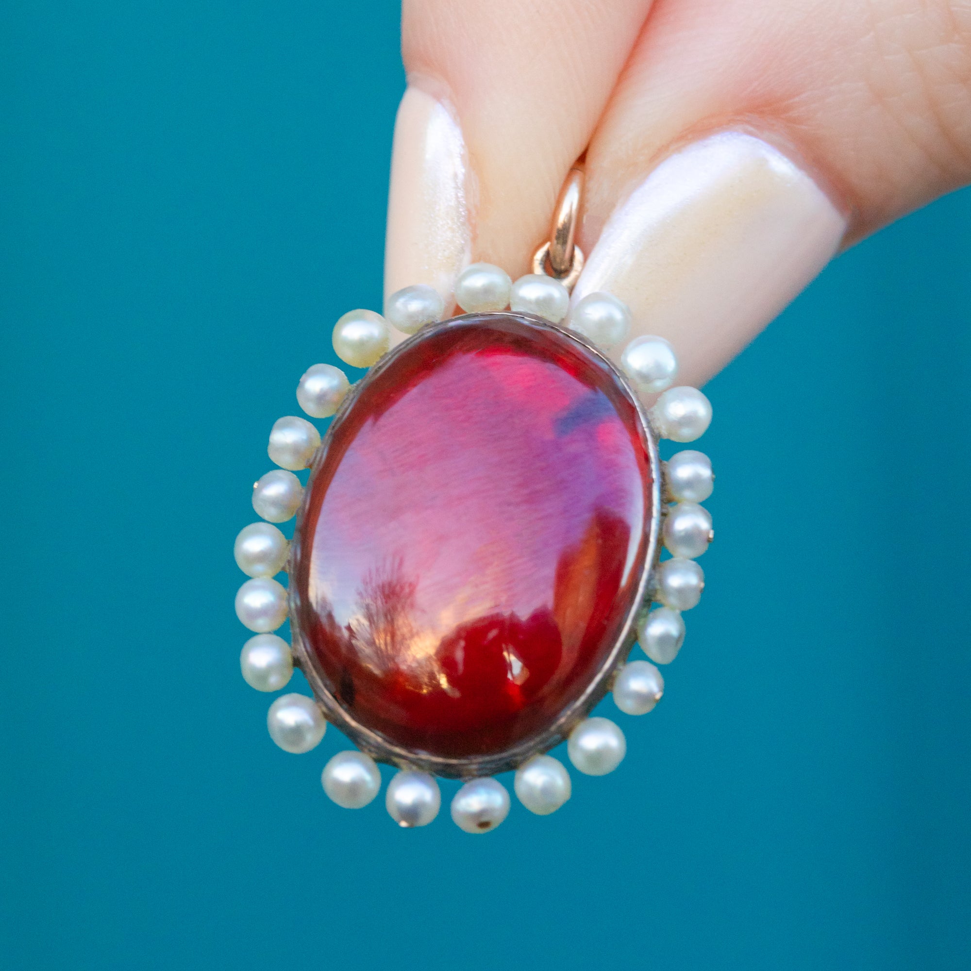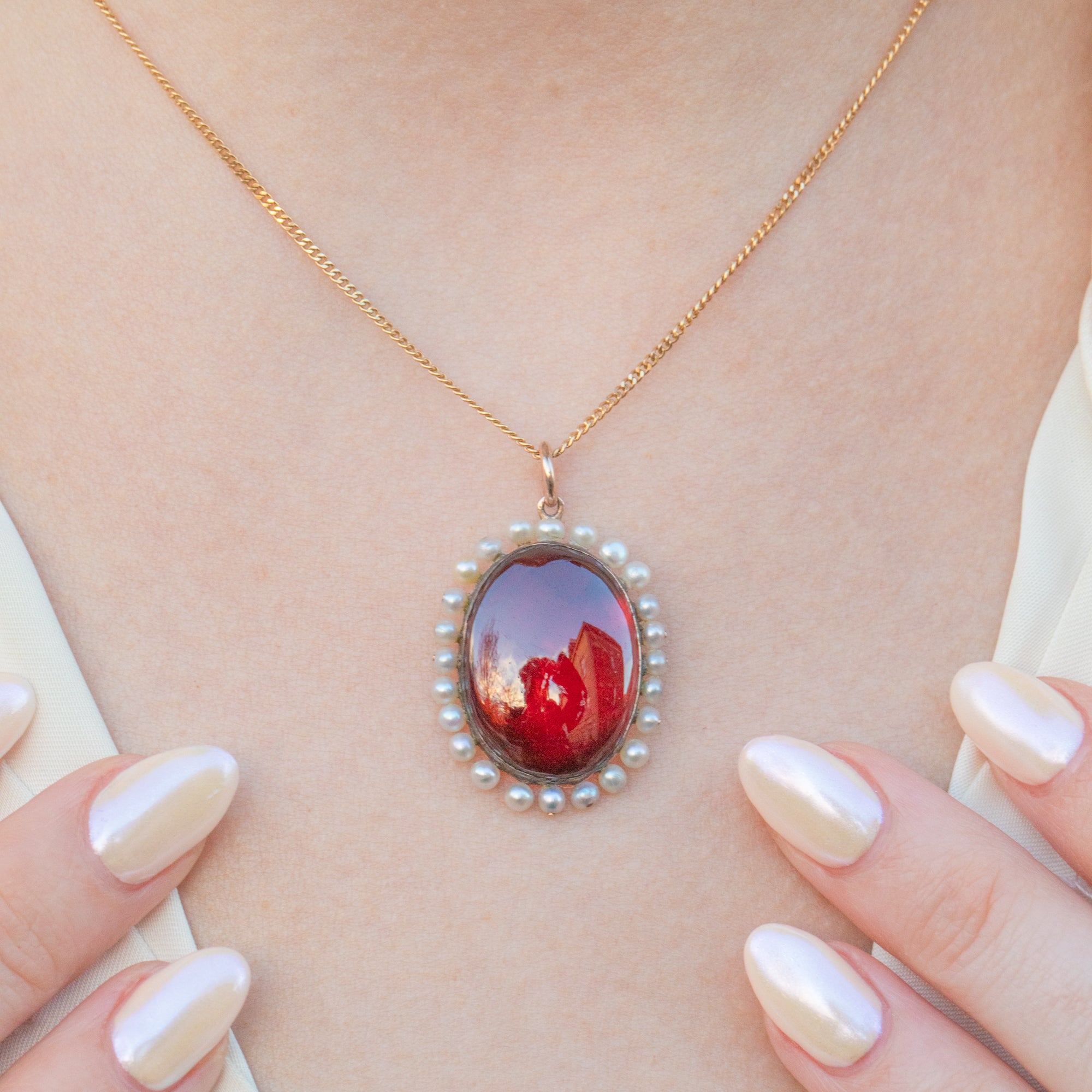 Undeniably striking and exuding Victorian charm, this antique 9ct Gold Garnet cabochon Pearl cluster pendant will make an eye-catching statement adorning your décolletage! Crafted at the turn of the 20th century this Victorian pendant displays an impressive 10.04ct Garnet, haloed by iridescent Pearls, boasting a deep red hue with flashes of bright crimson as it moves in the light.