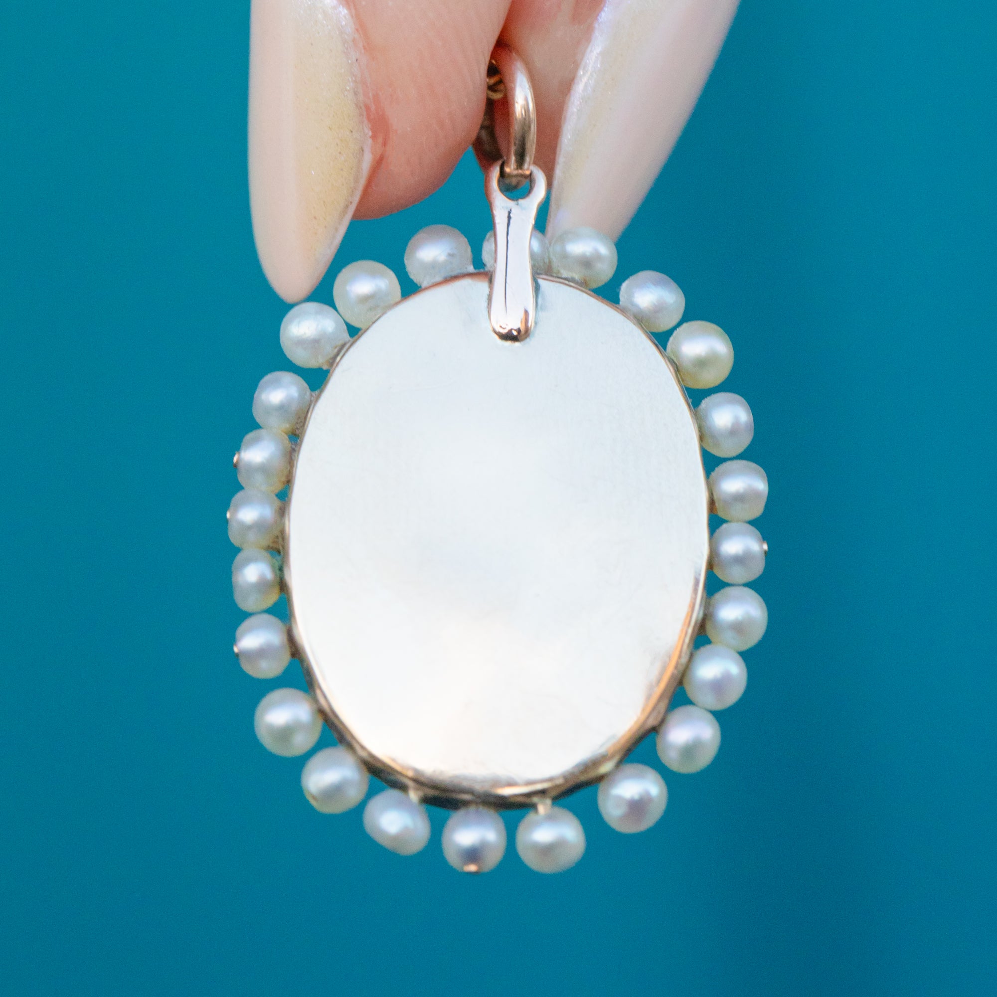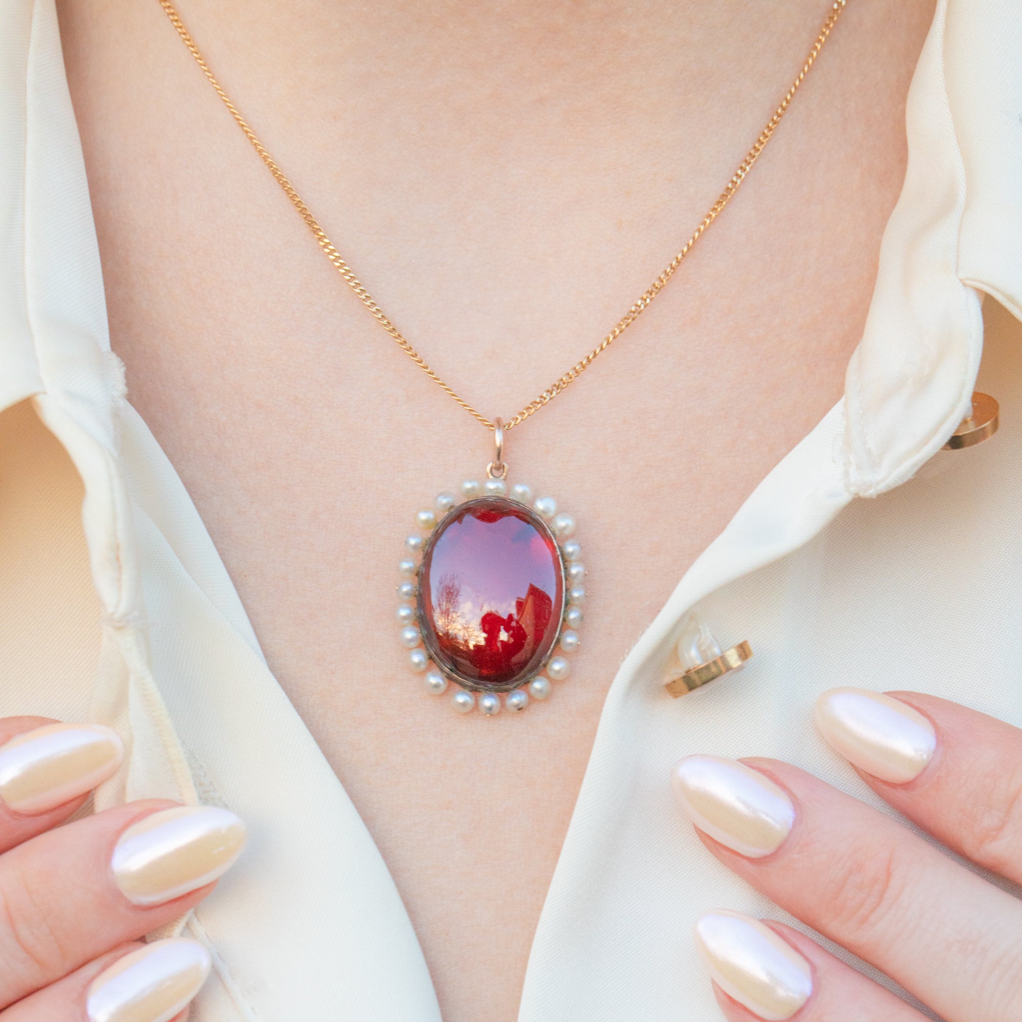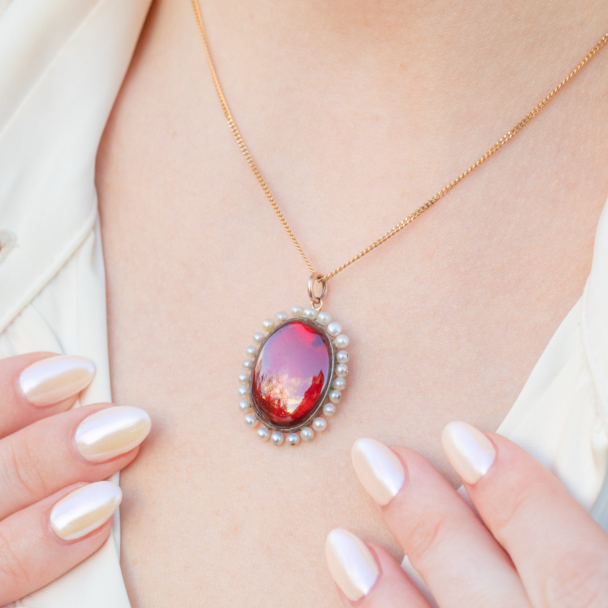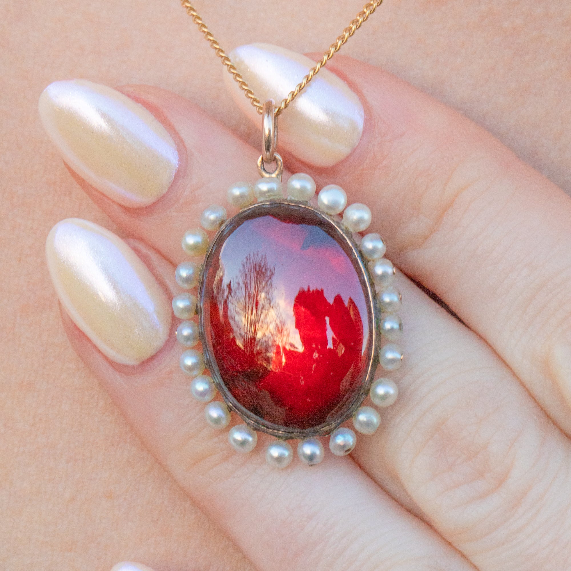 VERY GOOD. This antique 9ct Gold Garnet cabochon Pearl cluster pendant is in very good condition. The Garnet has lasted remarkably considering its grand age, with its large surface exhibiting only subtle surface wear under close inspection. The Pearls are all present and each gemstone is secure within its setting. The Gold is buttery with only some minor dings on the back, which is not noticeable from the front and does not affect the comfortability of the piece. It's important to note that this pendant should be worn with care, avoiding humid conditions due to the delicate nature of Pearls and the closed-back Garnet setting. Treated and worn with care, this Victorian Garnet pendant will provide you with years of wear and enjoyment!