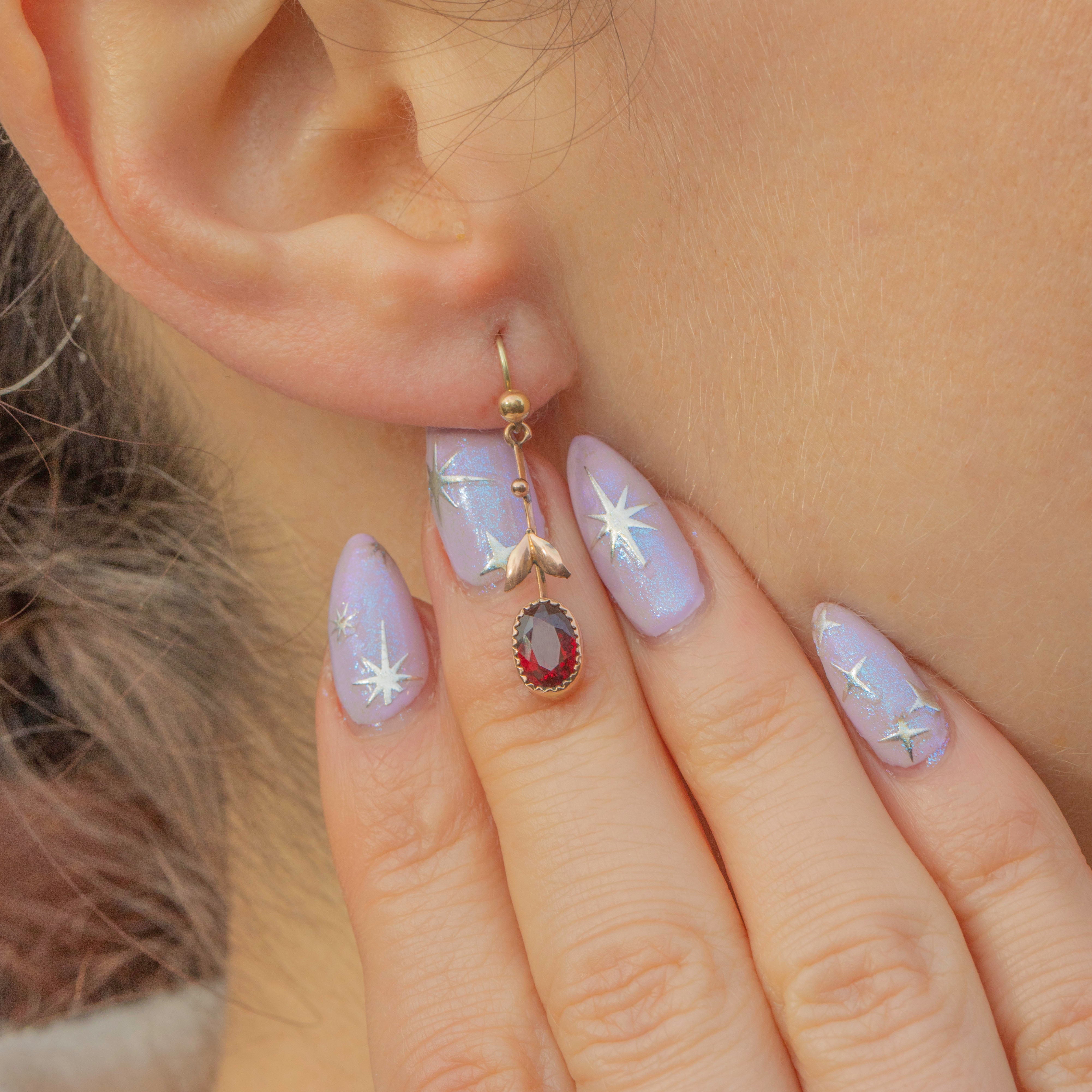 Crafted from buttery 9ct Gold, each Edwardian drop earring features a stunning Garnet, radiating gorgeous deep scarlet hues as they catch the light. Each earring is complete with leaf details adorning the Garnet, making them into dainty floral motifs.