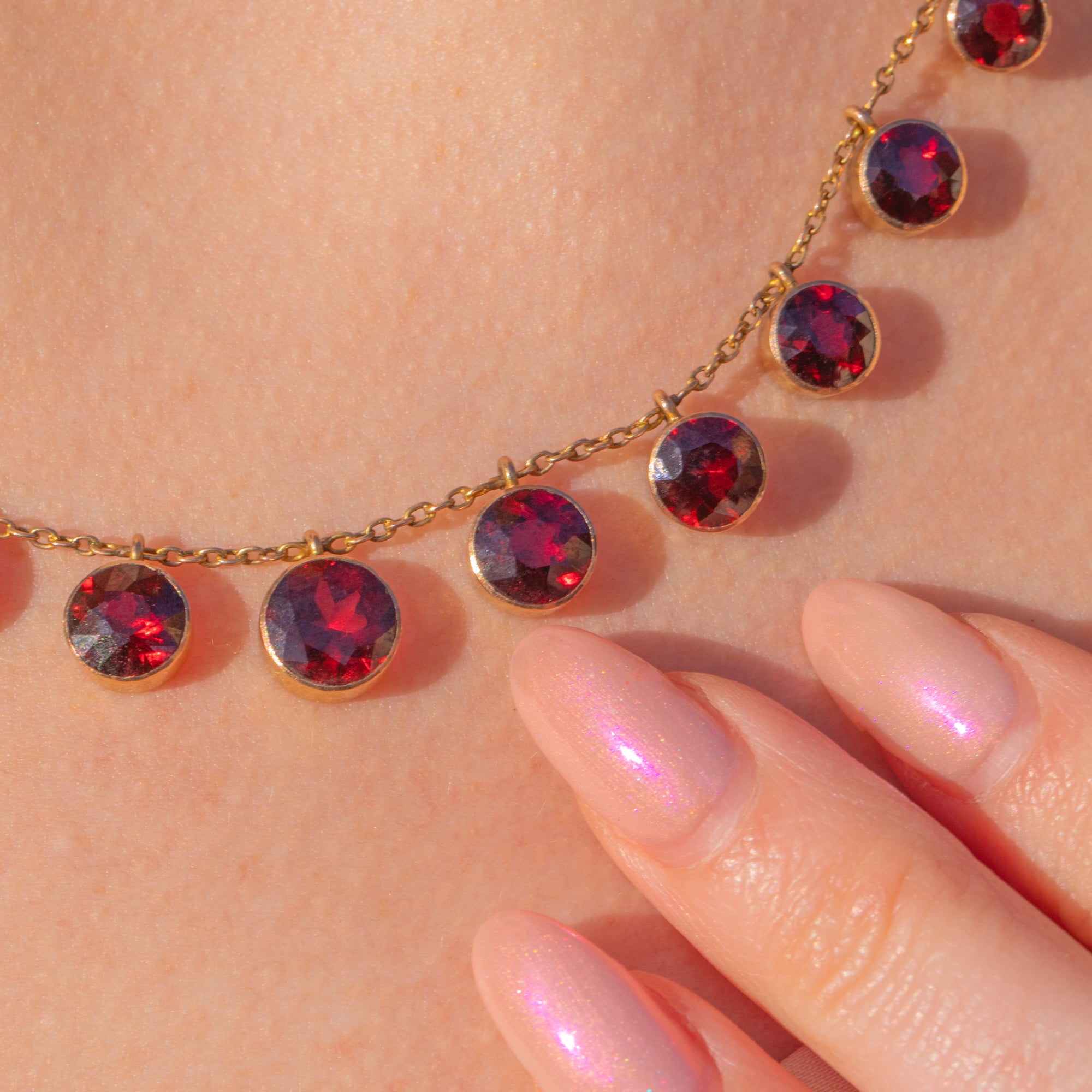 Boasting a combined weight of 11.30ct, this fringe necklace features graduating Garnets, each faceted wonderfully catching the light to reveal rich scarlet hues. Her Garnets sit within buttery 9ct Gold bezels and are suspended from a delicate chain, draping delicately across your décolletage.