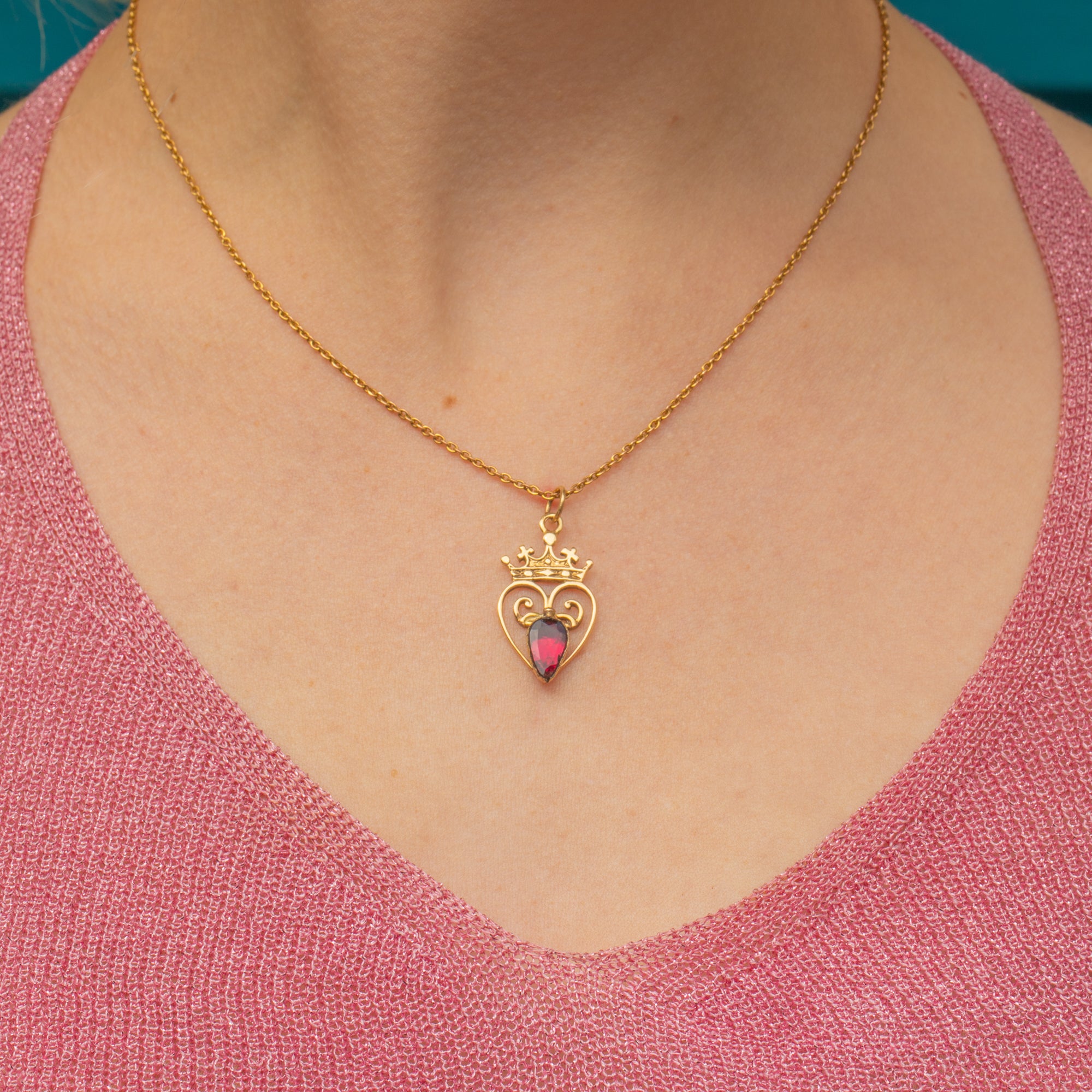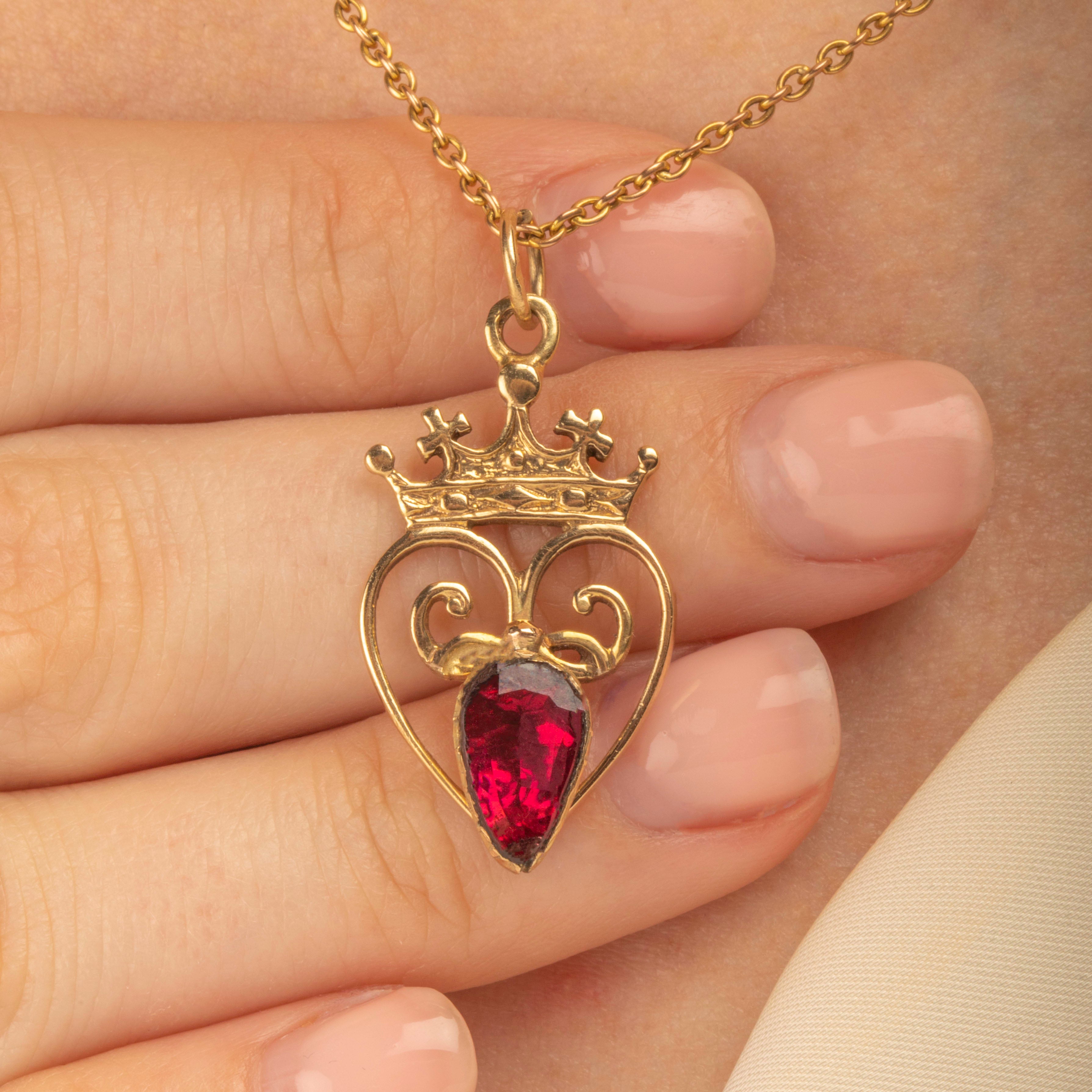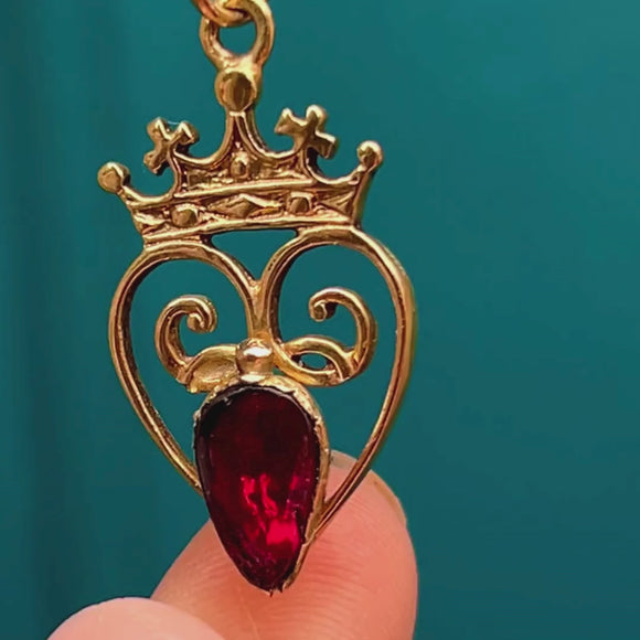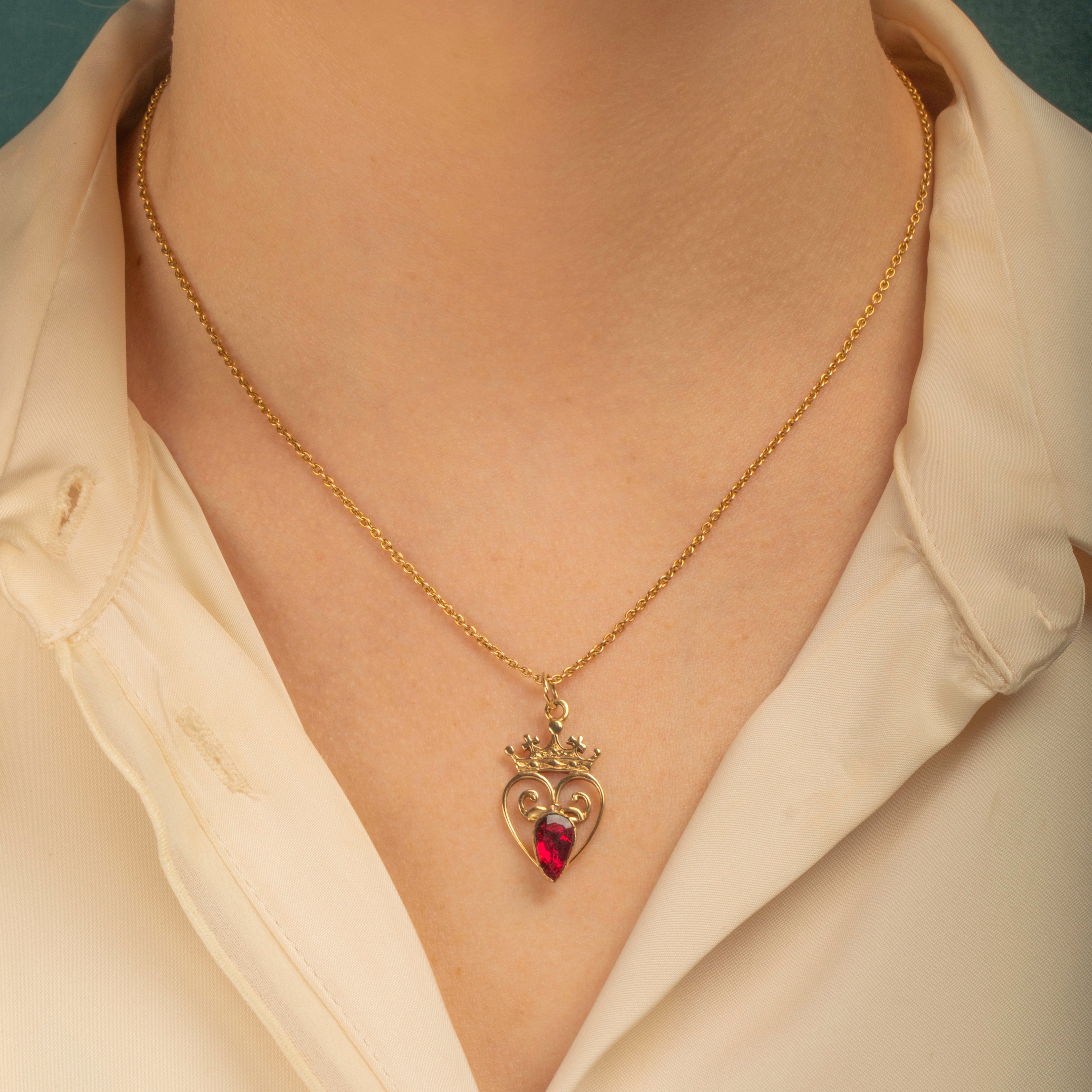 This antique 9ct Gold Garnet heart pendant exudes regality! Centred around a flat-cut Garnet, flaunting a myriad of crimson glistens, she is surrounded by a whimsical heart topped proudly by a crown.