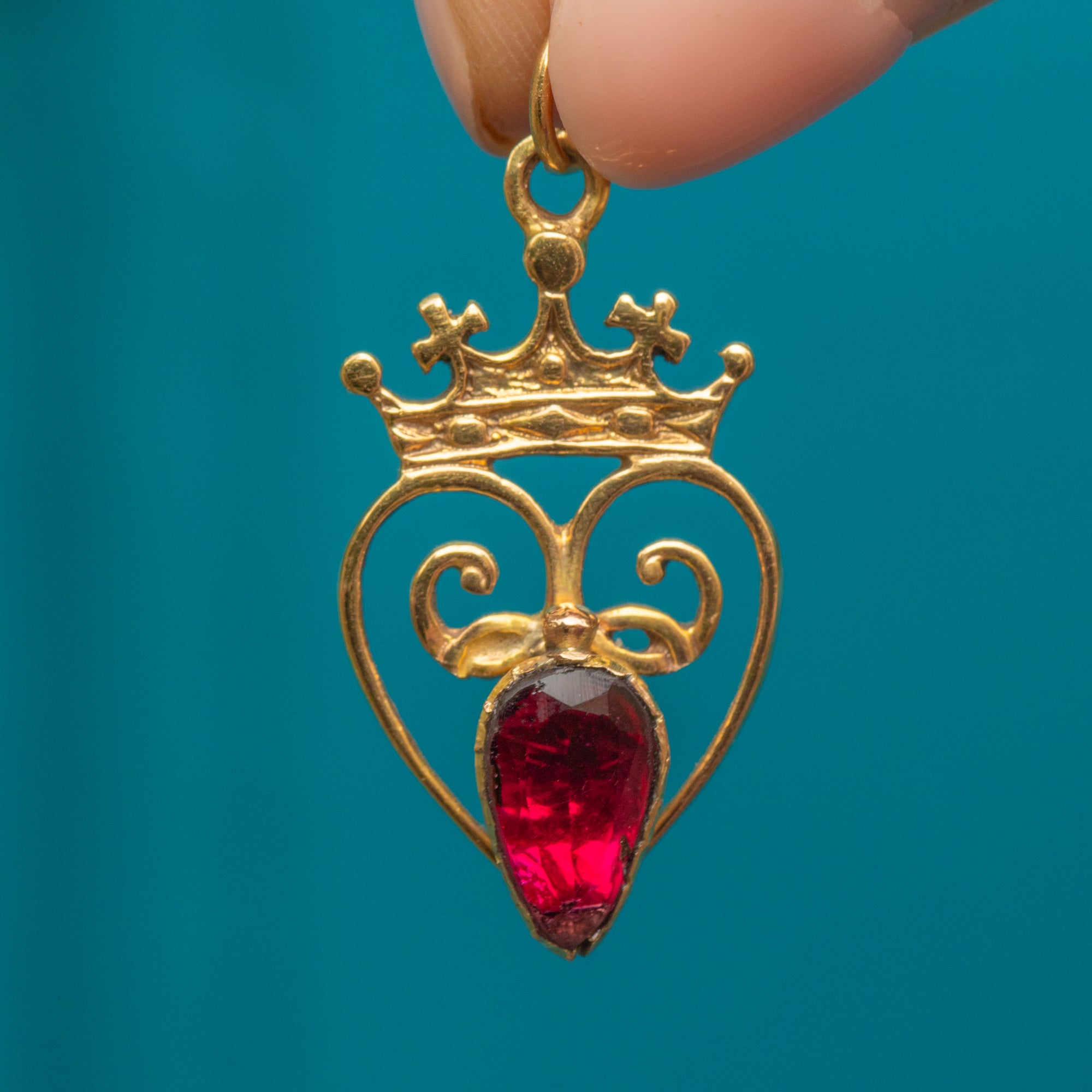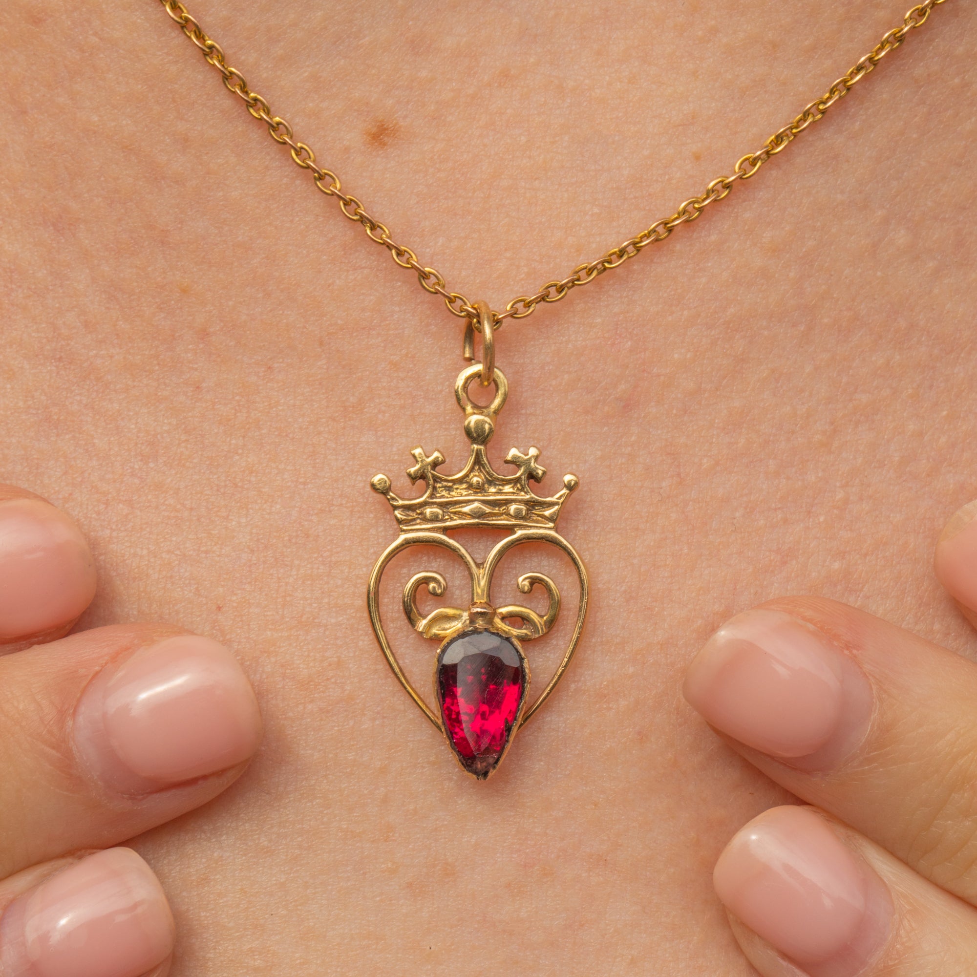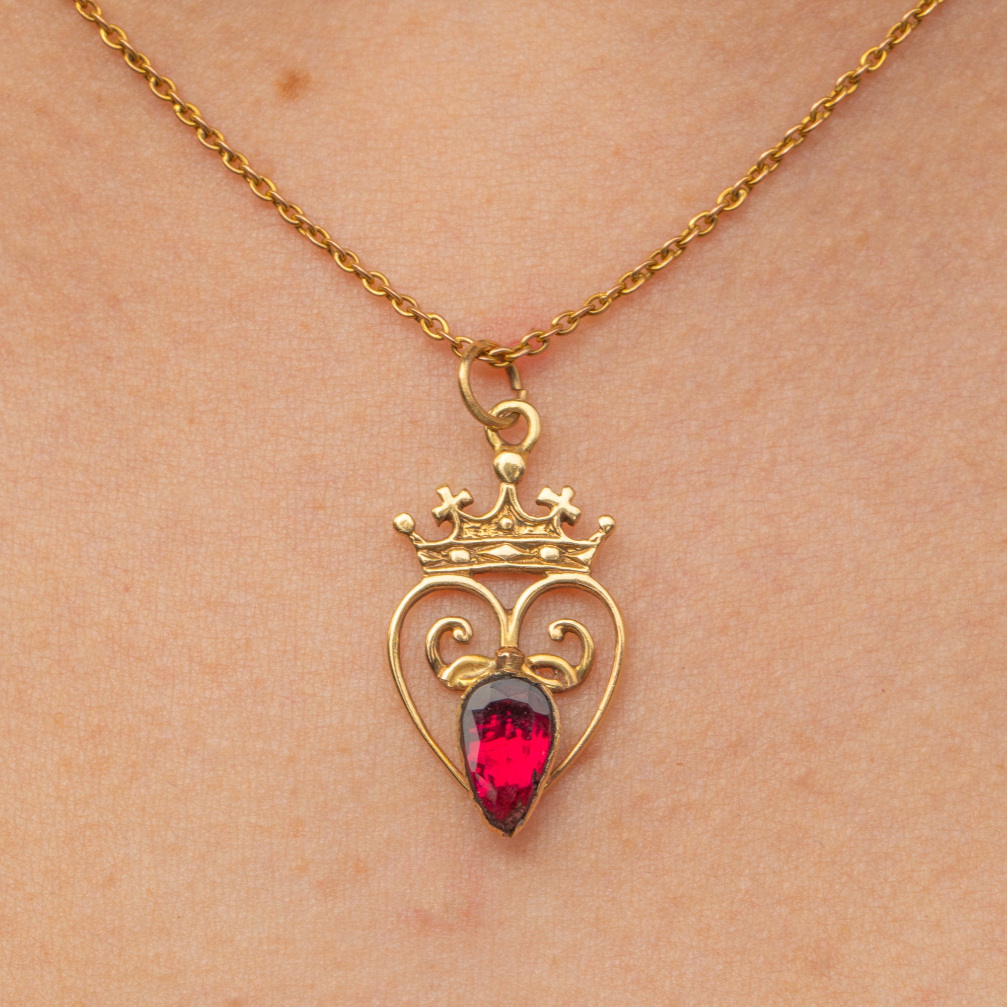This antique 9ct Gold Garnet heart pendant exudes regality! Centred around a flat-cut Garnet, flaunting a myriad of crimson glistens, she is surrounded by a whimsical heart topped proudly by a crown.