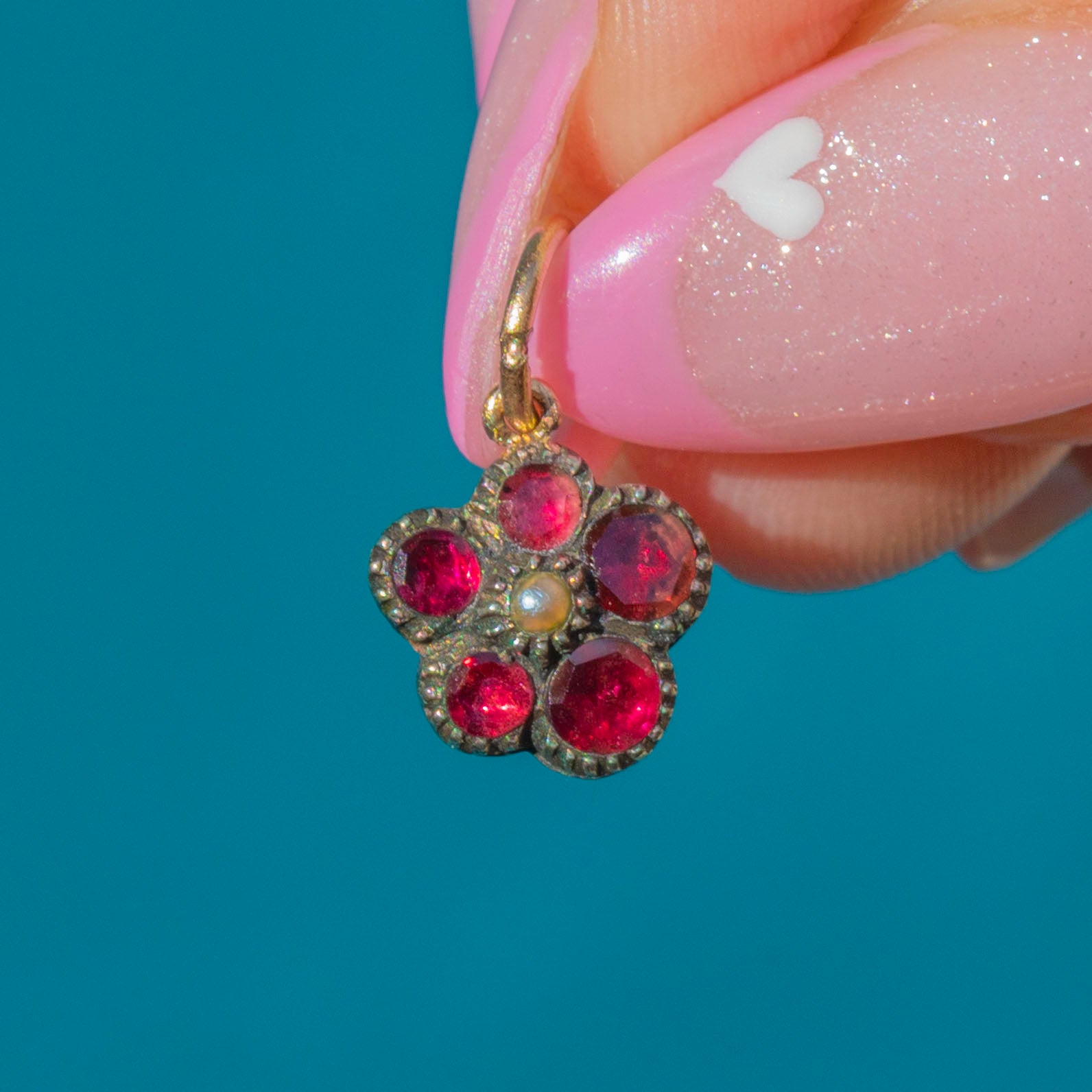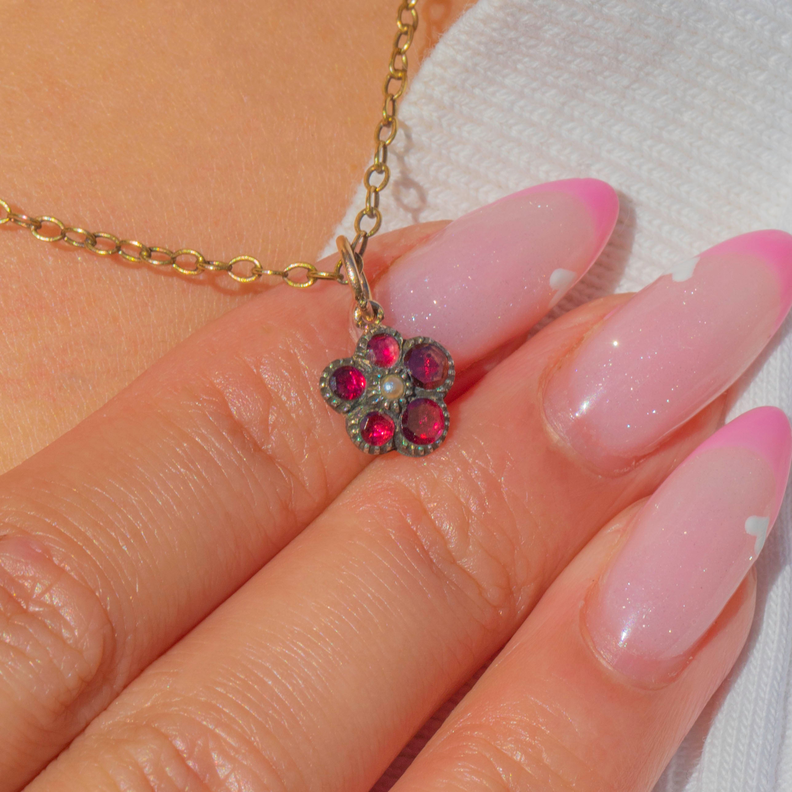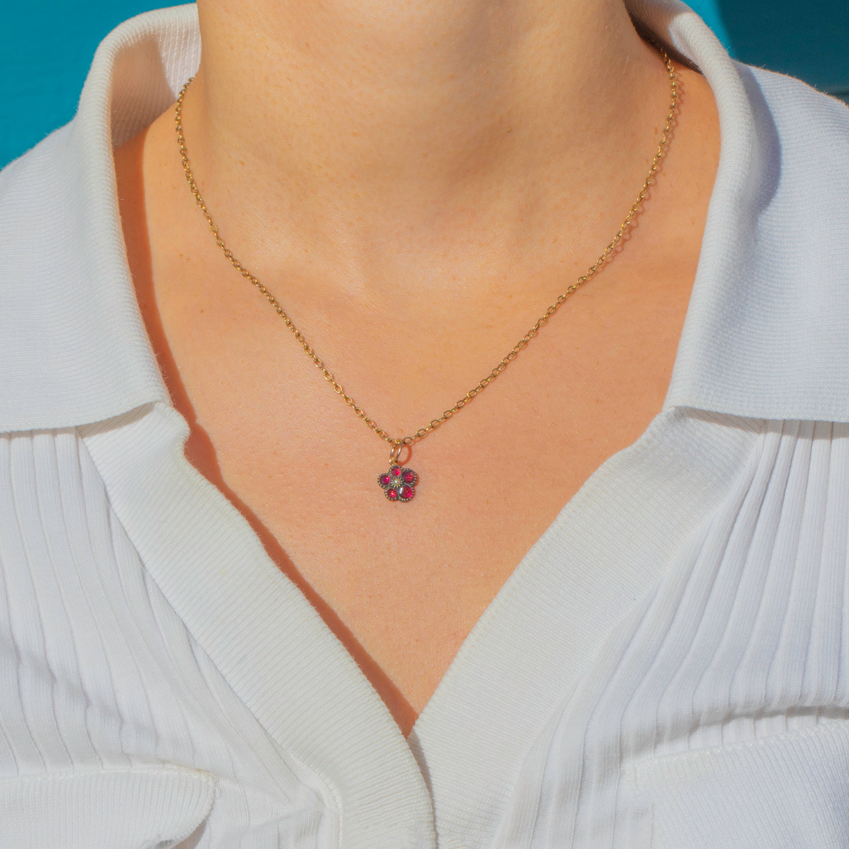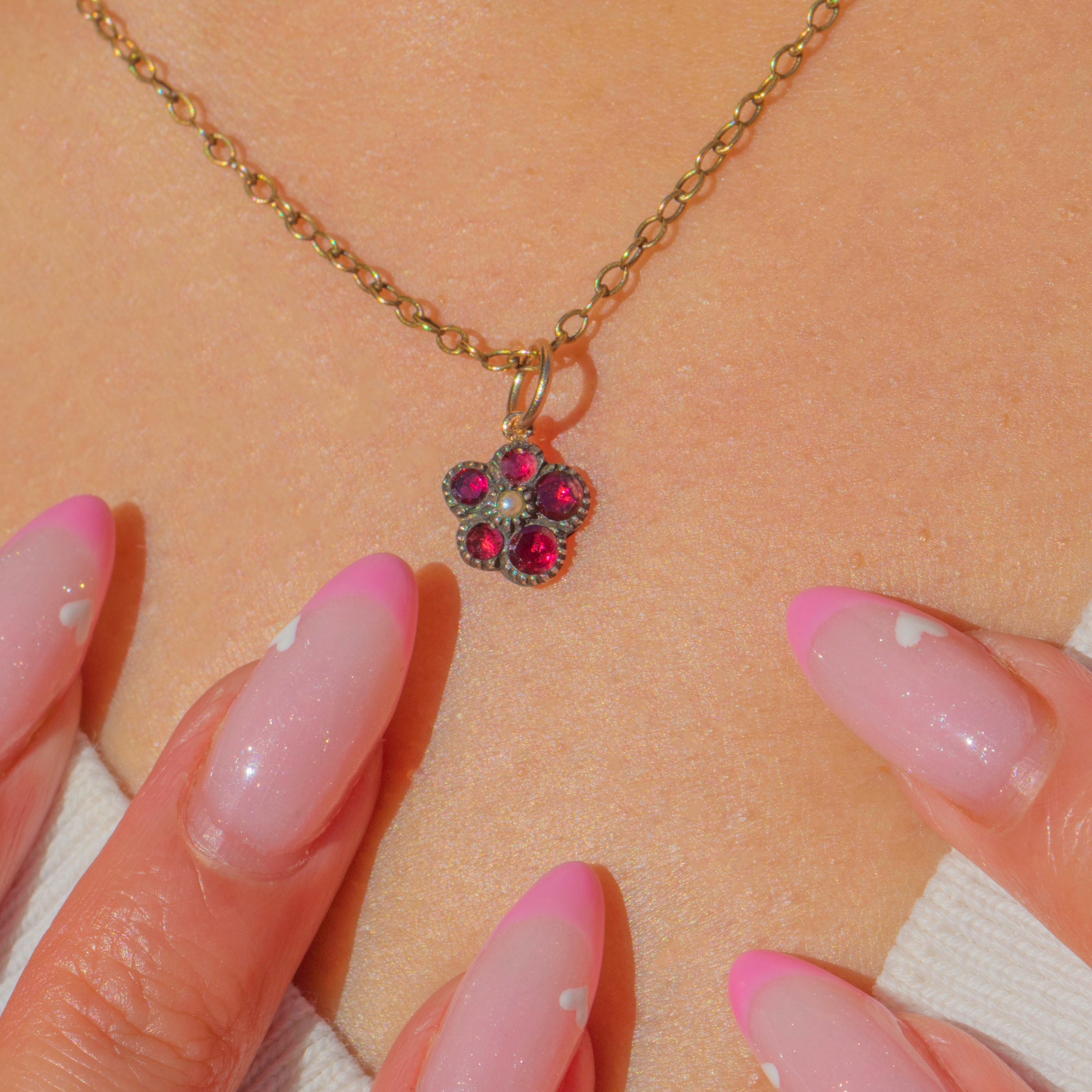 A sweet Victorian pansy charm crafted in 9ct Gold, set with glowing red Garnets and a single Pearl at the centre. The pansy was a cherished Victorian symbol of love and remembrance, making this tiny jewel both sentimental and beautiful.