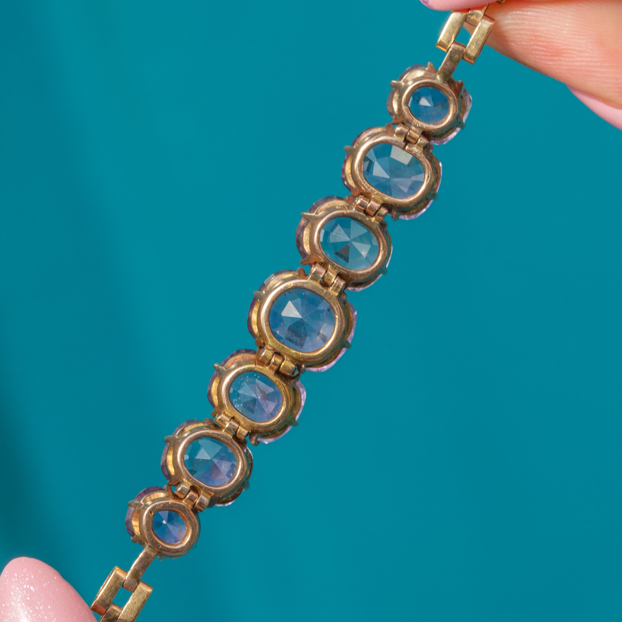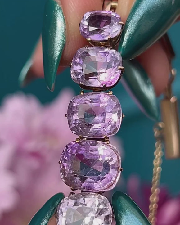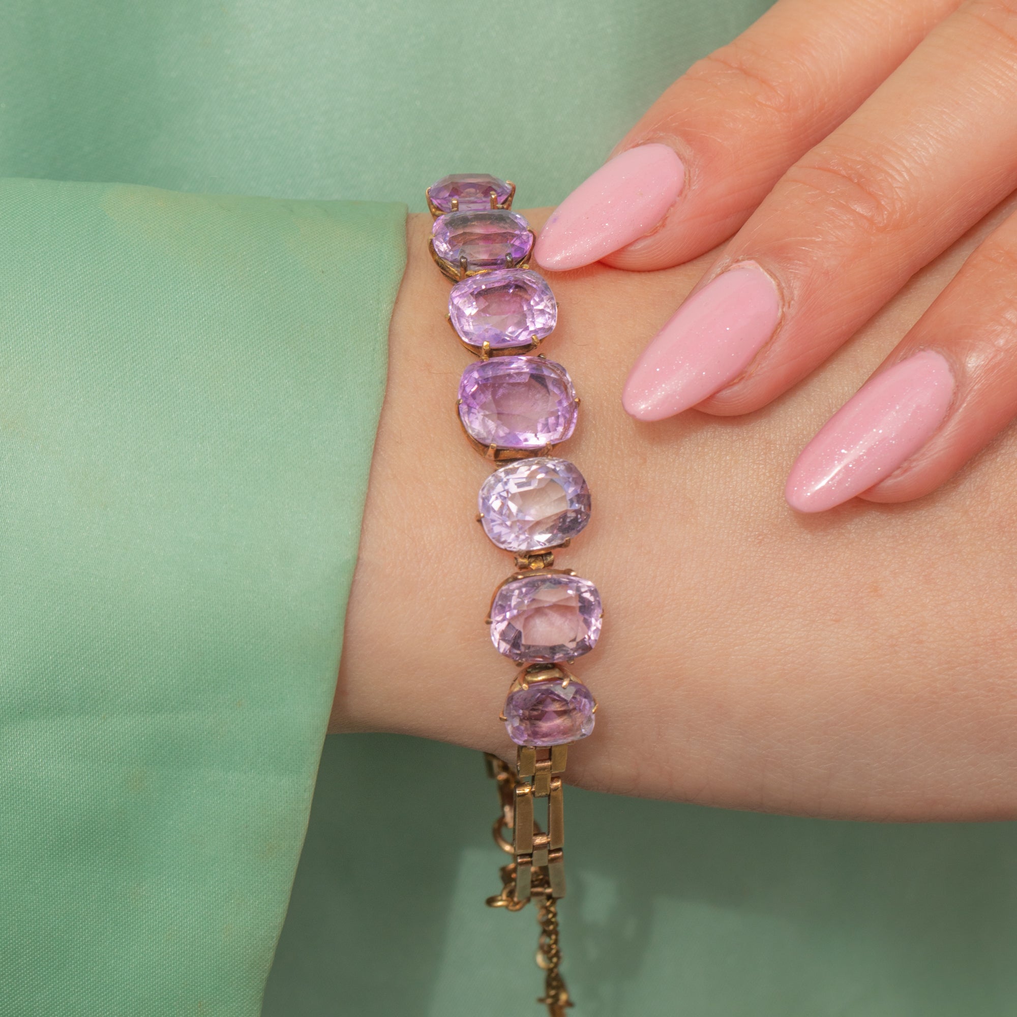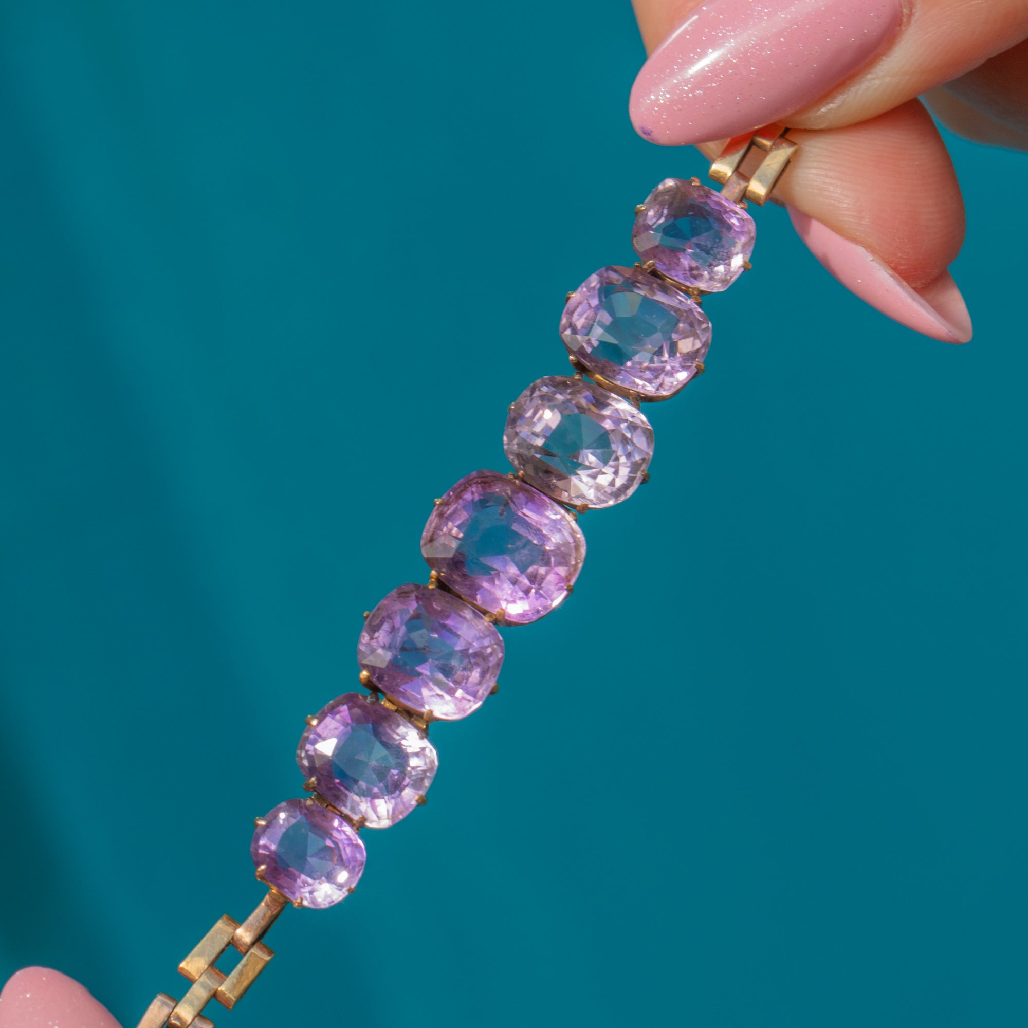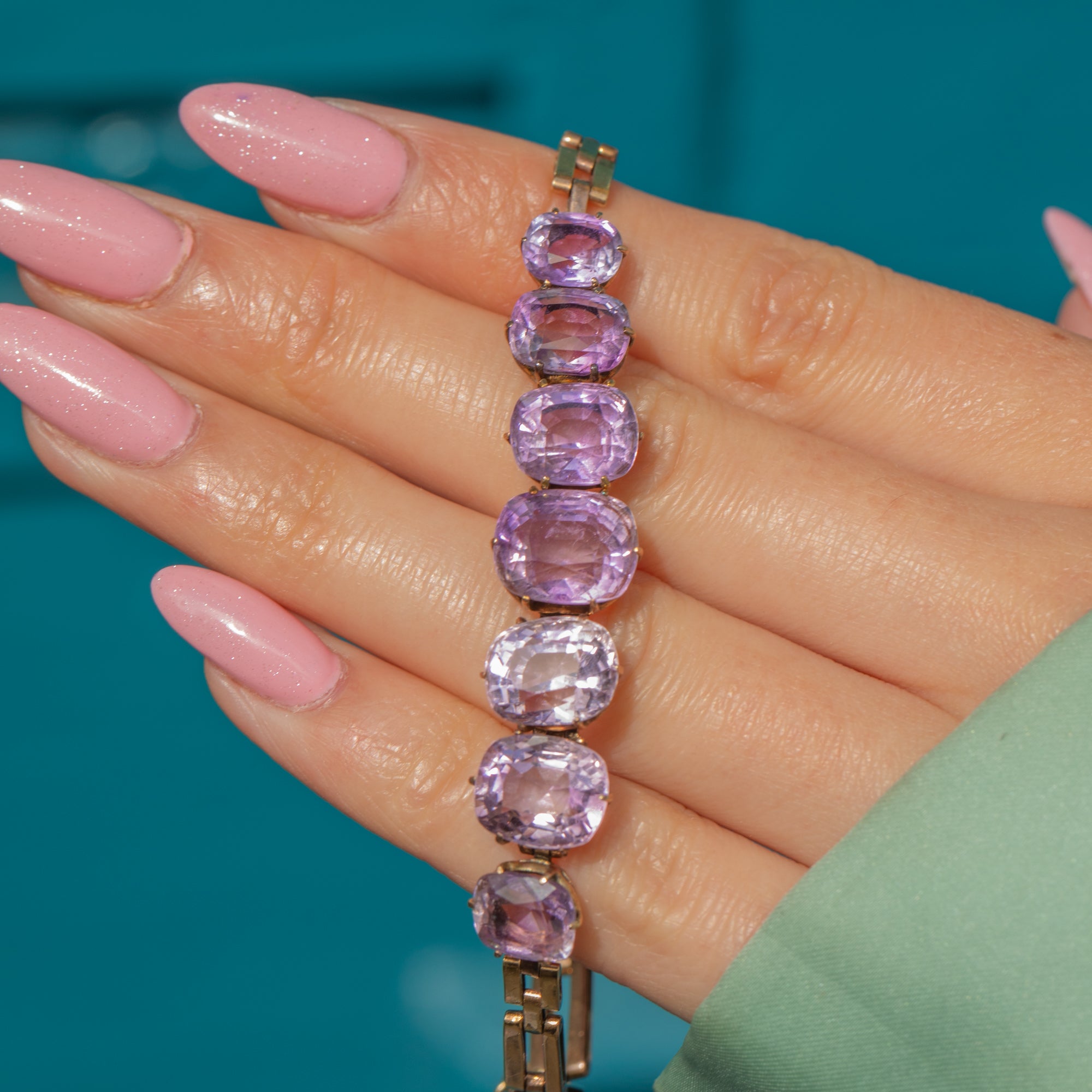 Channel your inner princess with this antique 9ct Gold graduating Amethyst bracelet! Boasting seven lavender-hued Amethysts totalling an incredible 38.70ct spread, she is nothing short of regal as she hugs your wrist.