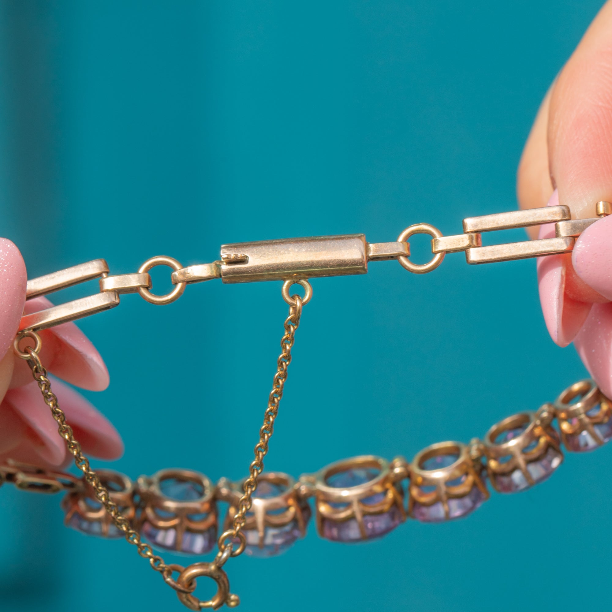 VERY GOOD: This antique 9ct Gold graduating Amethyst bracelet is in very good condition. Each Amethyst boasts crisp facets, and although there is some surface wear to some of the Amethysts, this is only noticeable under close inspection. The barrell clasp shuts tightly with a safety chain for extra security, you can wear this Victorian Amethyst bracelet with the utmost confidence!
