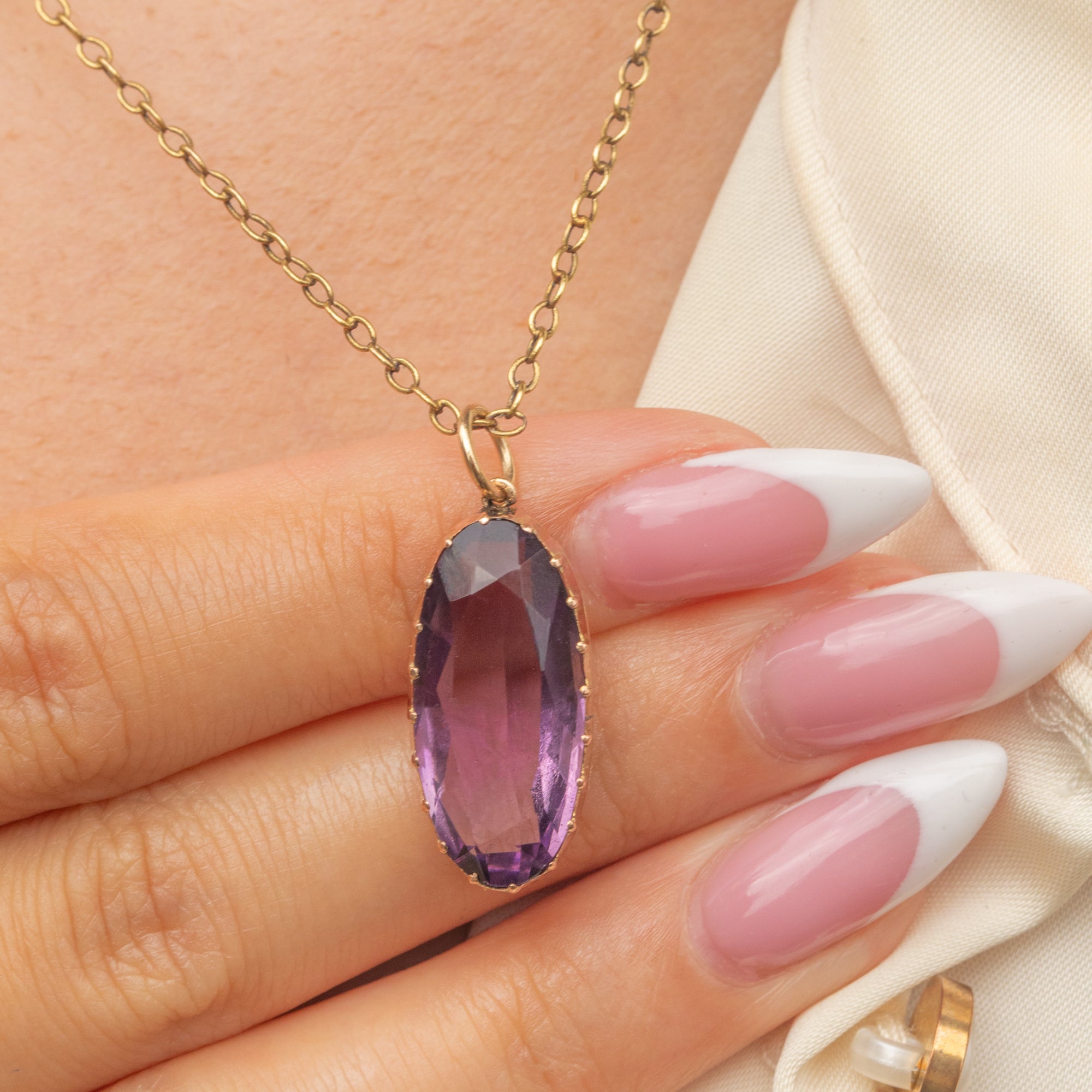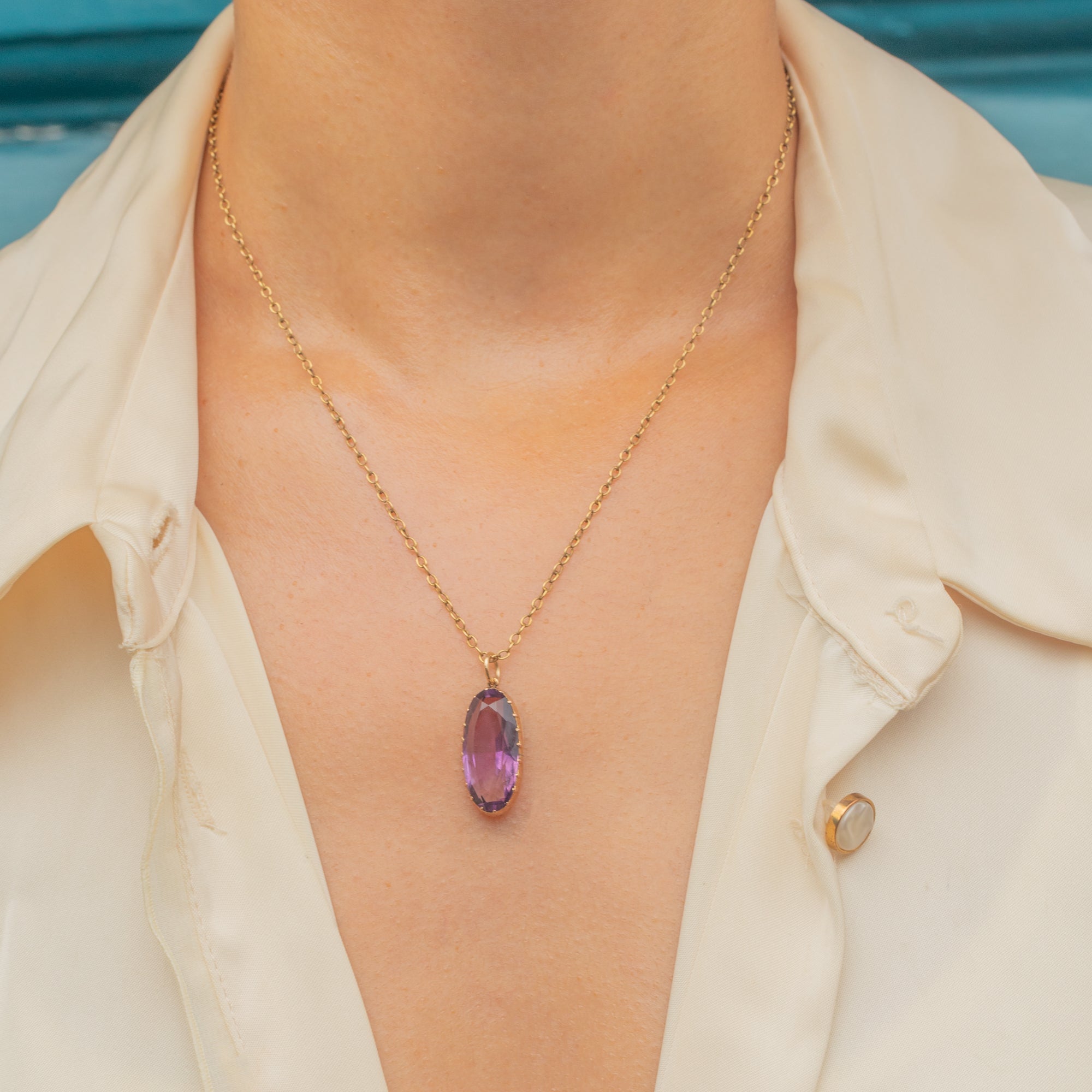 This elegant Edwardian pendant is crafted in 9ct Gold and set with a luscious oval-cut Amethyst of deep grape-purple hue. The sizeable 5.44ct gemstone is beautifully proportioned, allowing the rich colour and natural sparkle to shine.