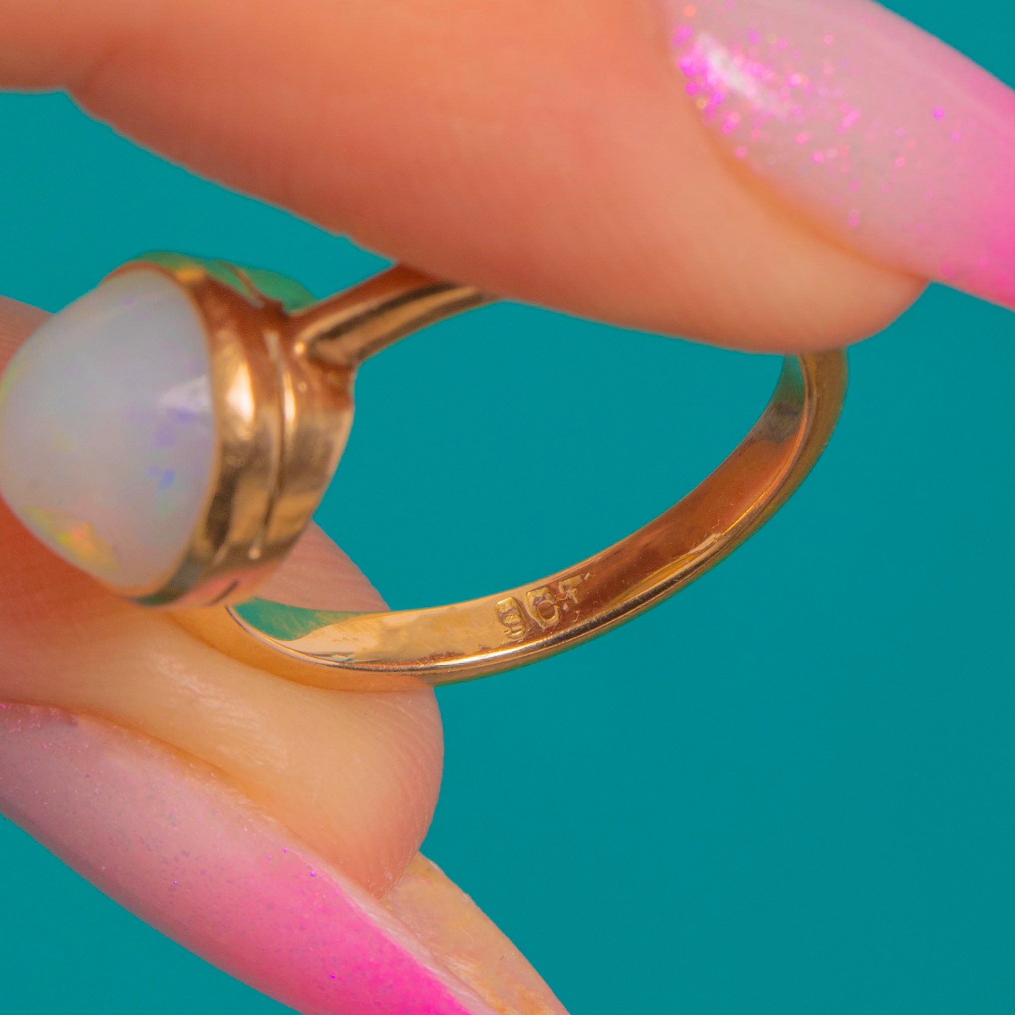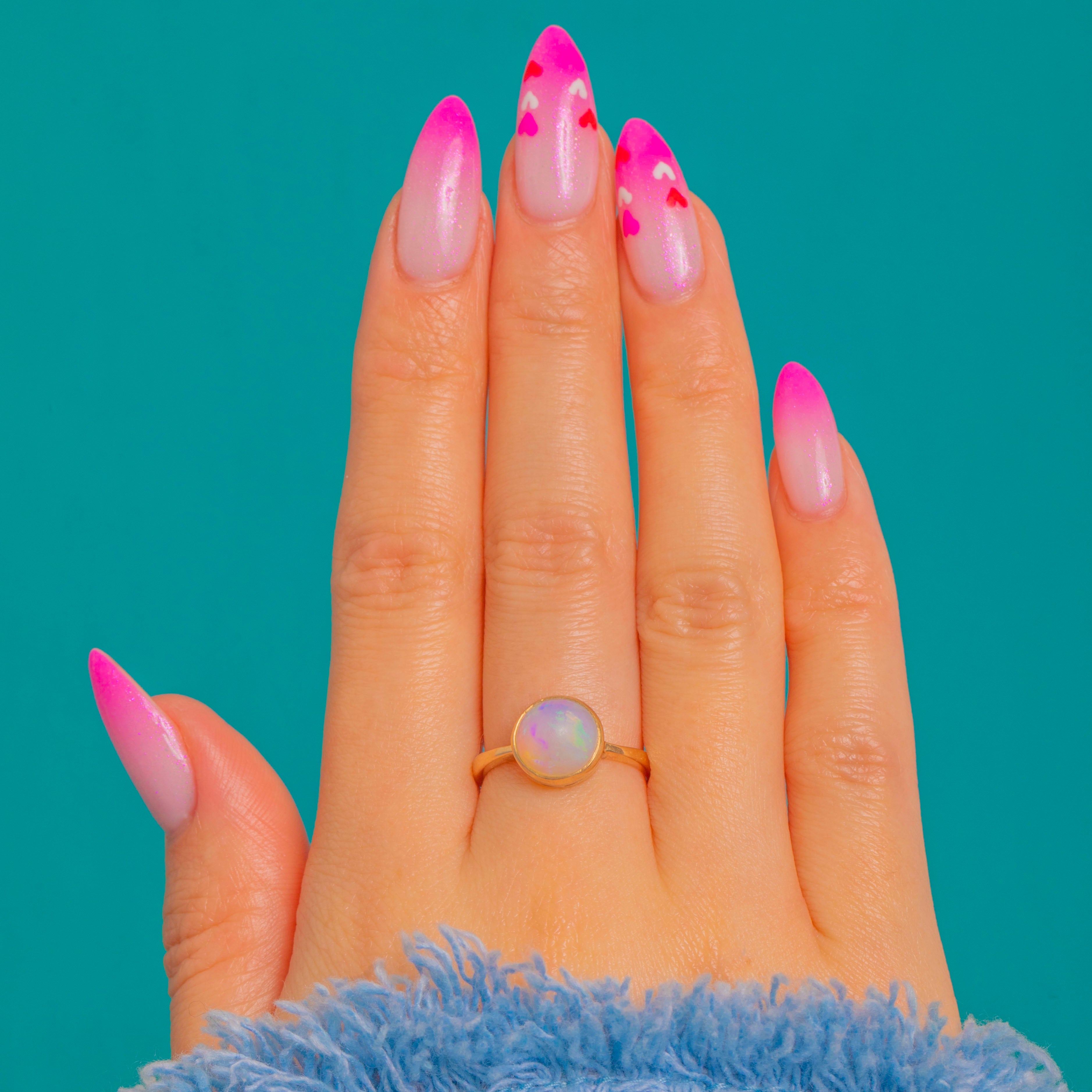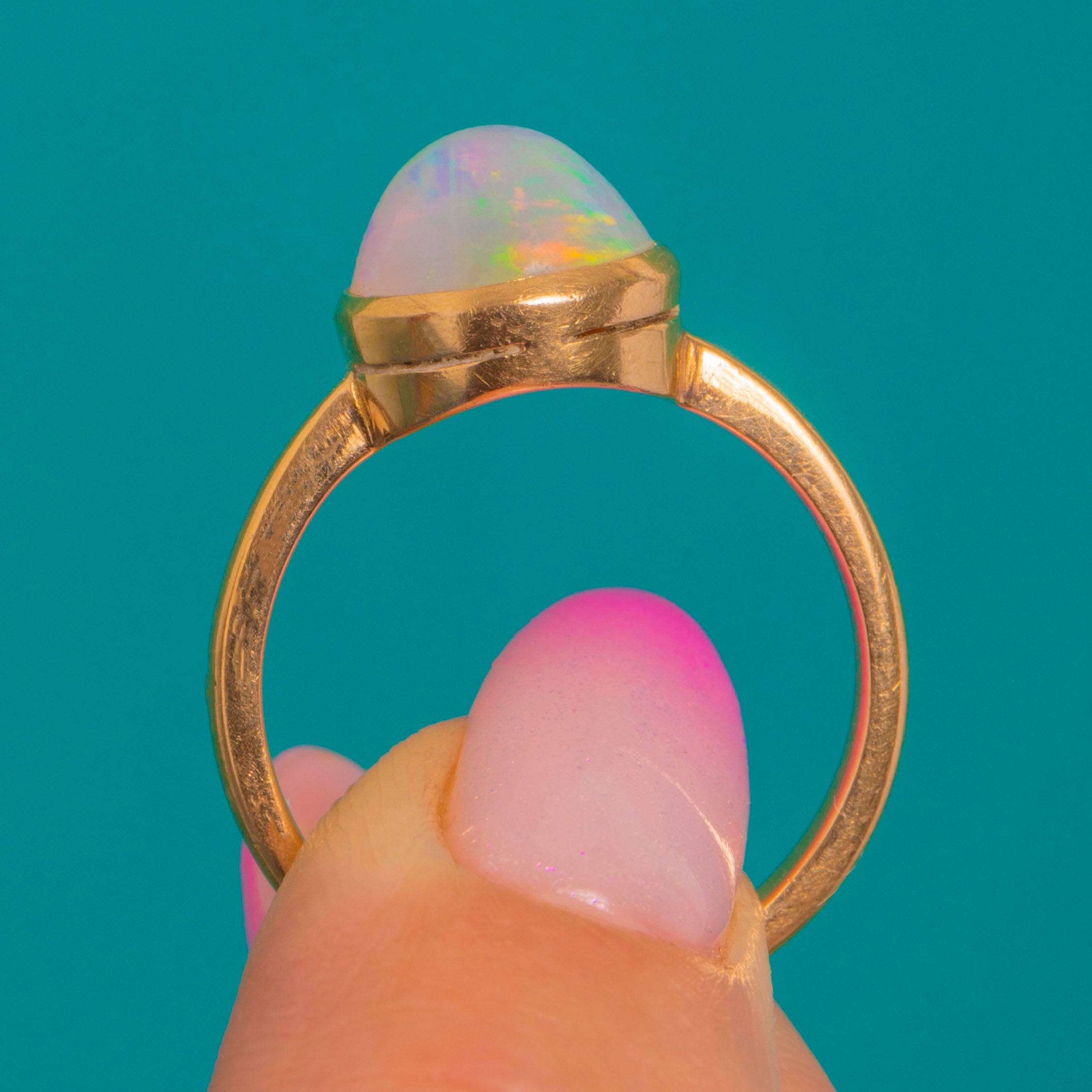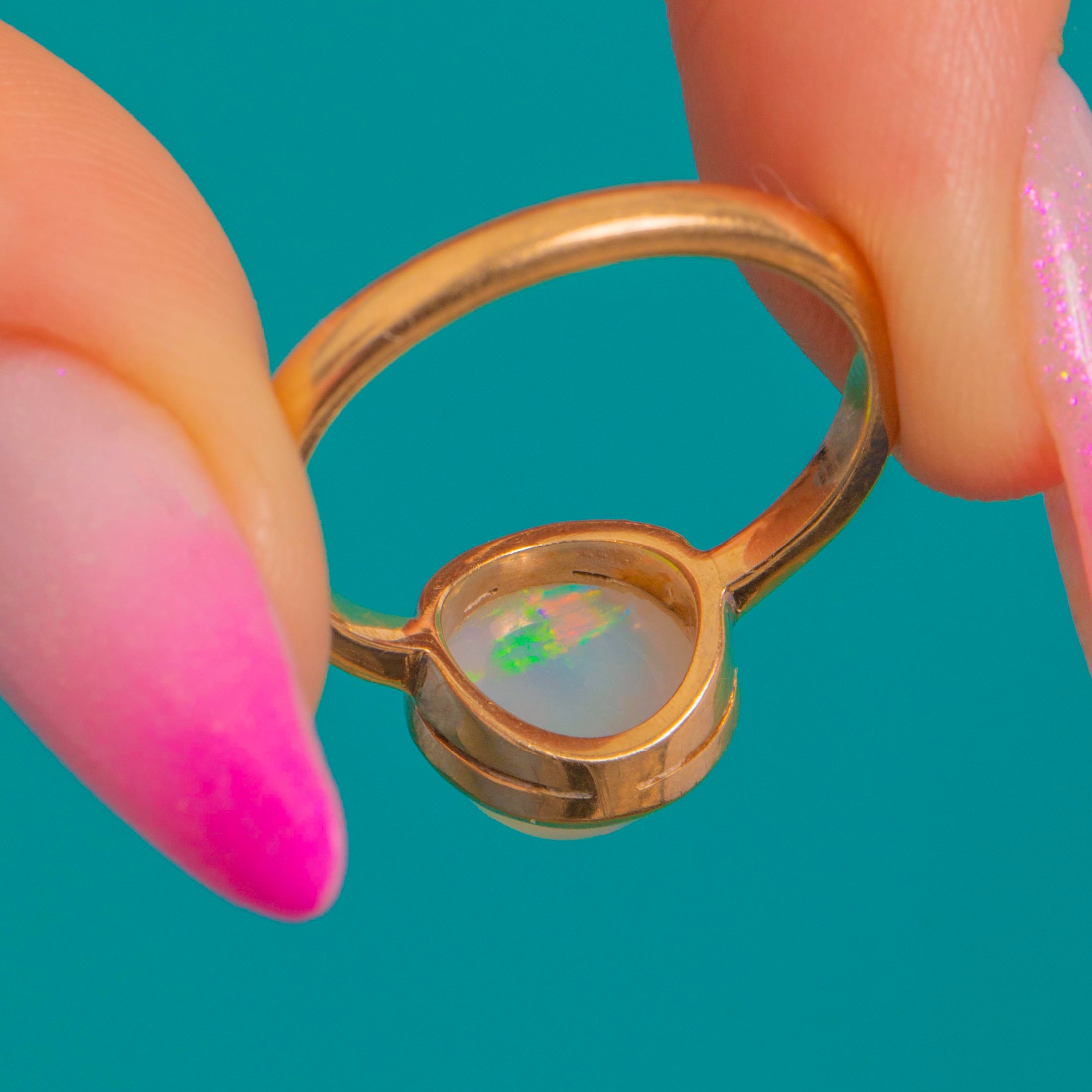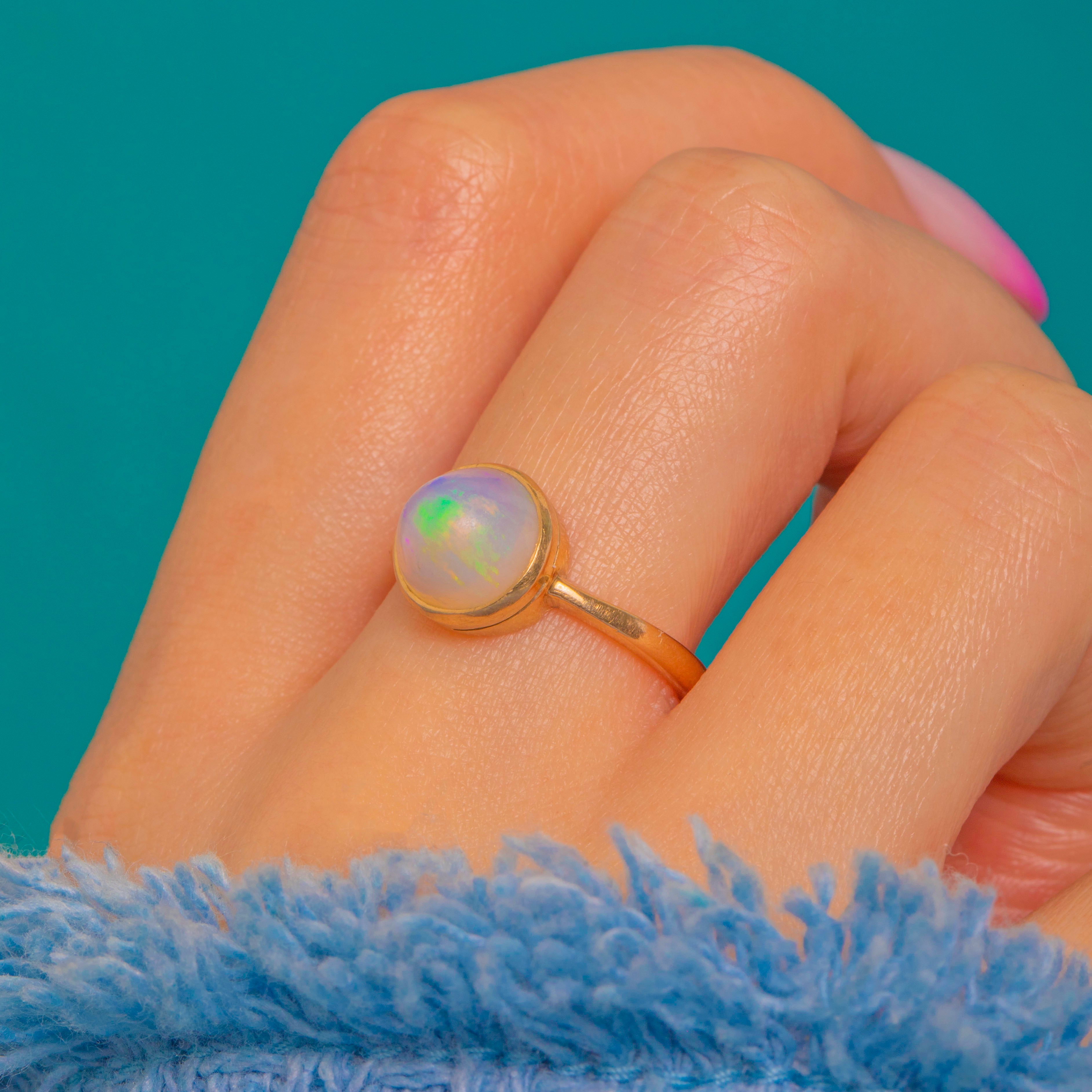EXCELLENT: The Opal is bright with a smooth domed surface and no visible chips or cracks. The 9ct Gold bezel and slender shank are crisp with only fine surface marks commensurate with age. Overall beautifully preserved and ready to wear.