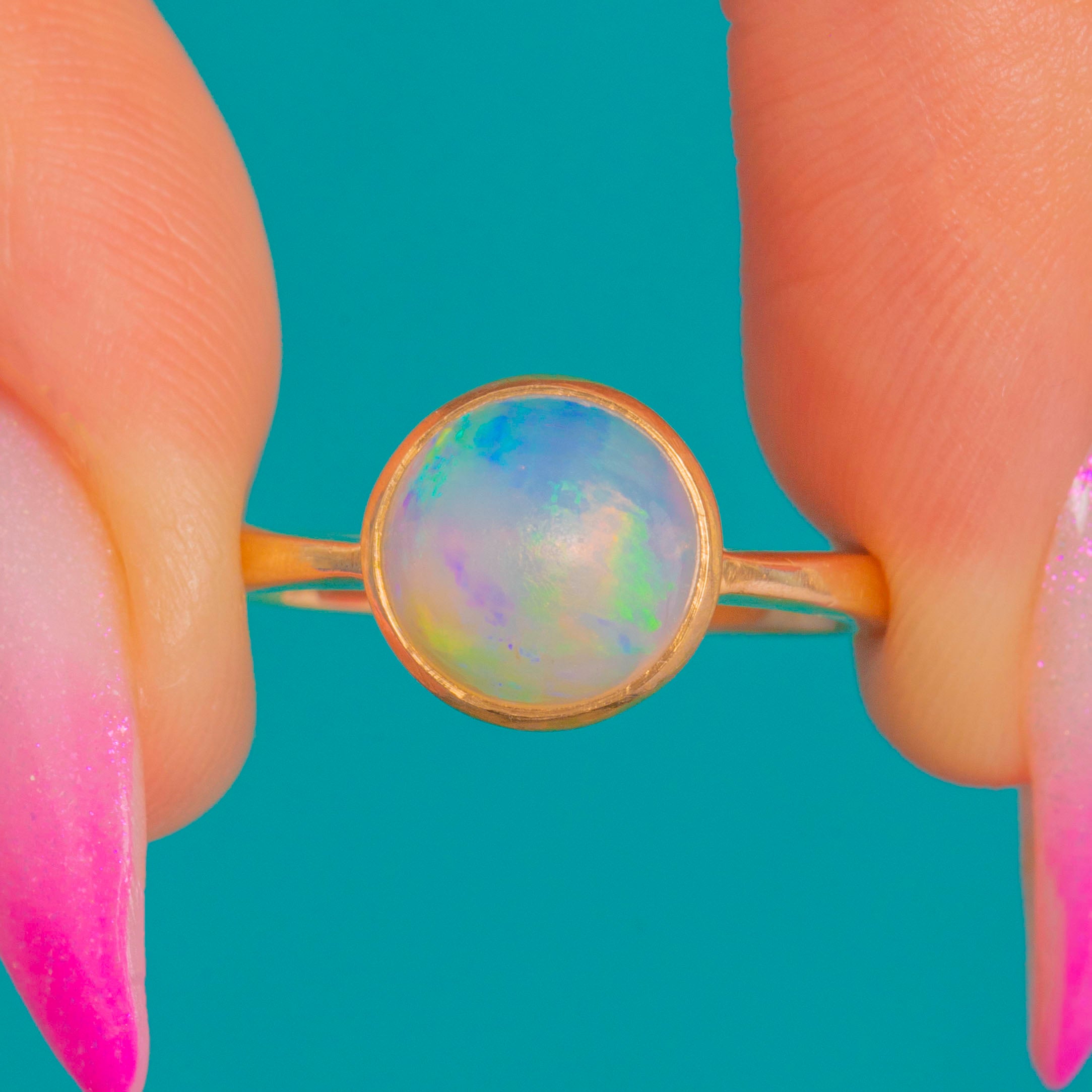 A luminous antique Opal solitaire, crafted in 9ct Gold with timeless Victorian poise. The high-domed cabochon shimmers with an enchanting play-of-colour—flashes of green, blue, pink and lilac dance beneath the surface—nestled securely within a smooth, full bezel for an elegant, effortless silhouette.