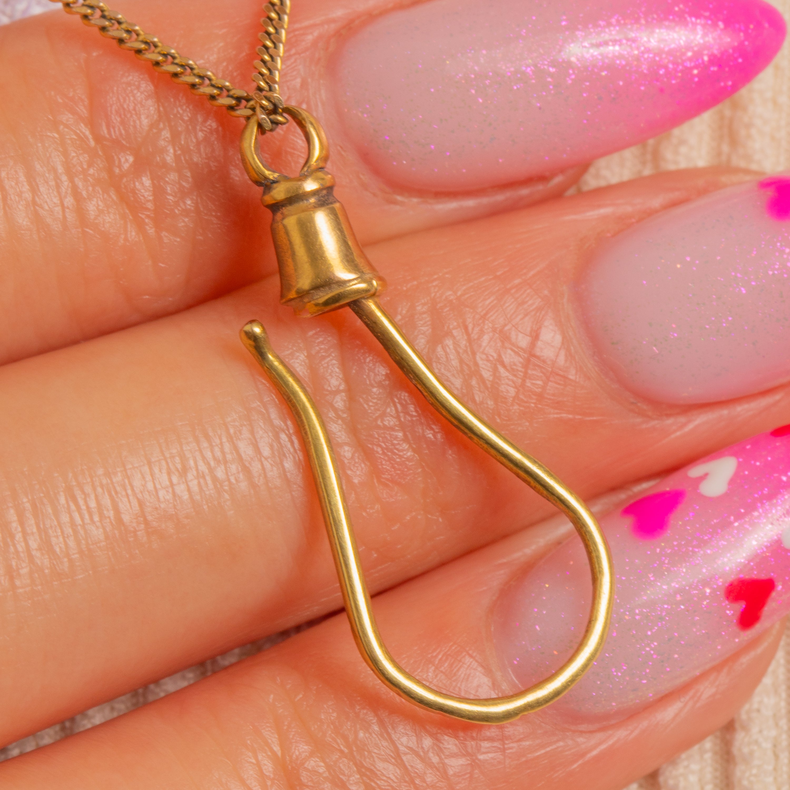 Sleek, sculptural and irresistibly understated, this Victorian 9ct Gold hook pendant distils elegance into a single fluid line. Formed from a slender wire into a graceful teardrop, it’s finished with a petite flared cap and oval jump ring that add a subtle flourish without disturbing the clean silhouette.