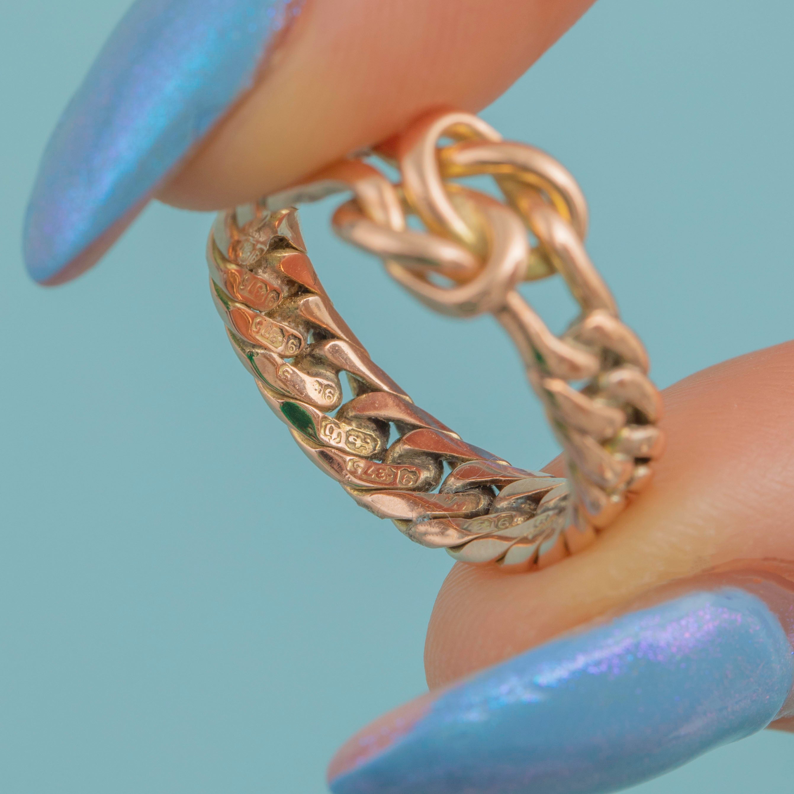 Crafted from rosy 9ct Gold, this Victorian ring is features a lover's knot in her centre, with a gorgeous woven curb link ring band to finish, providing texture and depth.