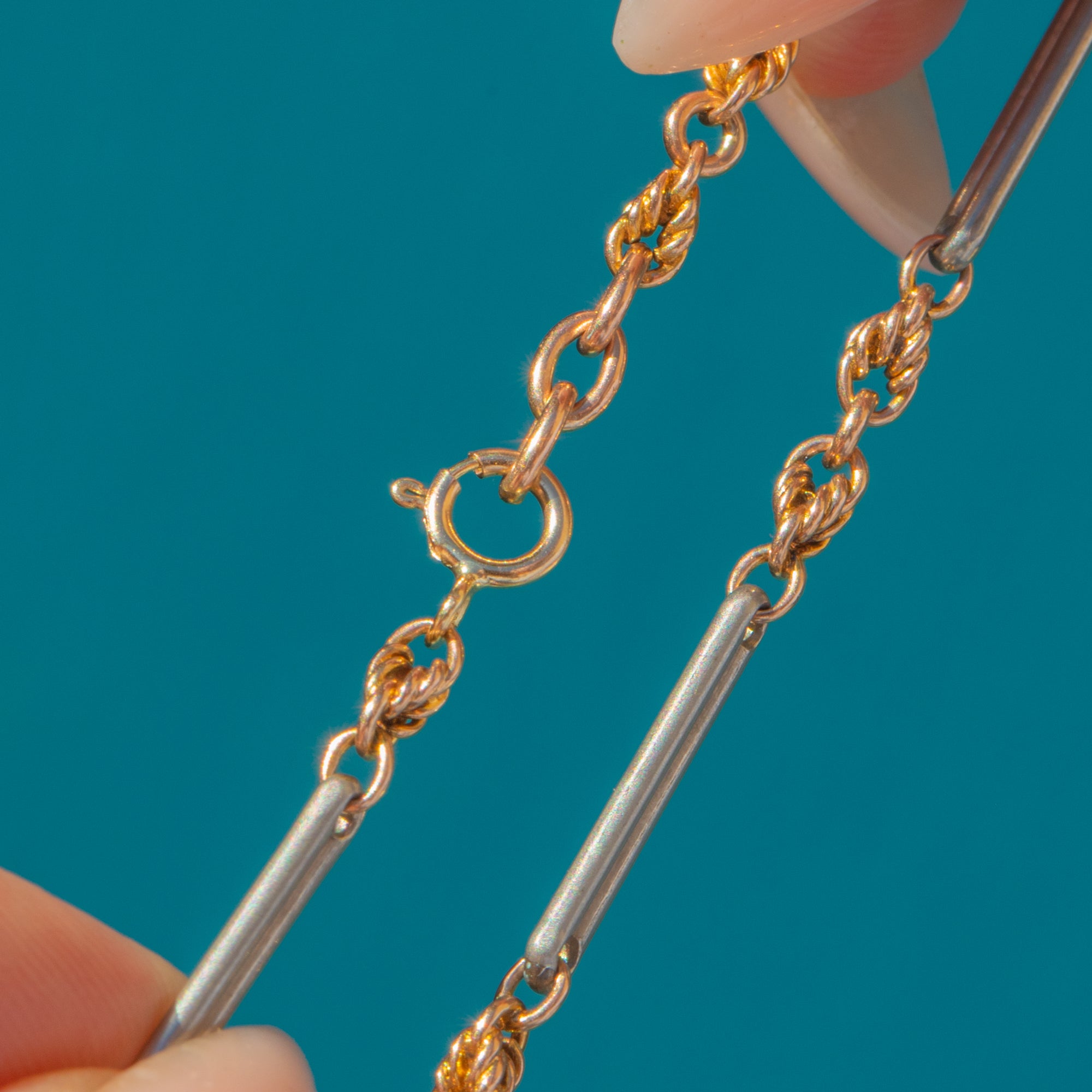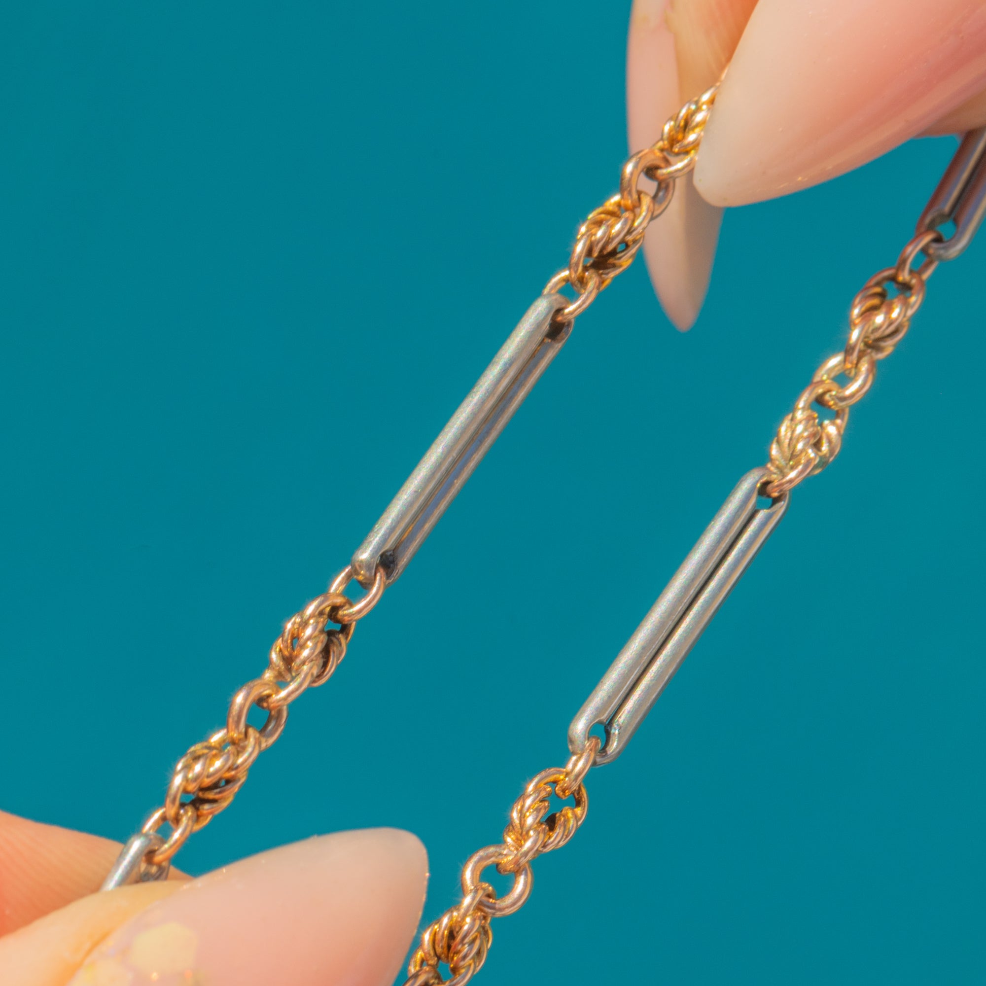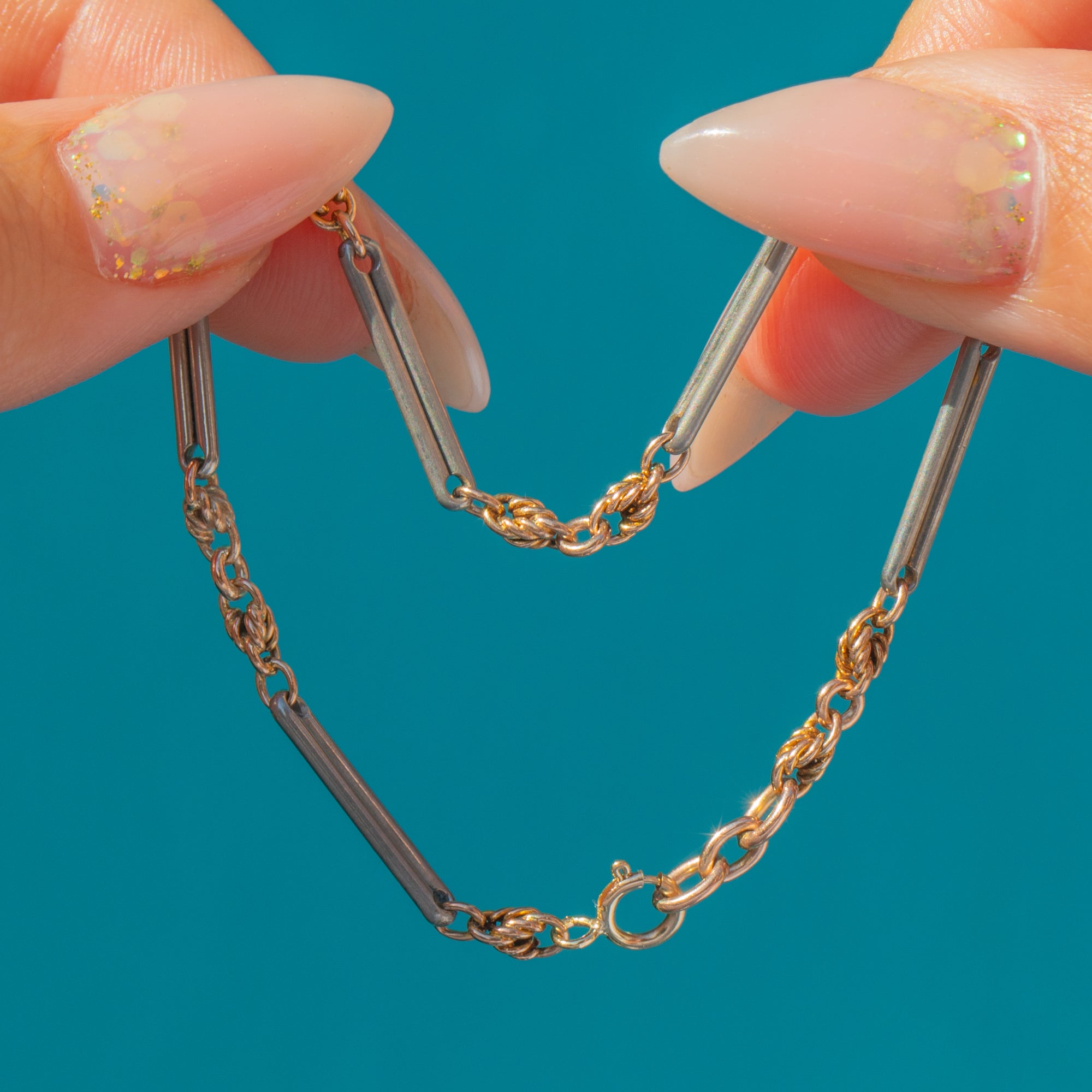 This antique bracelet is a wonderful example of Victorian design, crafted with alternating 9ct Gold lover’s knot links and Sterling Silver trombone links. The combination of warm Gold with the cool tones of Silver creates a striking two-tone effect, giving the piece character and versatility for everyday wear.