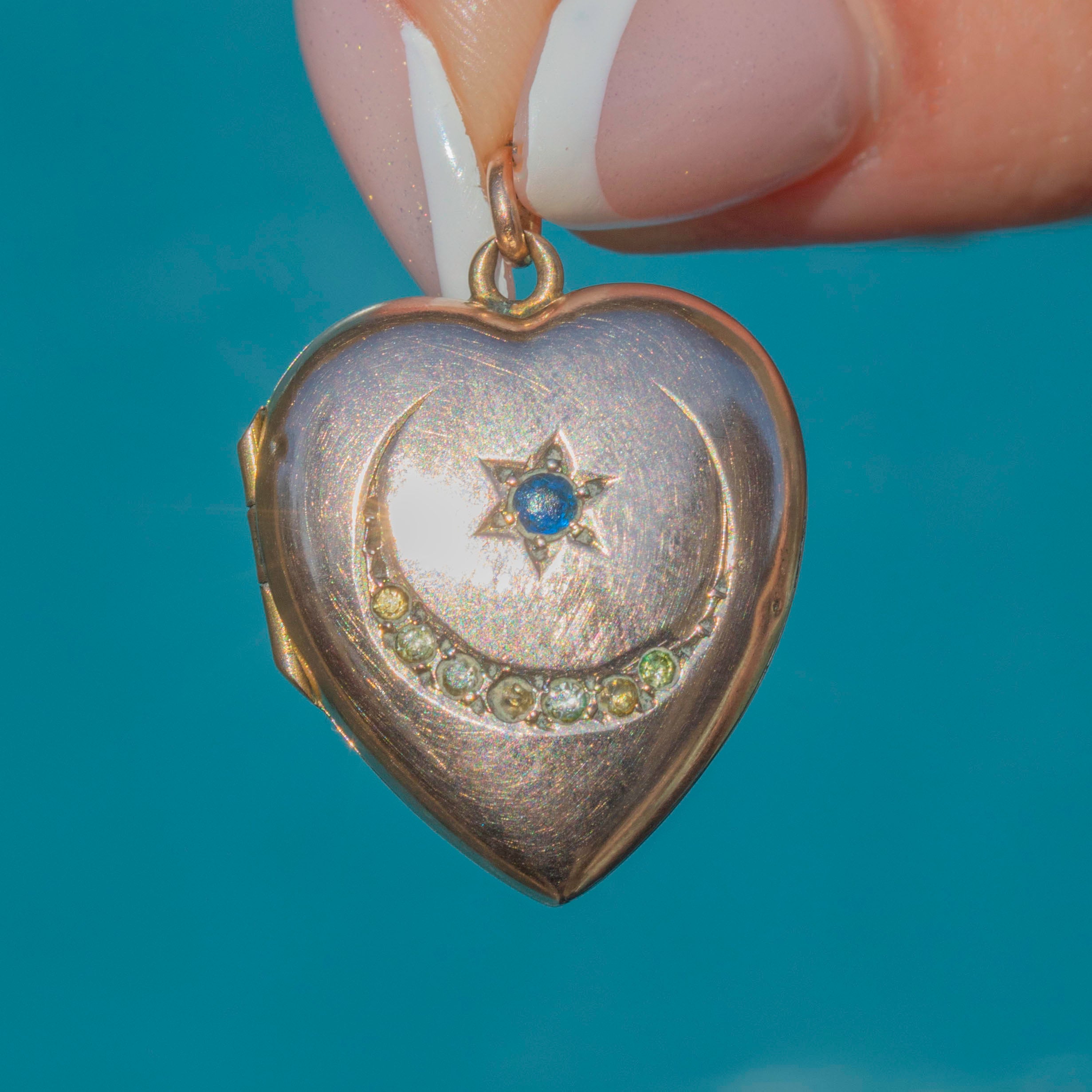 Antique 9ct Gold Moon & Stars Blue Paste Heart Locket