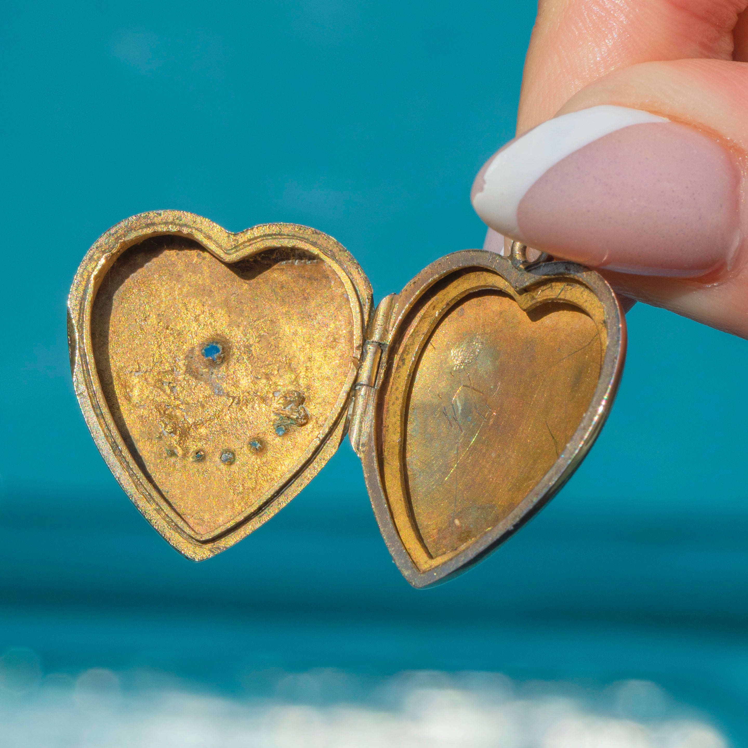 GOOD. This antique 9ct Gold moon & stars blue Paste heart locket is in good condition. The locket has kept its shape well, and the motif on the front has remained intact with all Paste gems accounted for. There is one ding noticeable as you open the locket, near the lip, but looking front on this isn't obvious. The inside of the locket has some surface wear to note, commensurate with age, but this can be concealed with your photos. There is some wear to the hasp, from where it has so lovingly been worn throughout the years, but you can wear this piece with your favourite chain for years more!