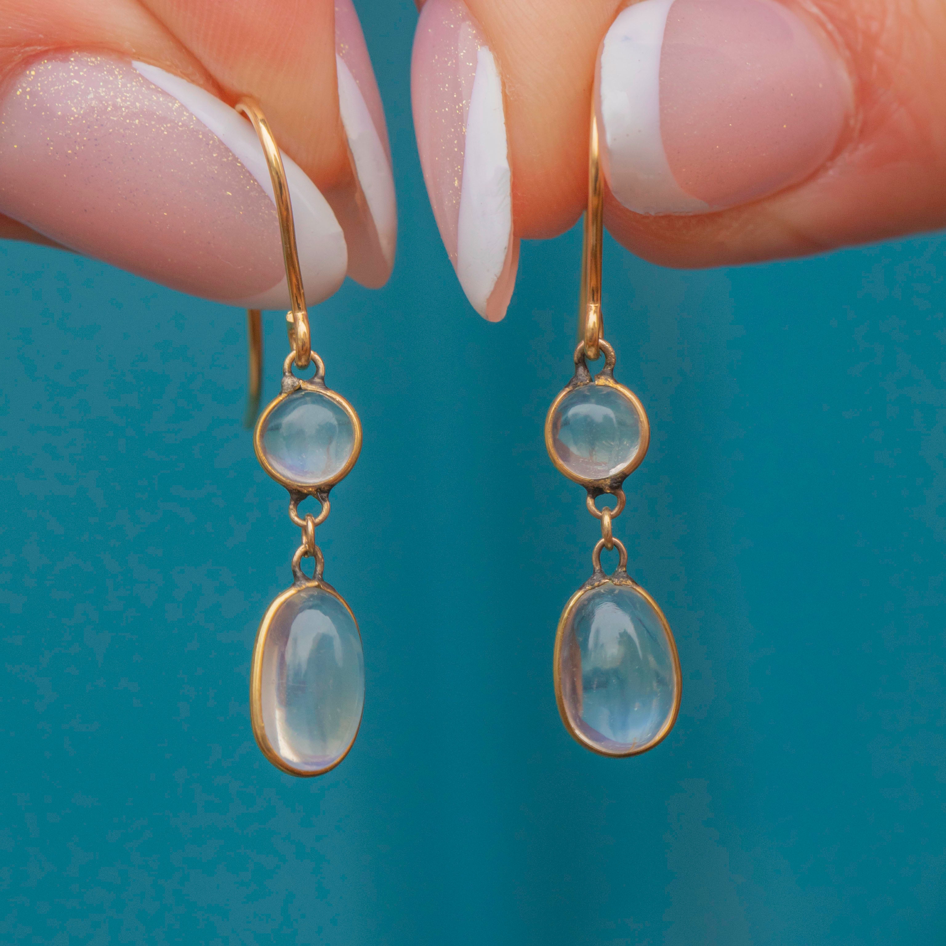 This enchanting pair of antique 9ct Gold Moonstone drop earrings will become your go-to pair in the upcoming summer months! Each lovely drop boasts two smooth Moonstone cabochons set in 9ct Gold bezels, graduating in size with a gentle curve - totalling 2.00 carats.