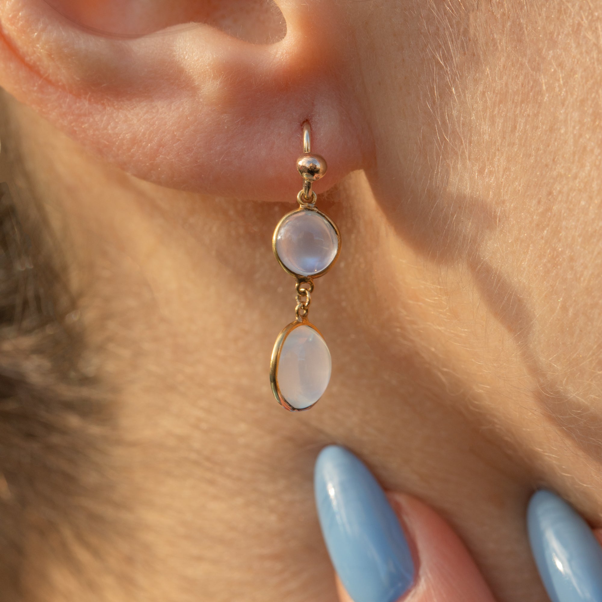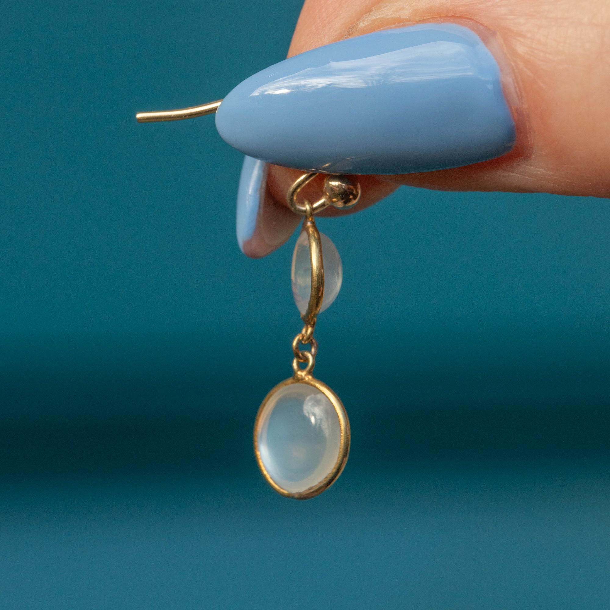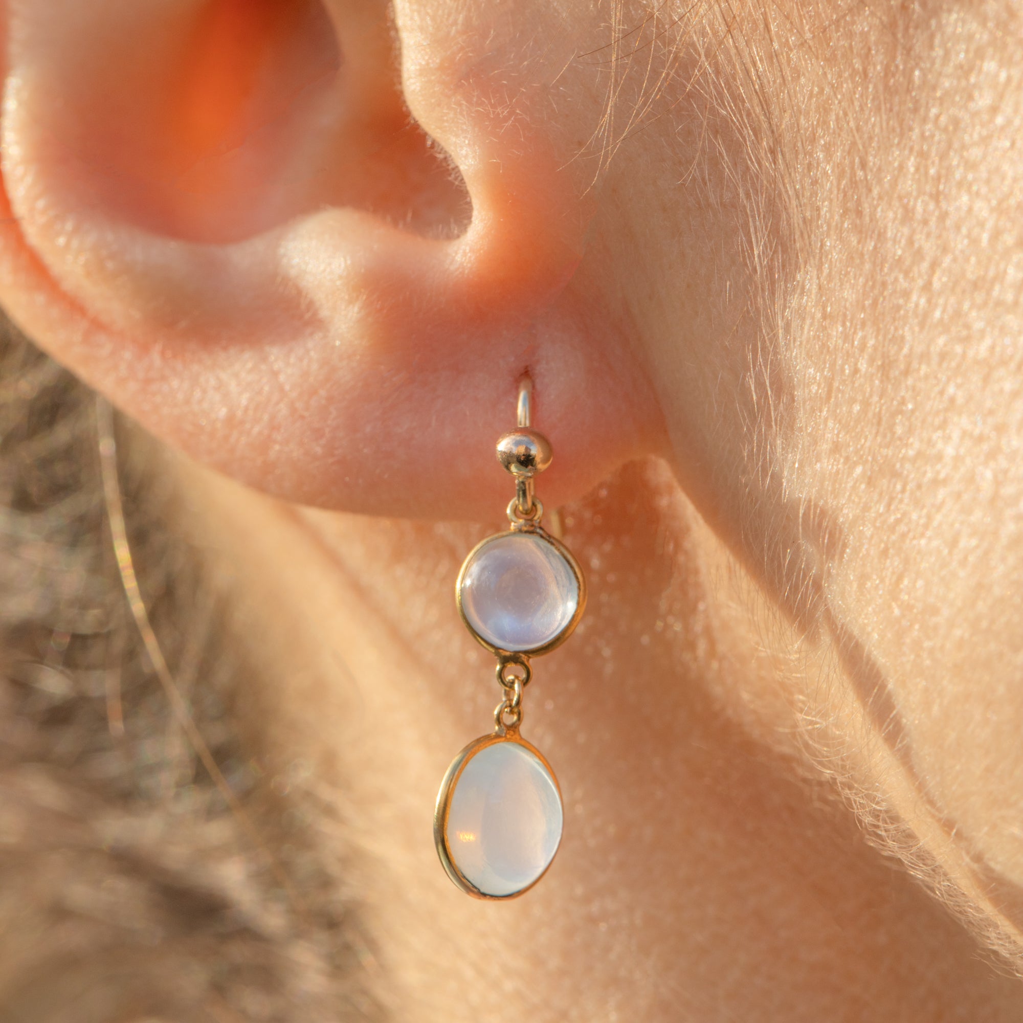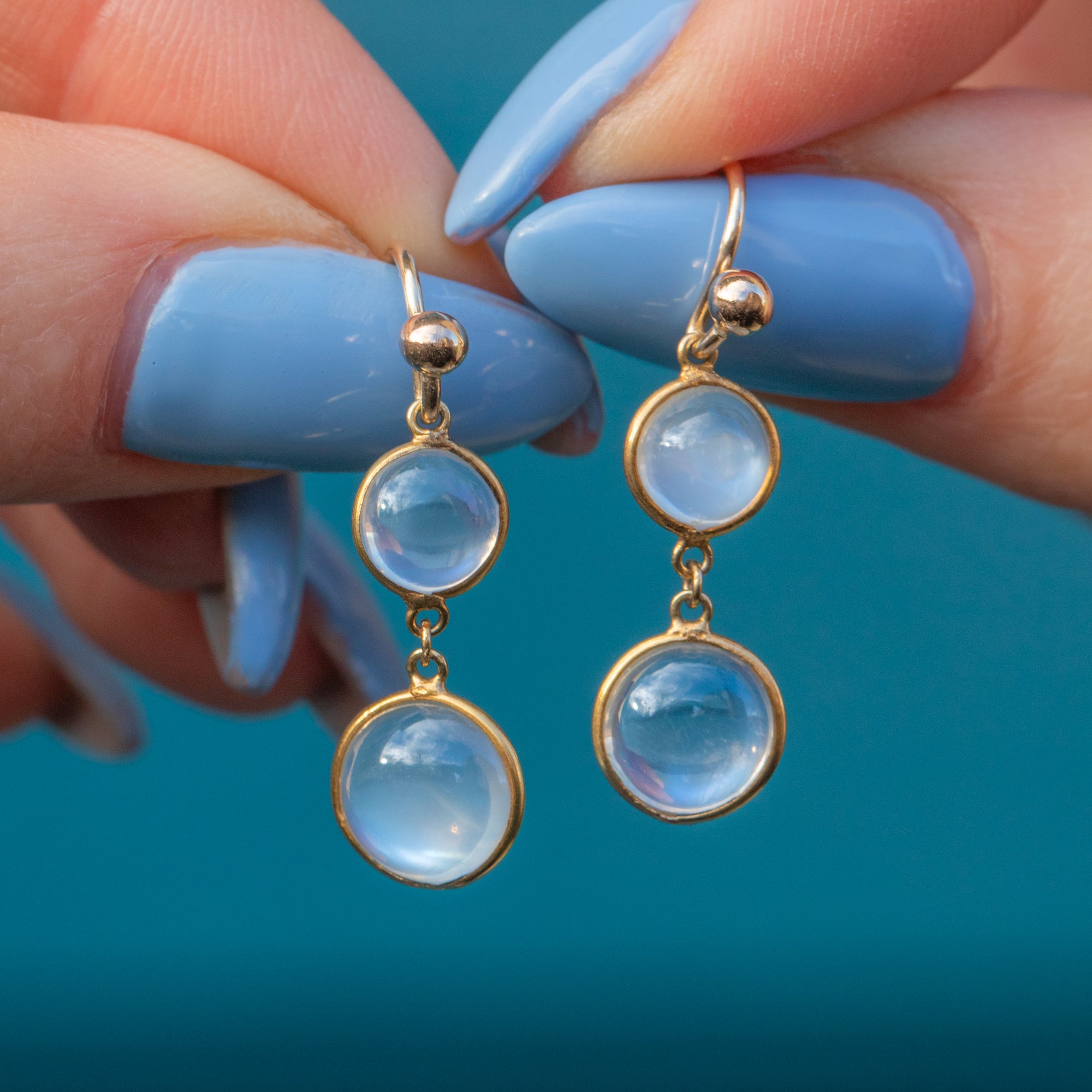 These antique 9ct Gold Moonstone drop earrings will add a touch of elegance to your outfit! Each plump Moonstone cabochon possesses that silvery-blue adularescence for which antique Moonstone is so revered, and will provide your lobes with an ethereal allure.