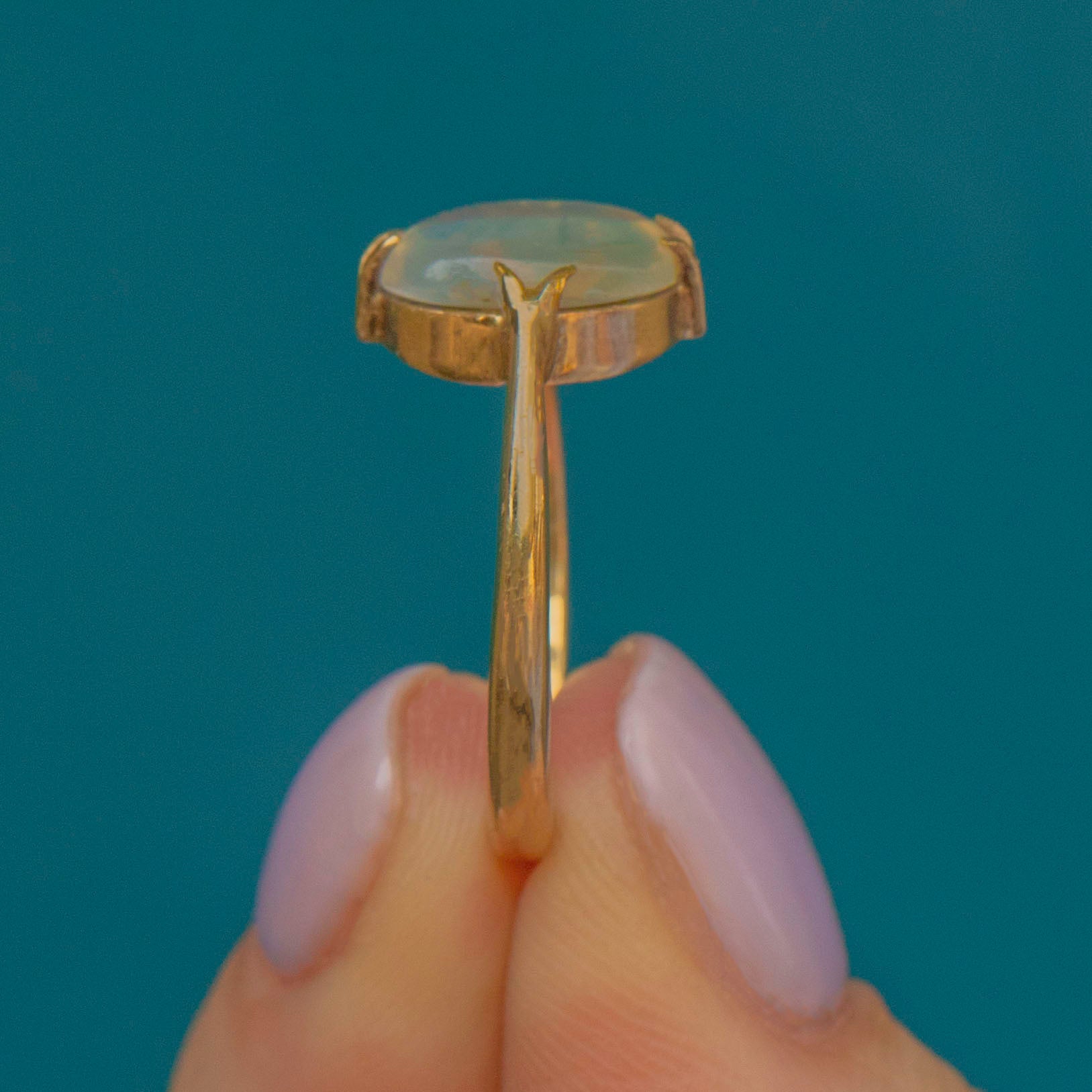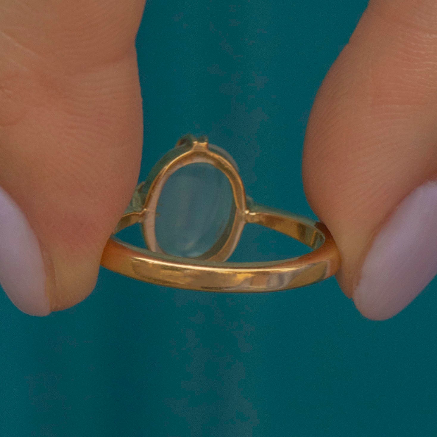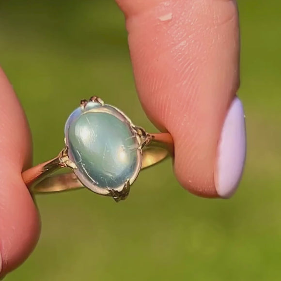 A mystical antique 9ct Gold Moonstone solitaire ring for your repertoire! You will immediately become transfixed by the blue schiller that billows across her smooth 1.15ct Moonstone cabochon, glowing as she adorns your hand.