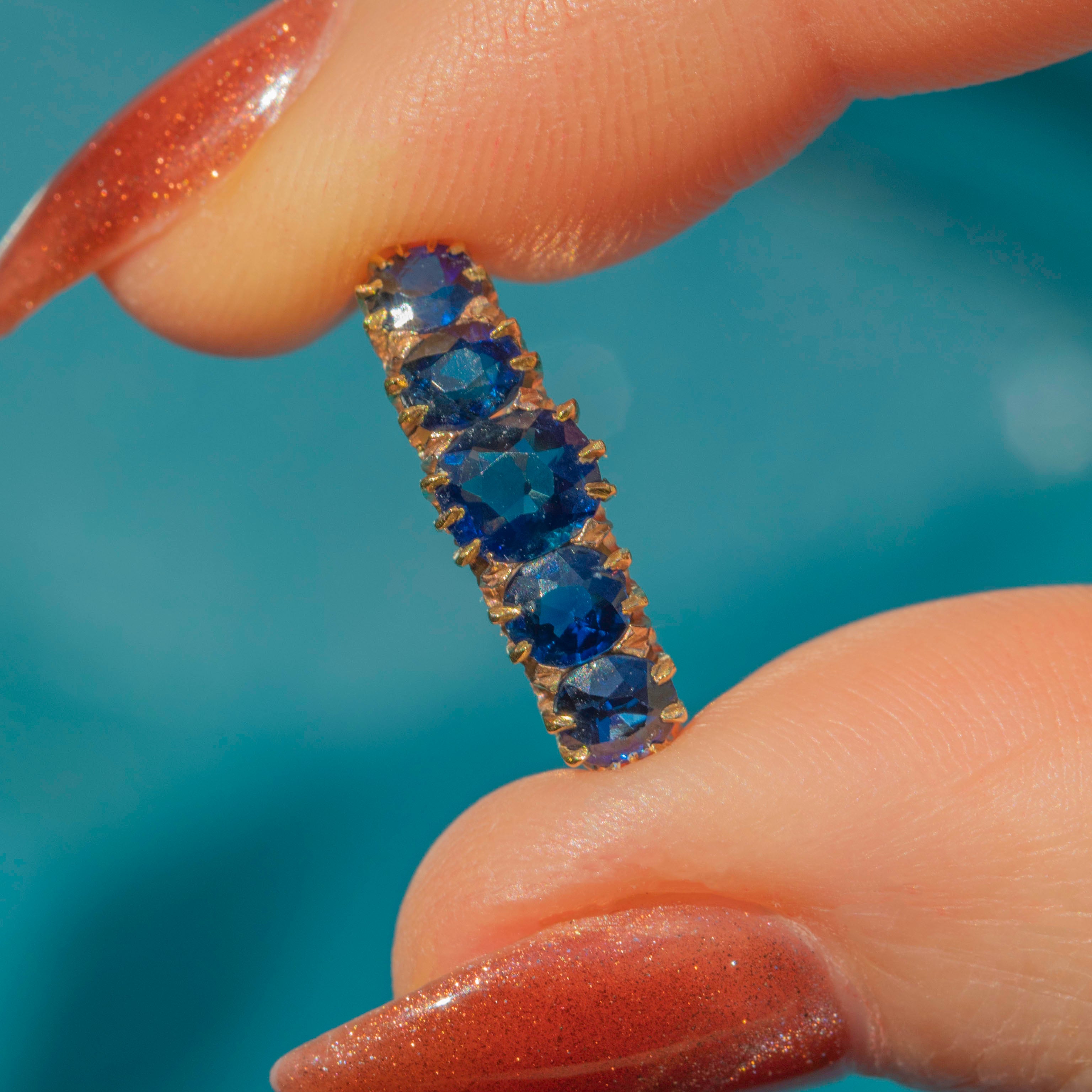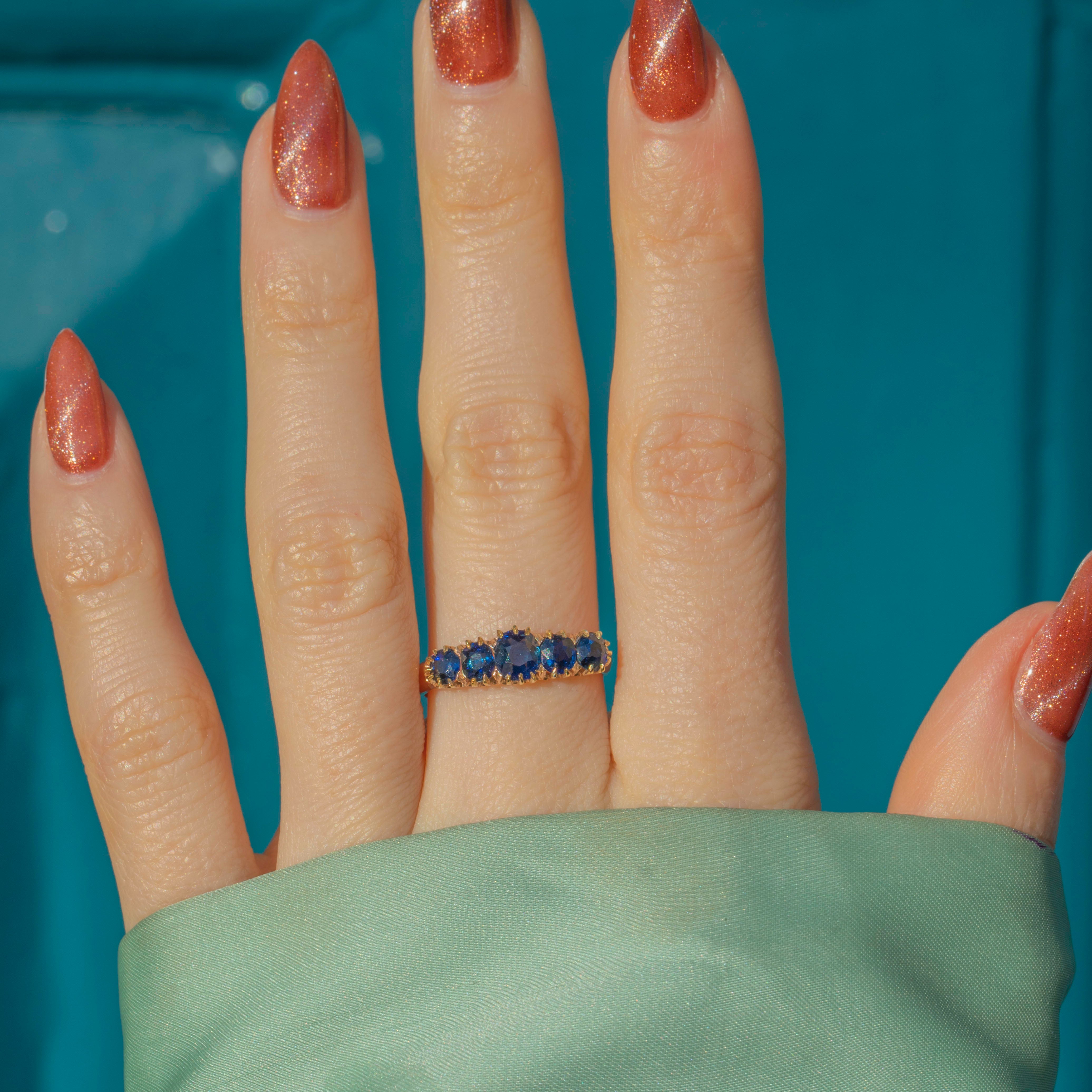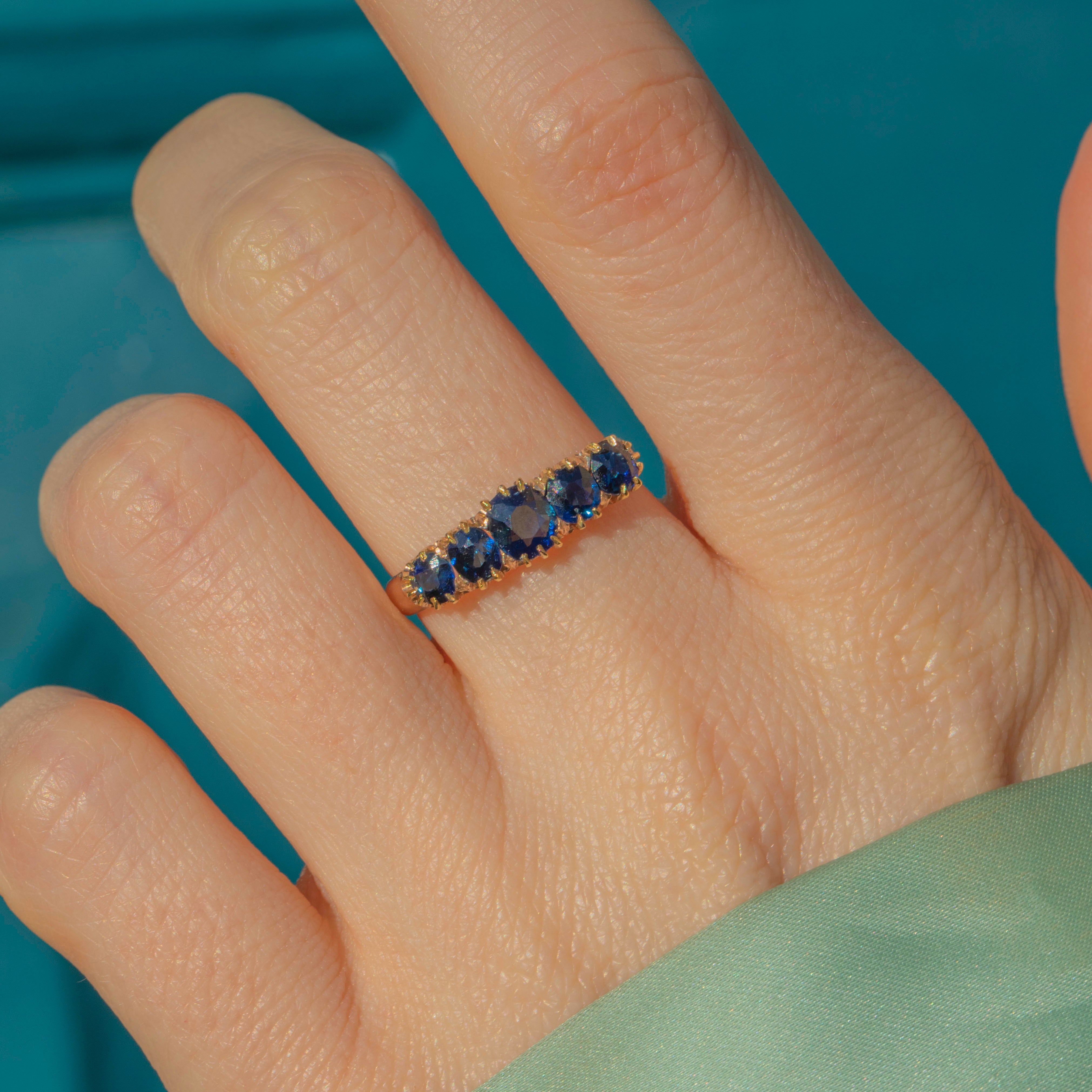 The five graduating natural Sapphires will spread across the width of your finger, with each Sapphire faceted wonderfully to catch the light, revealing gorgeous cerulean hues.