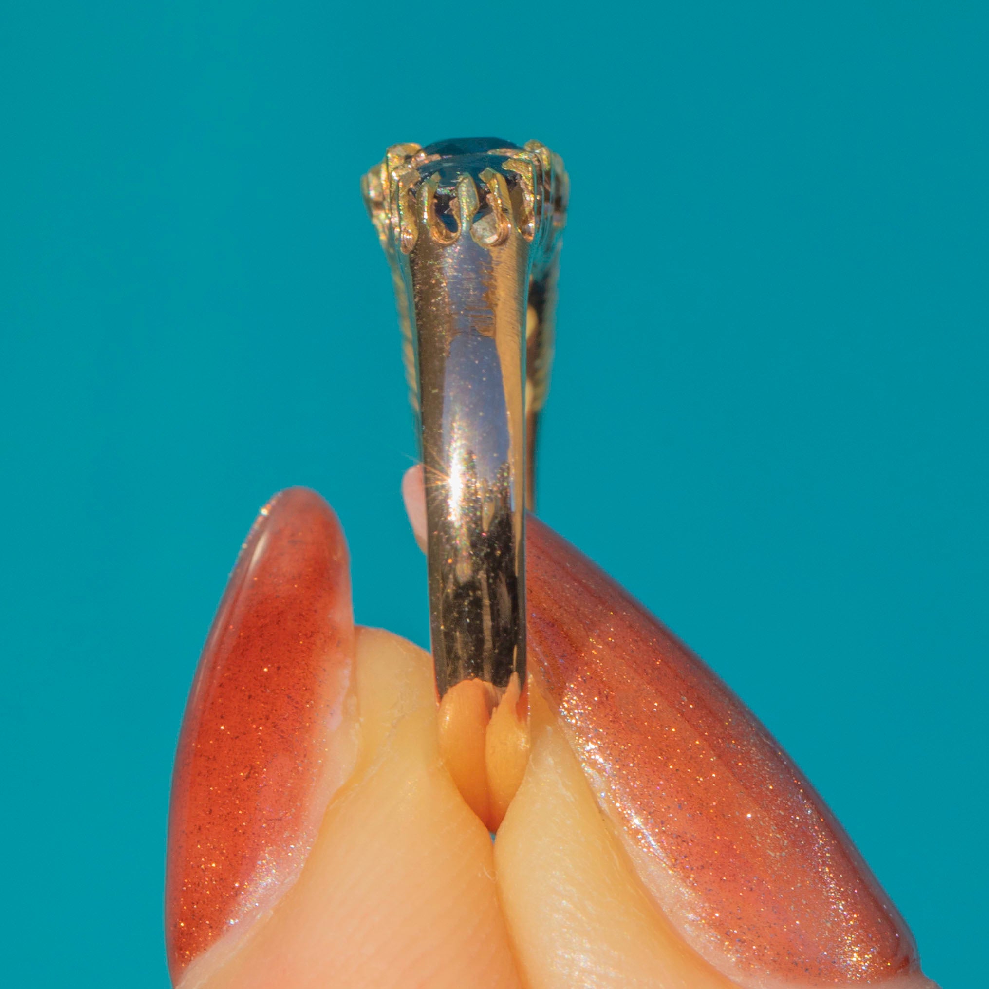 They sit within warm, rosy-hued 9ct Gold claw settings, creating an elegant gallery as she rests on your finger. Perfect for everyday wear, this Victorian Sapphire ring would make a lovely choice for a unique engagement ring!
